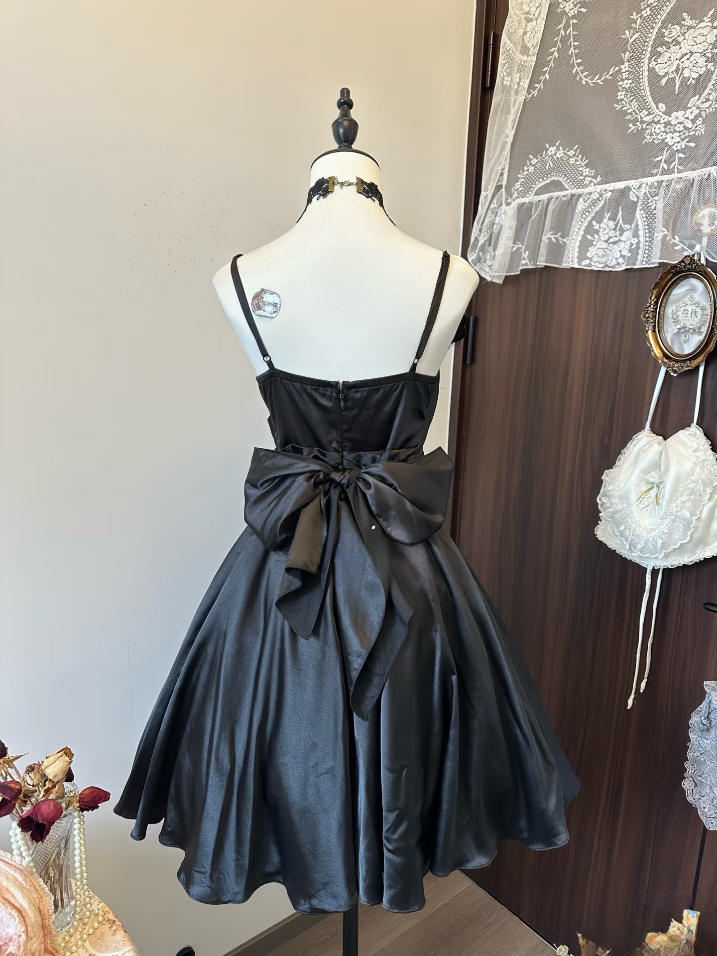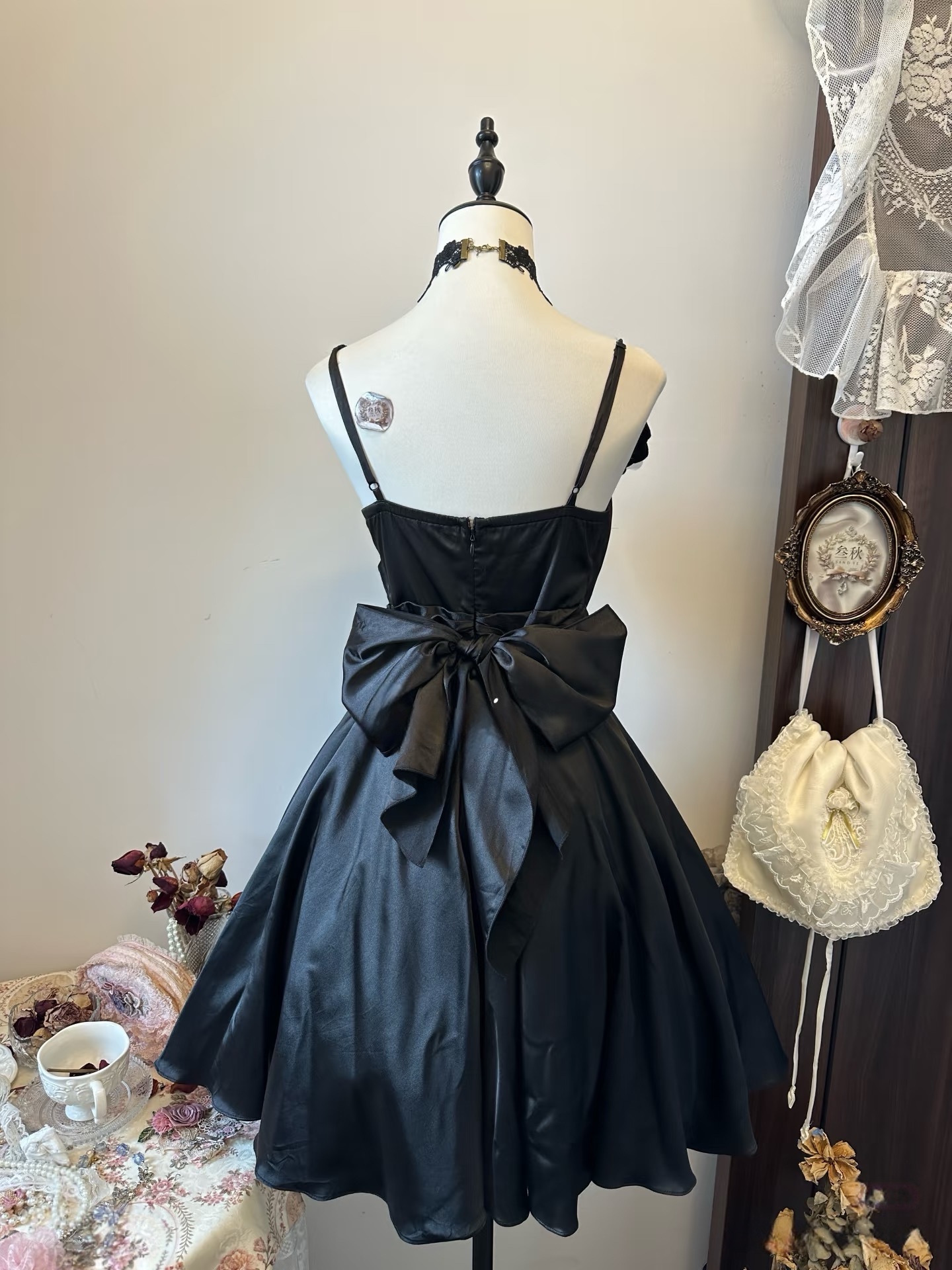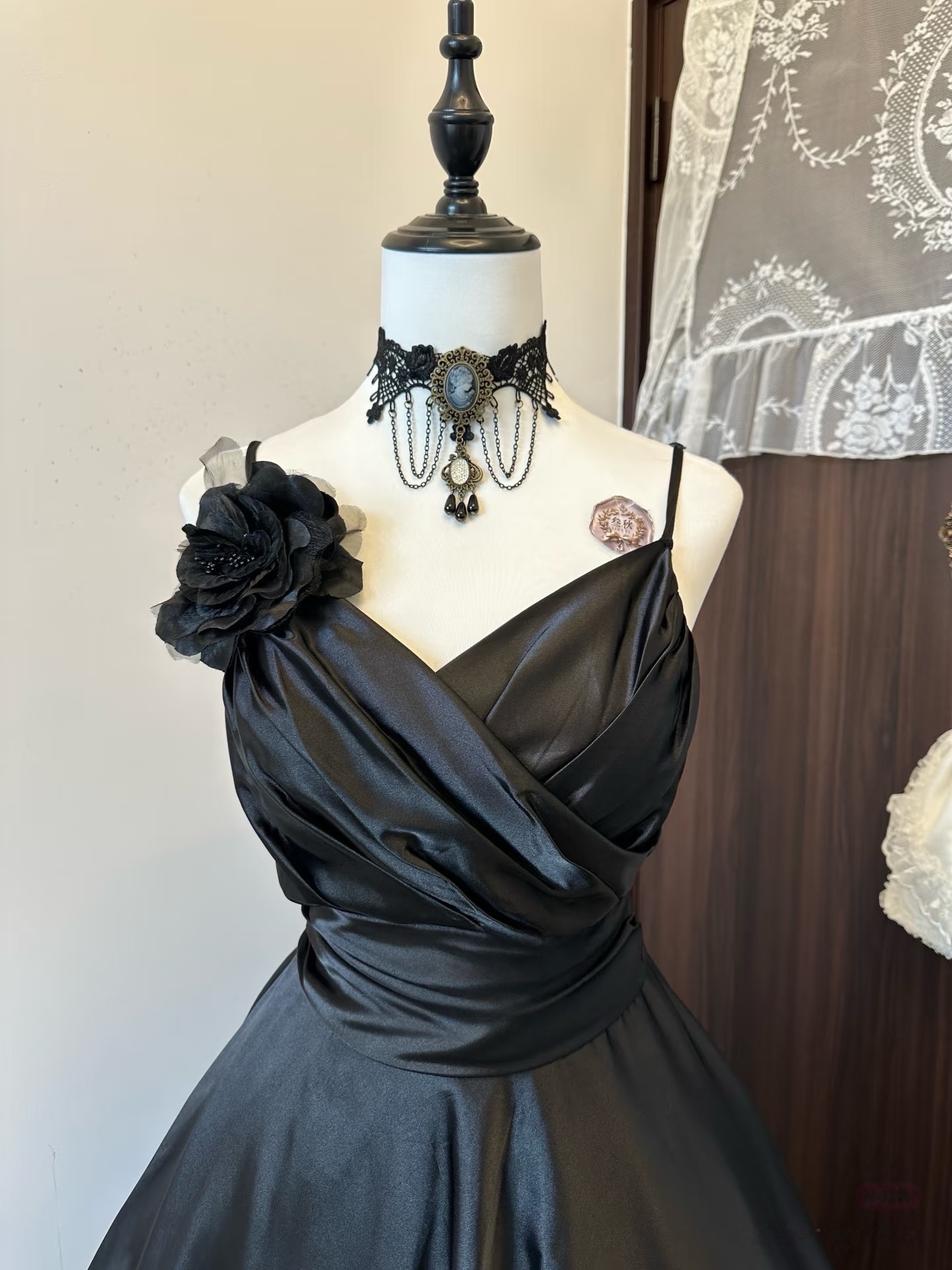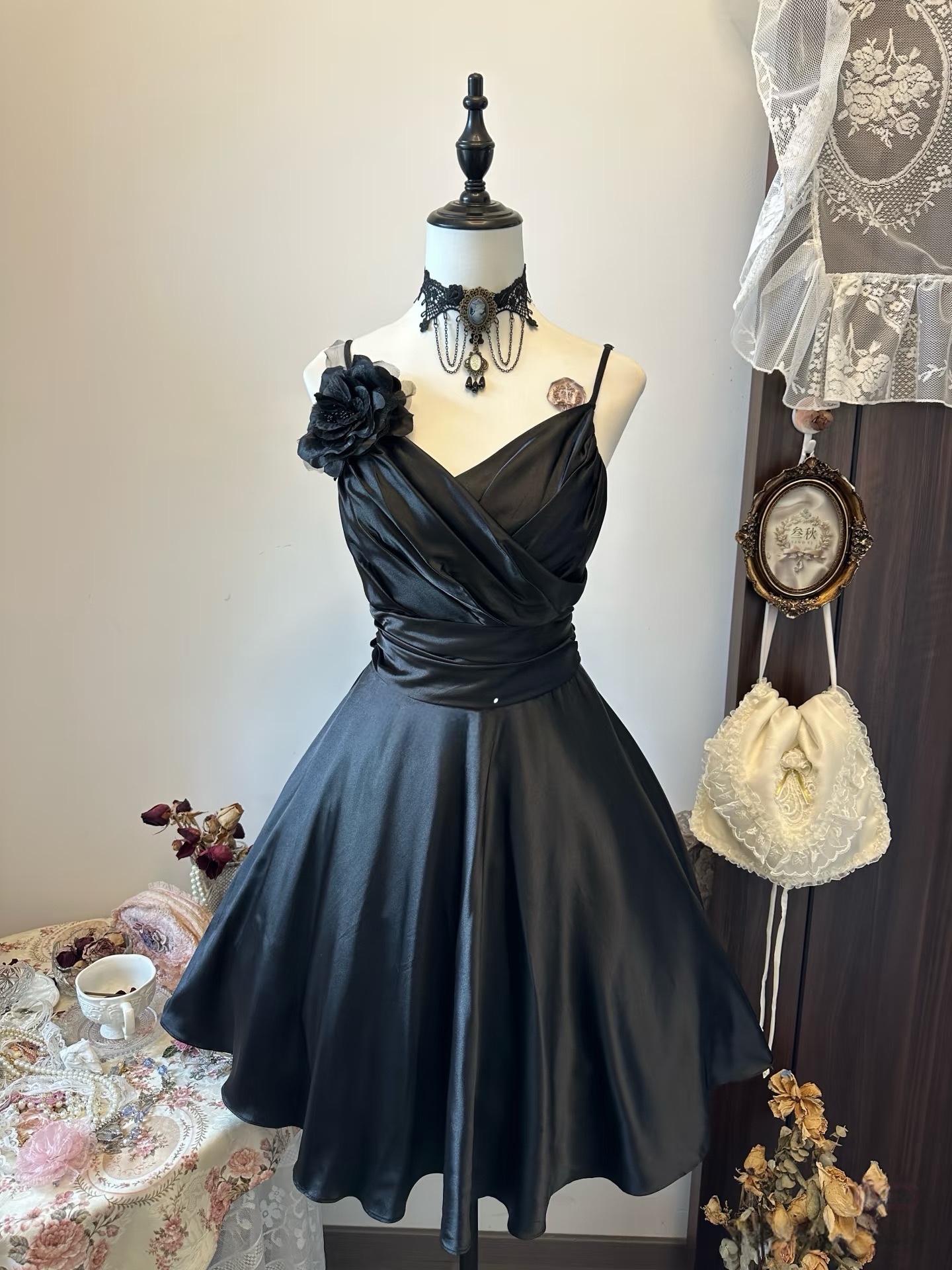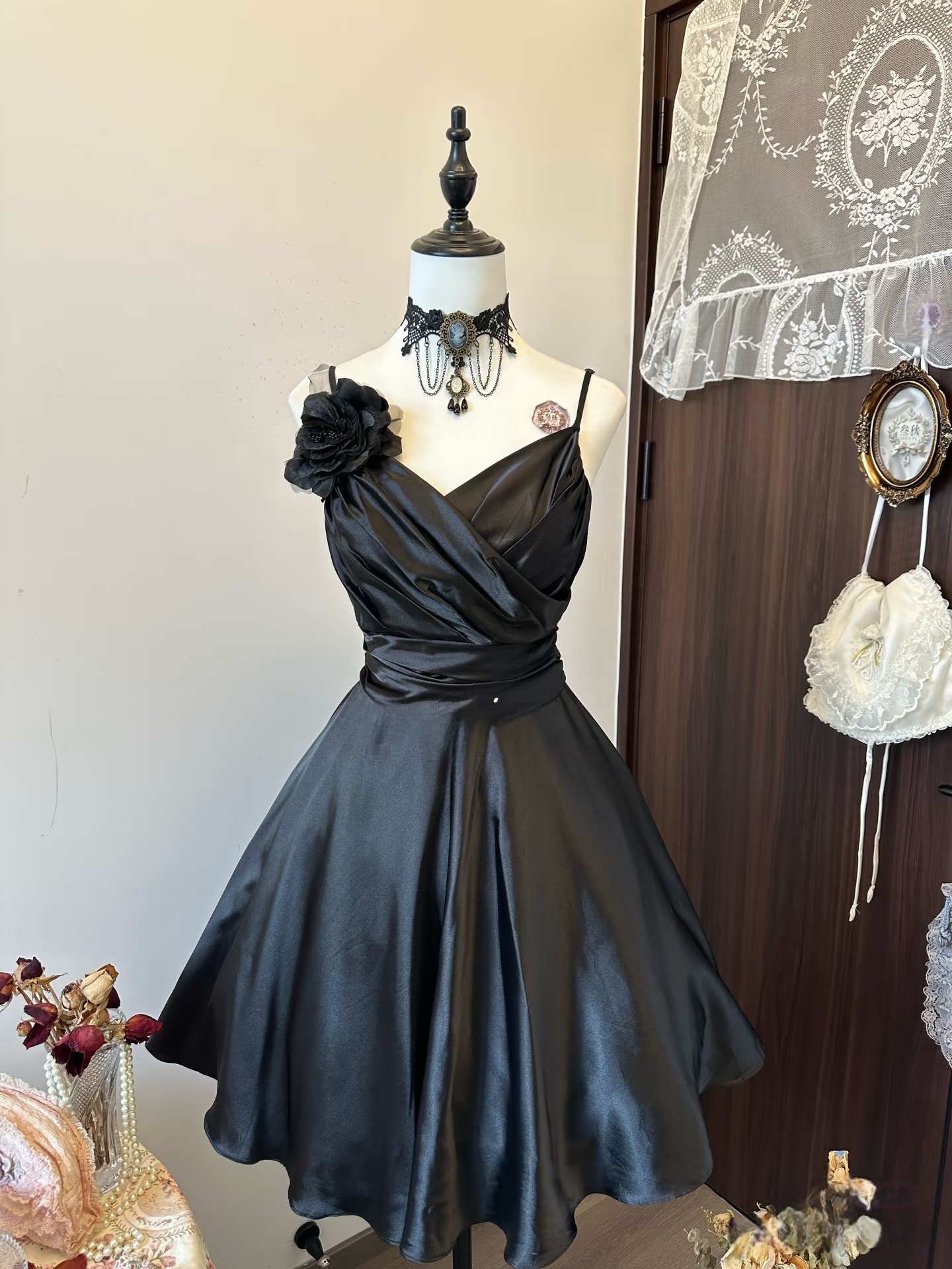 Black V-neck Sleeveless A-line Knee Length Dress with Handmade Flower Prom Dress