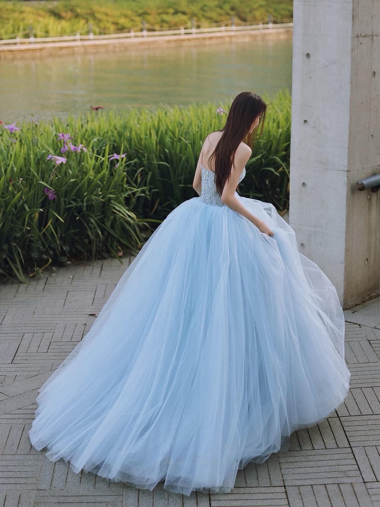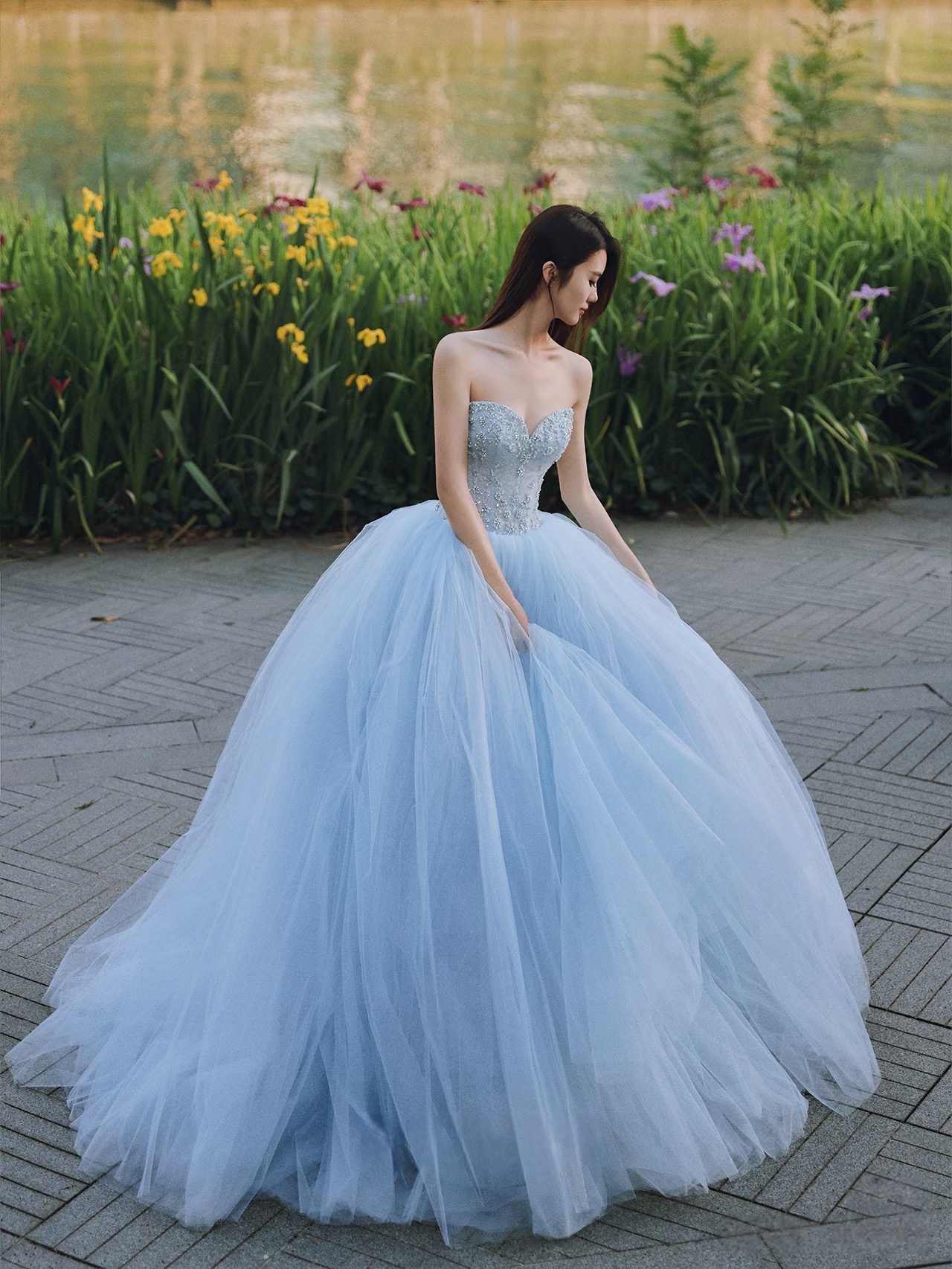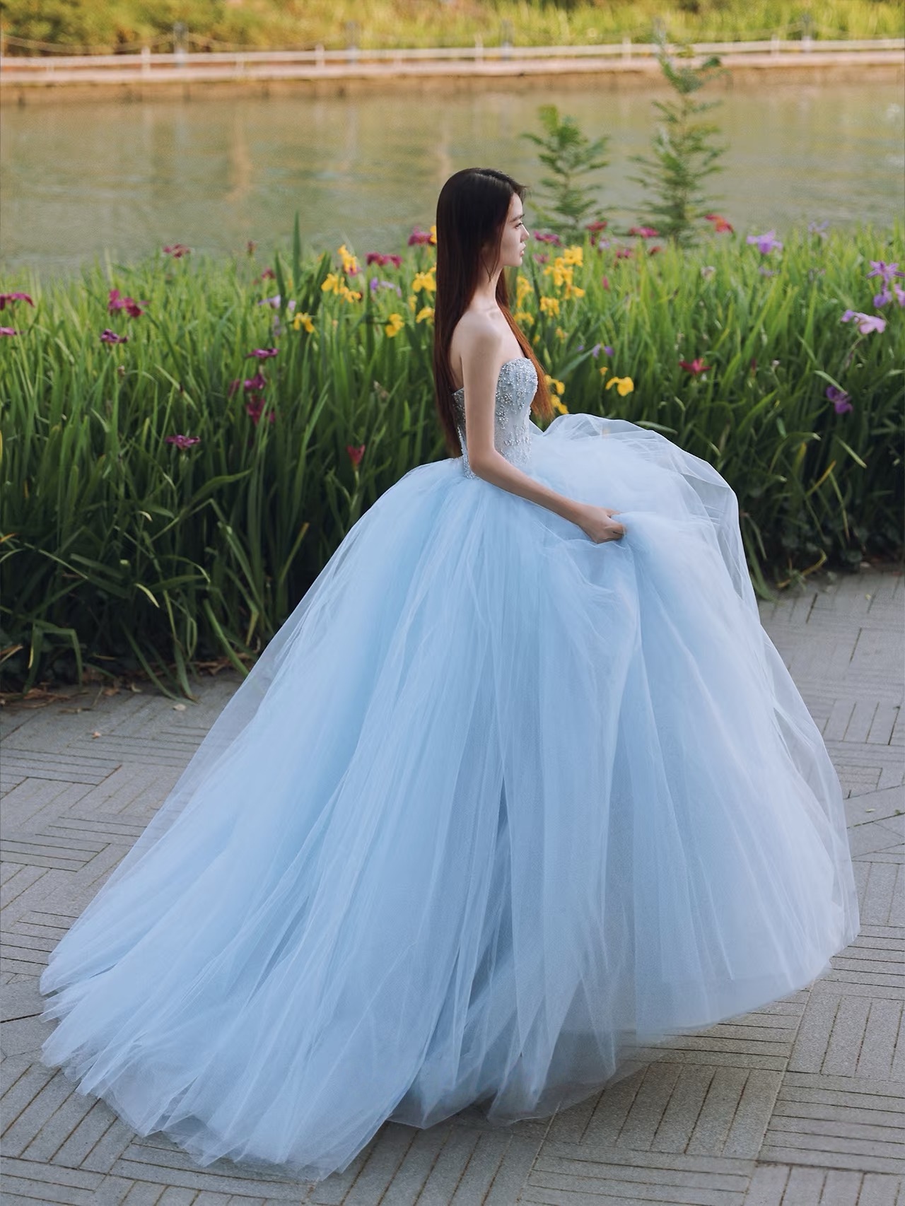 Blue Ball Gown Prom Dress, Strapless Beaded Corset Evening Gown, Tulle Quinceañera Dress, Luxury Gala Dress