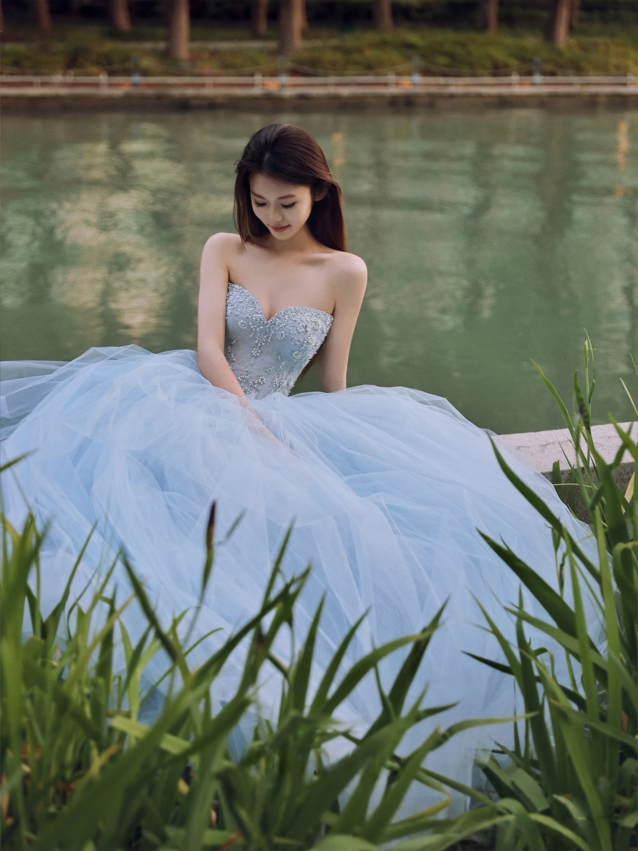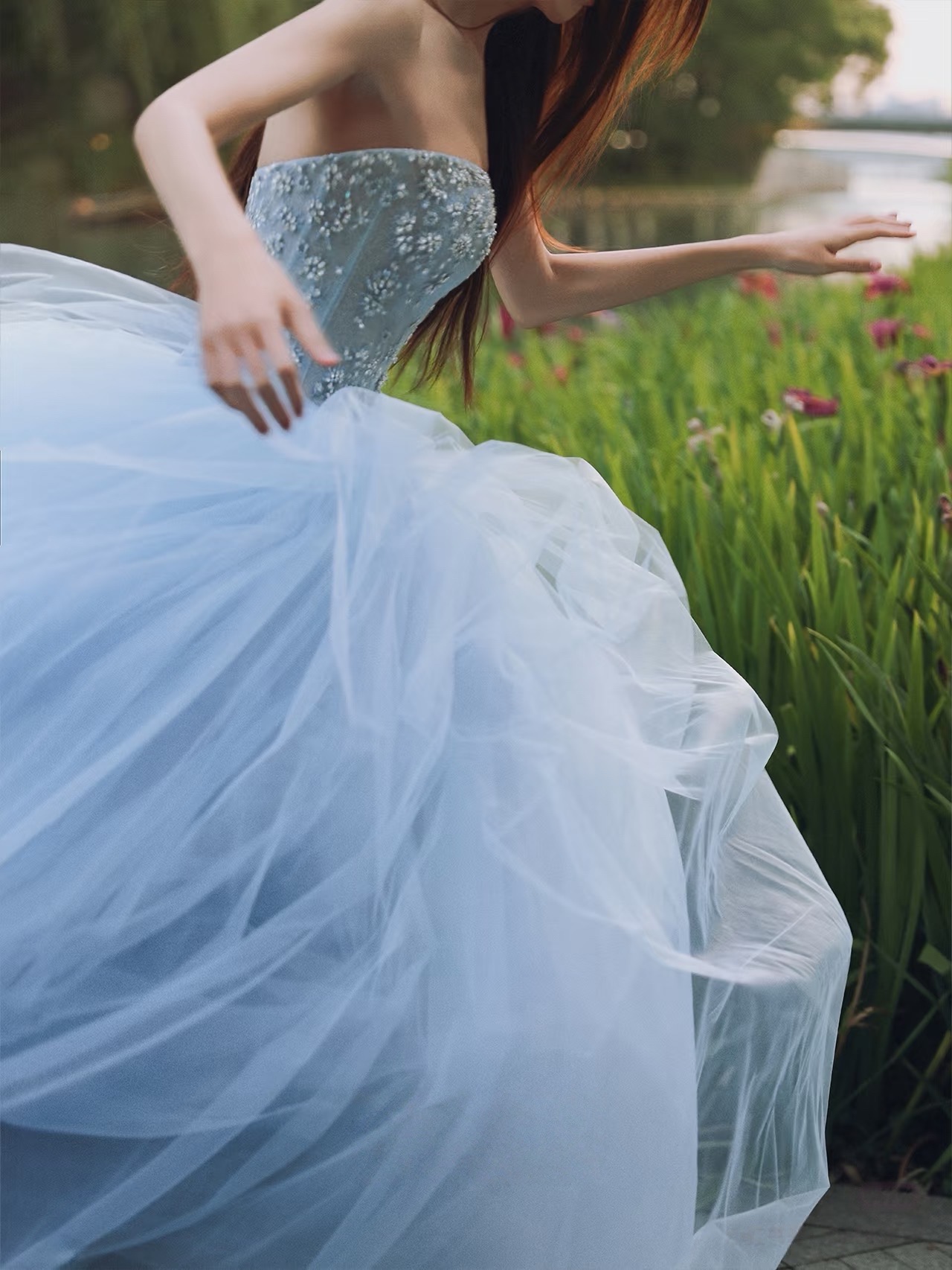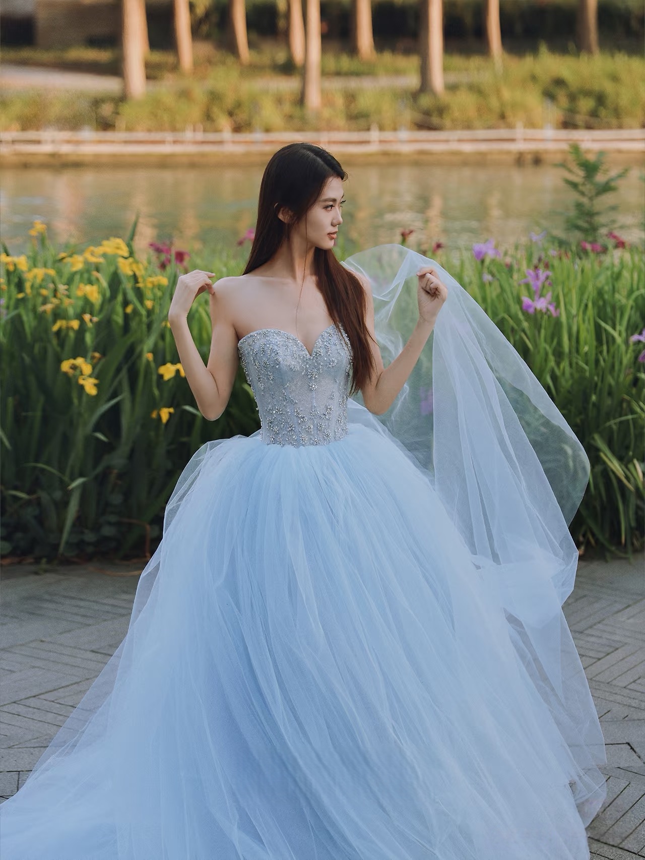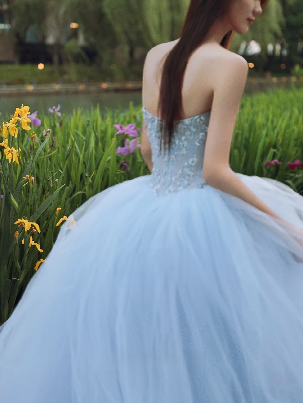 Blue Ball Gown Prom Dress, Strapless Beaded Corset Evening Gown, Tulle Quinceañera Dress, Luxury Gala Dress