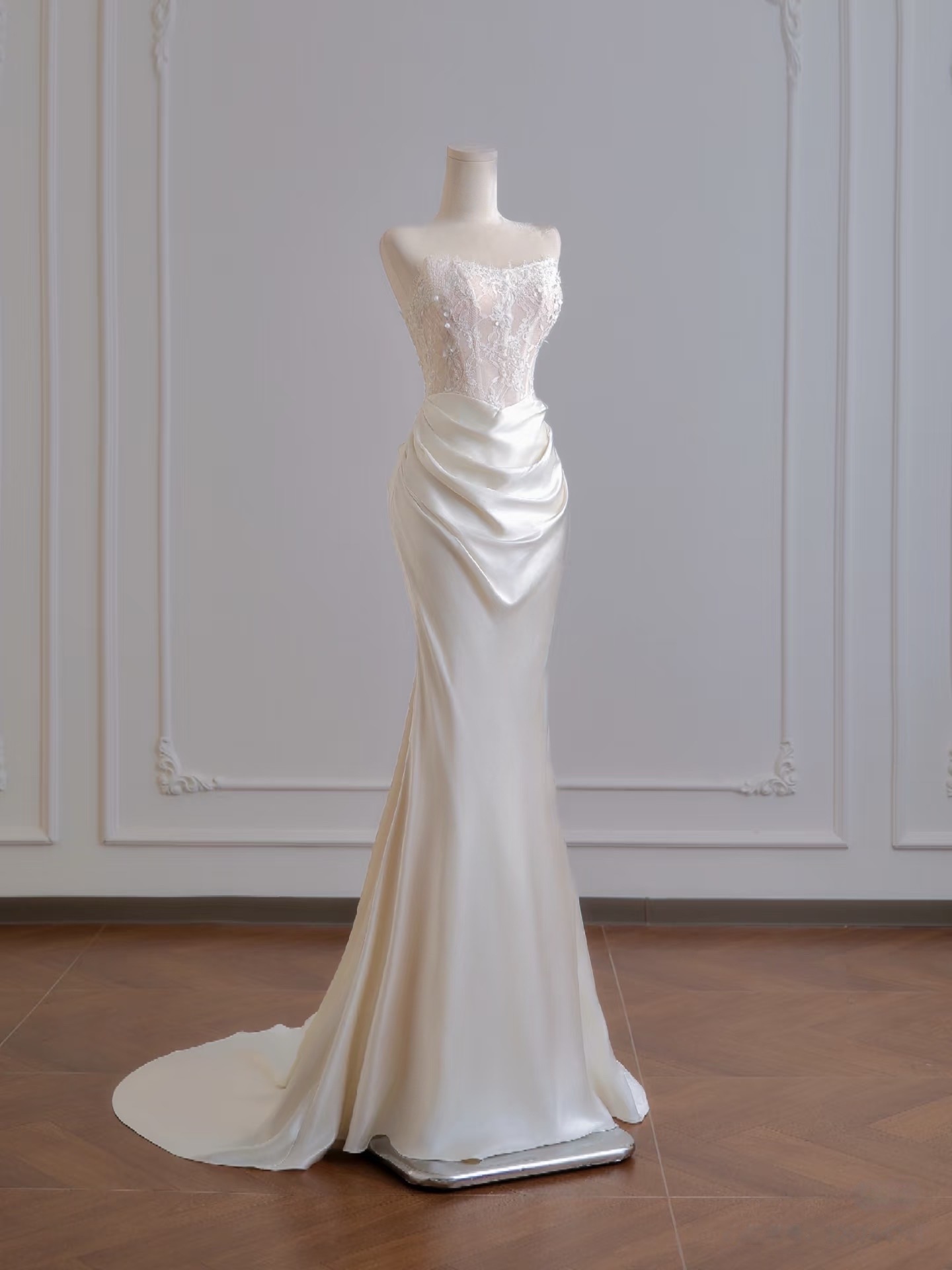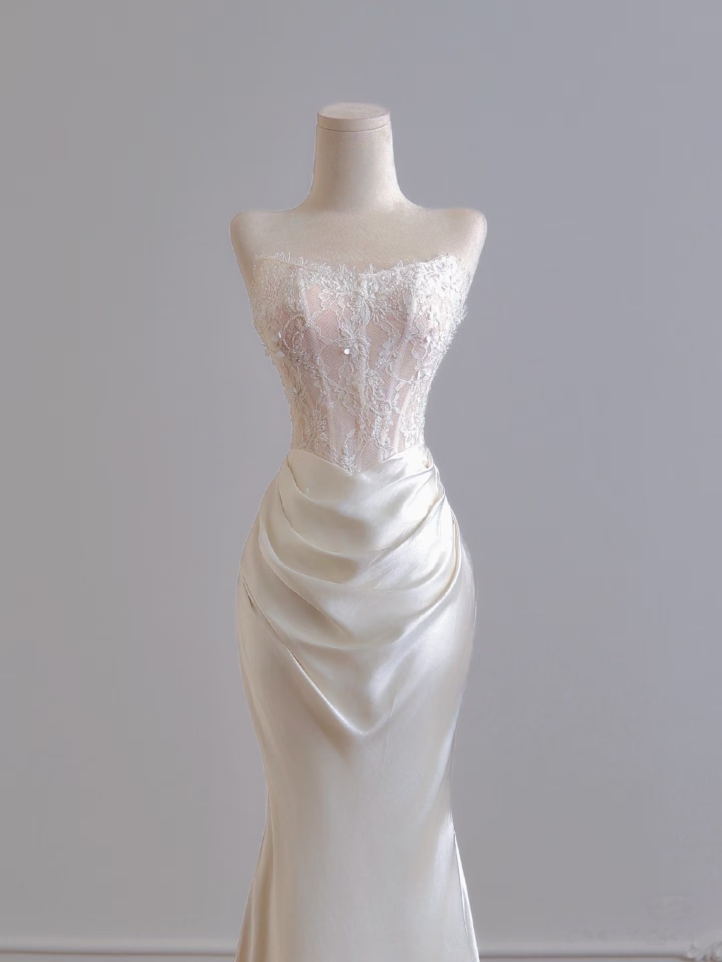 Ivory Strapless Lace Mermaid Satin Wedding Dress