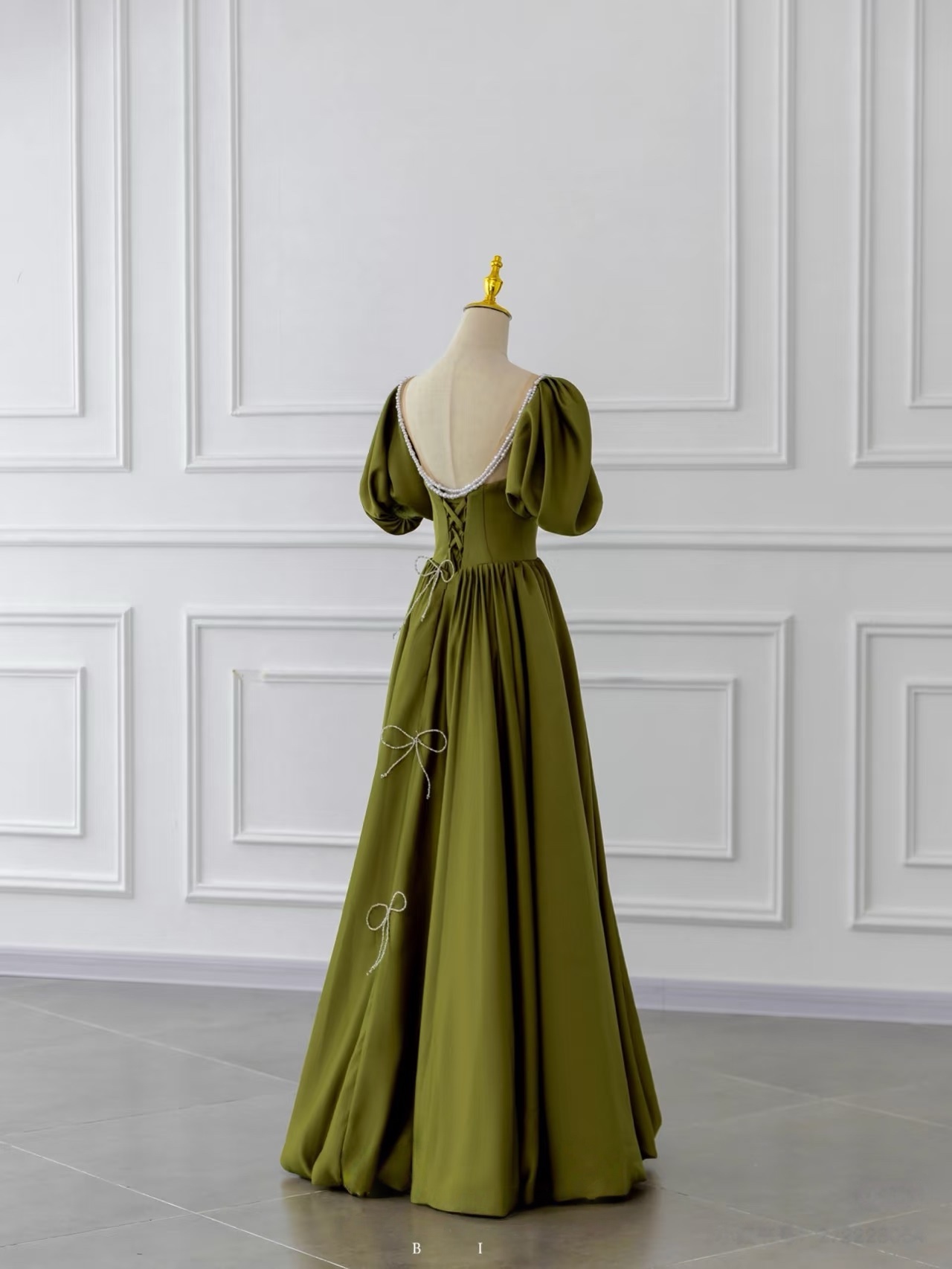 Green Short Sleeves Floor Length with Beadeing Bow Lace up Back Evevning Dresses