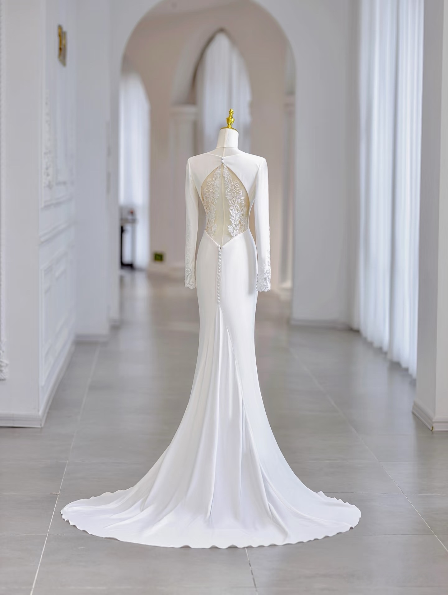 Ivory V neck Long Sleeves Sheath Backless Back Applique with Buttons Prom Dress