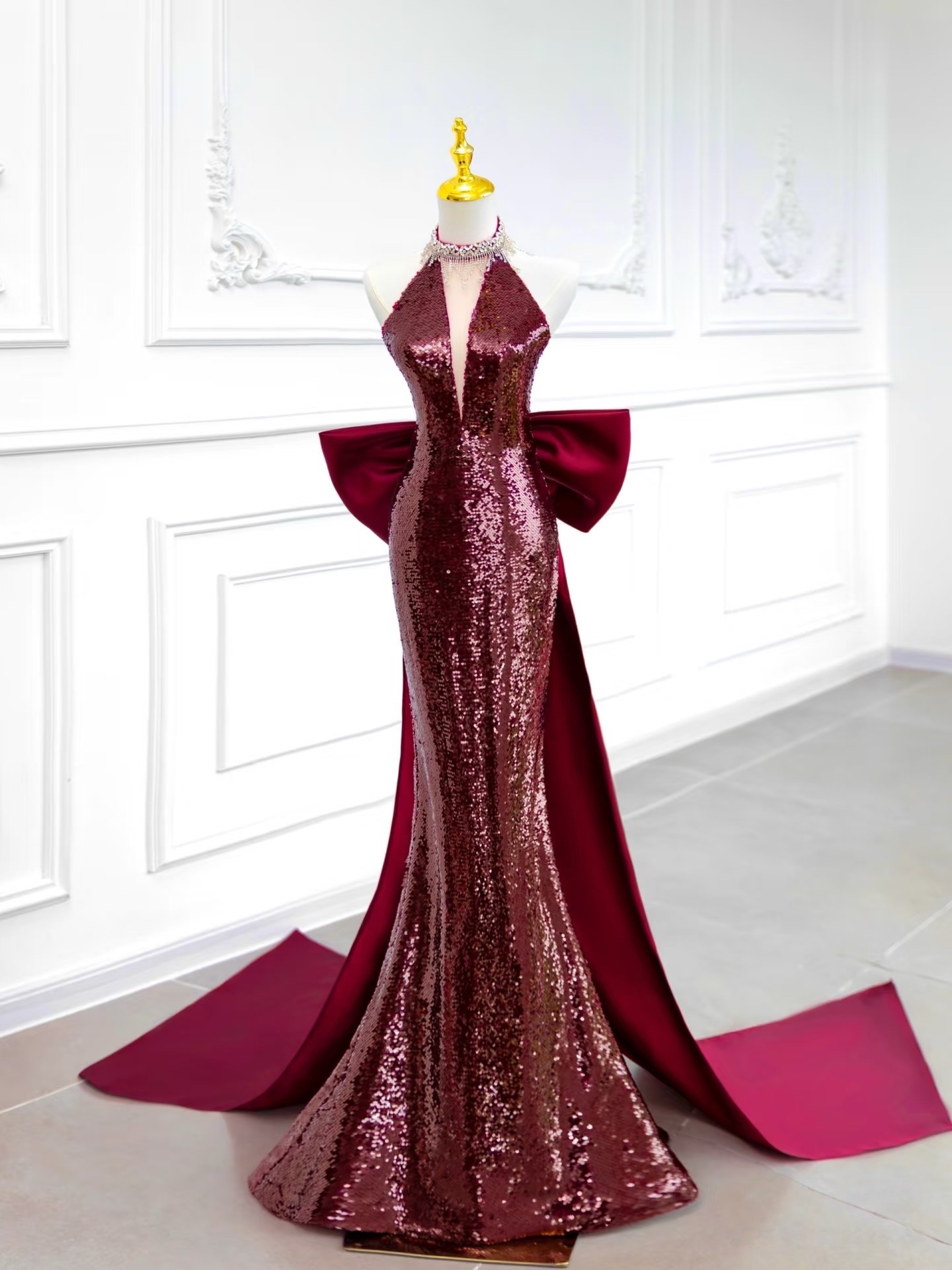 Sexy Deep V neck Mermaid Sequins Floor Length with Bow Backless Back Prom Dress