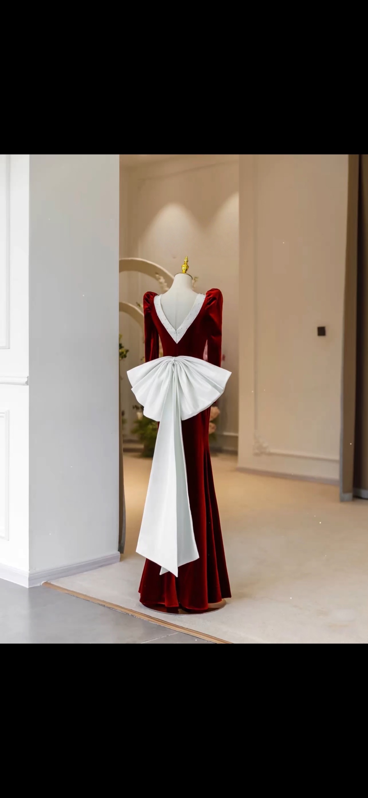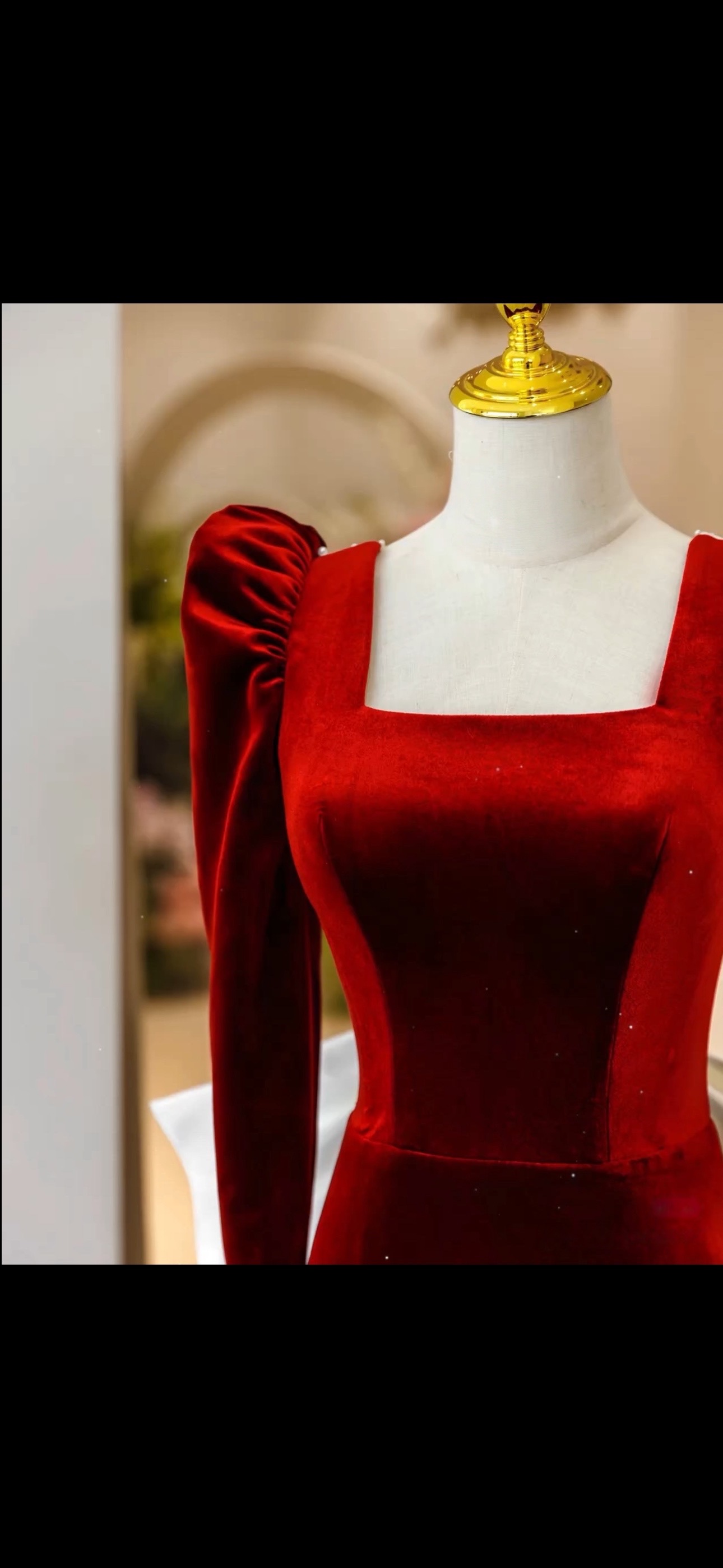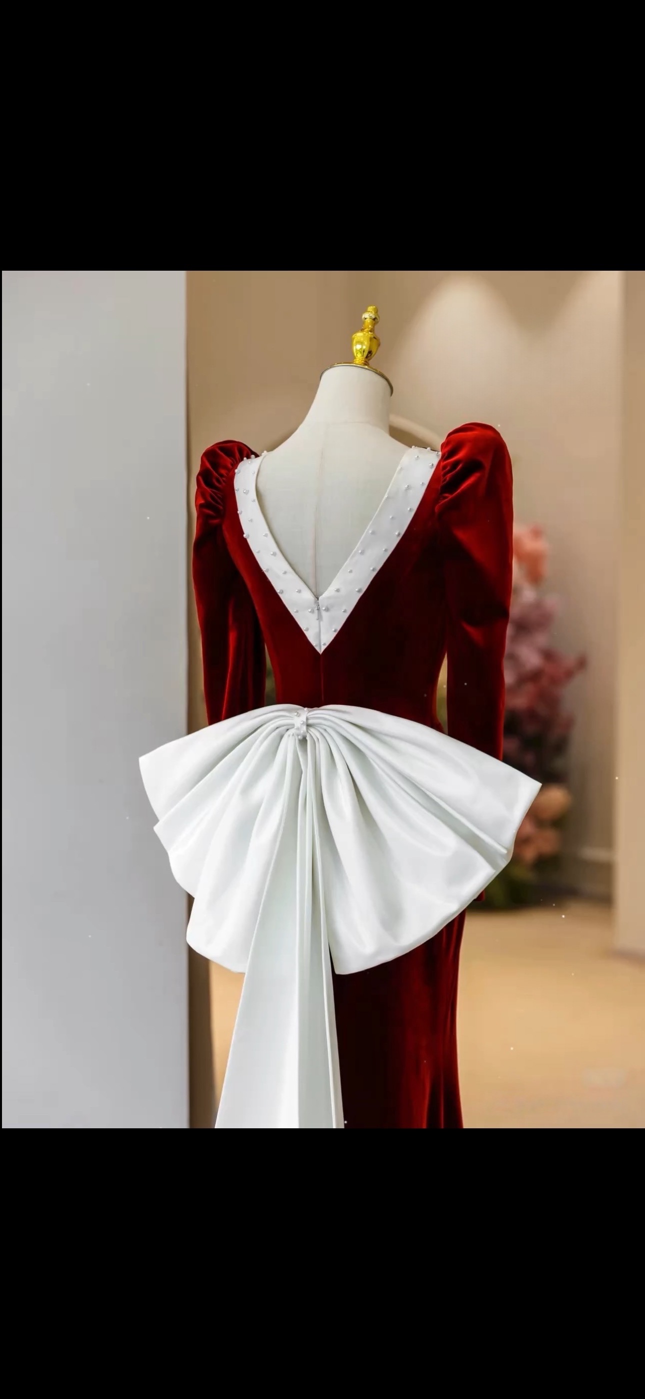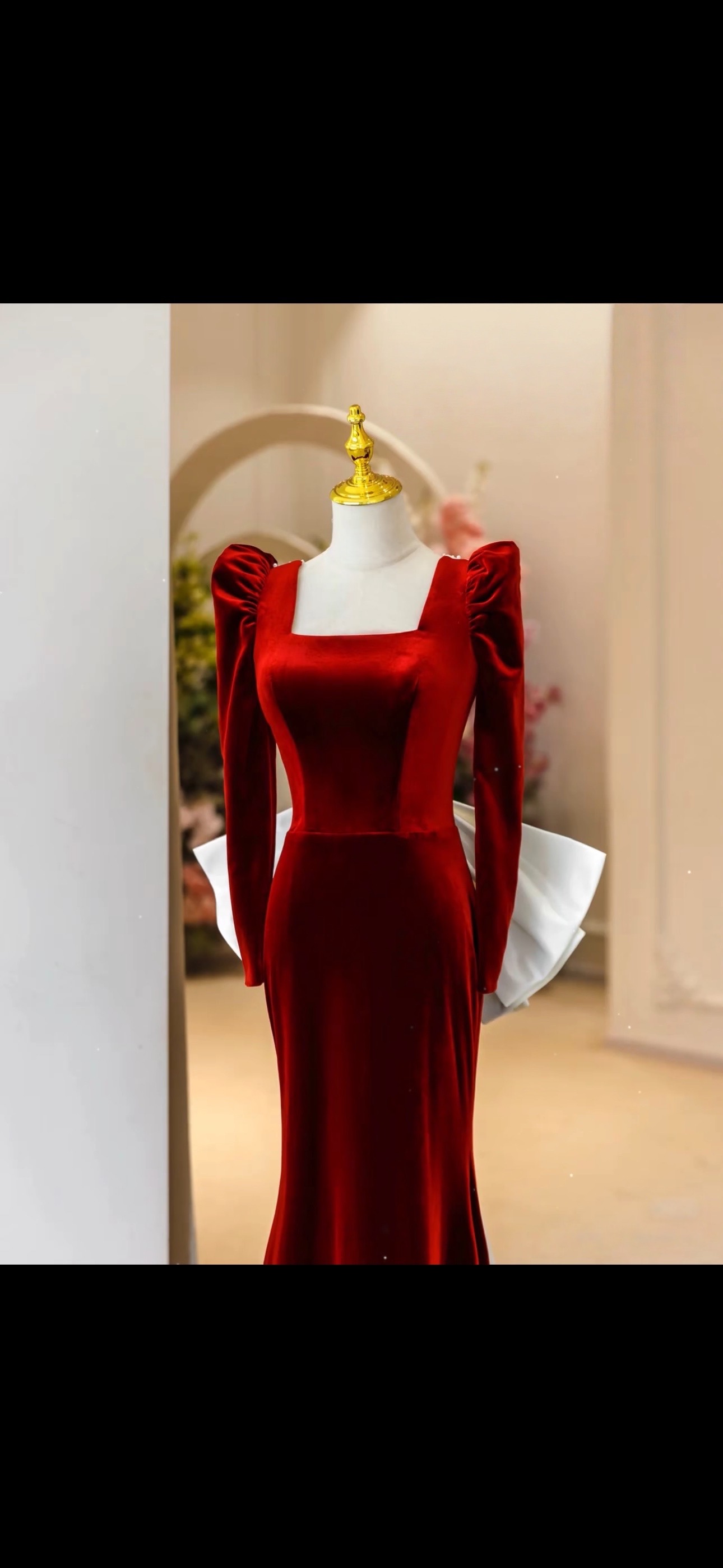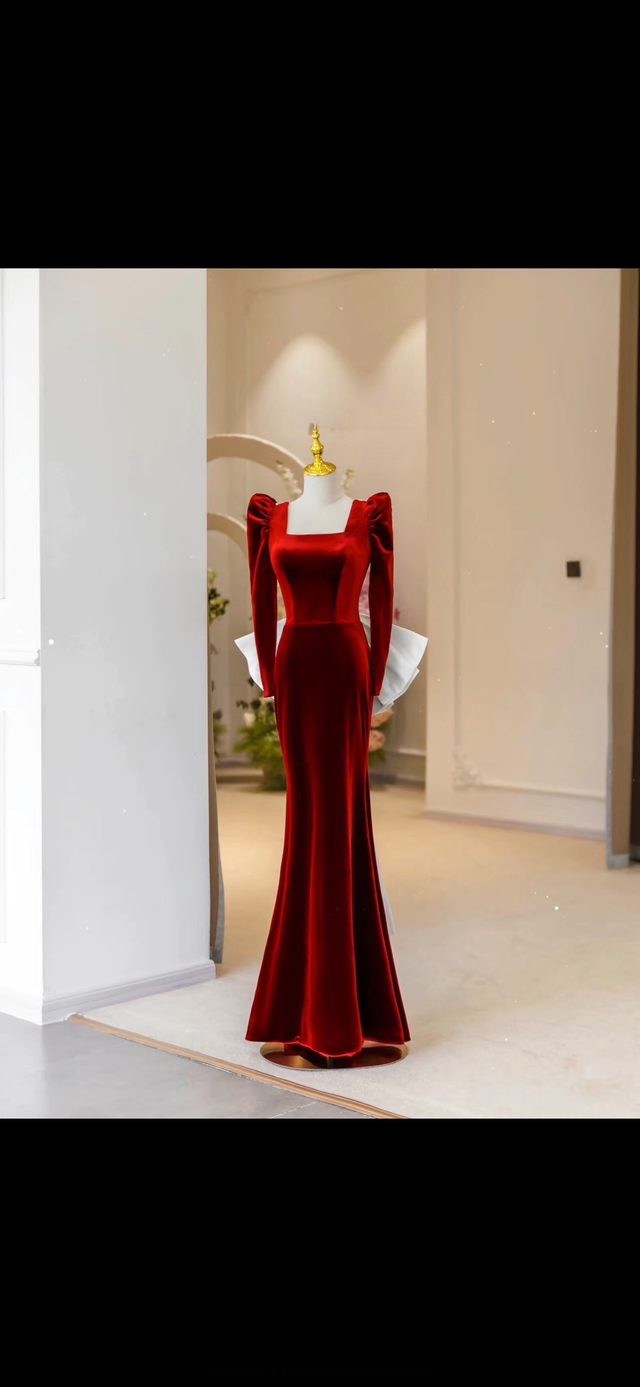 Red Square collar Long Sleeves Ivory Satin and Velvet with Removed Bow Prom Dress