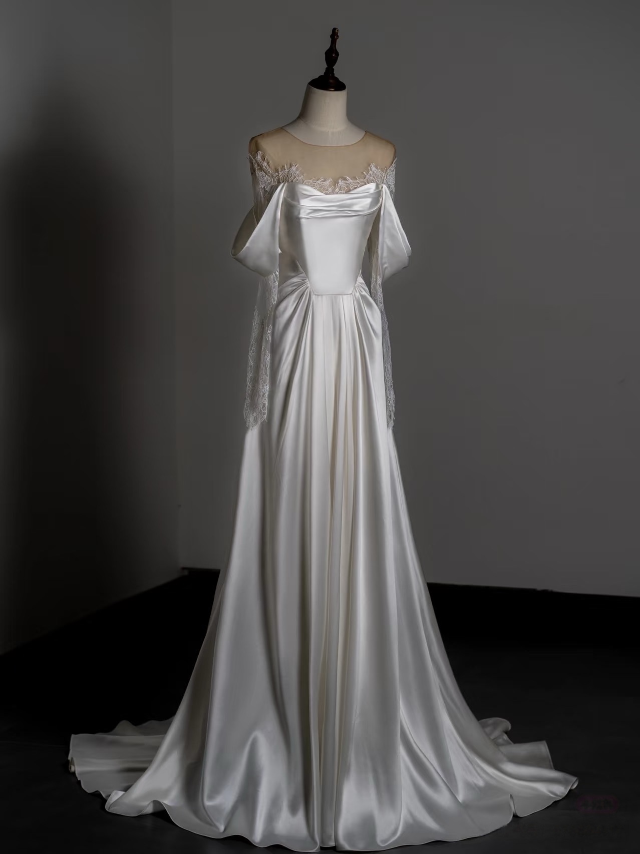 High Quliaue Satin Lace Long Sleeves A-line Lace up Train Wedding Dress