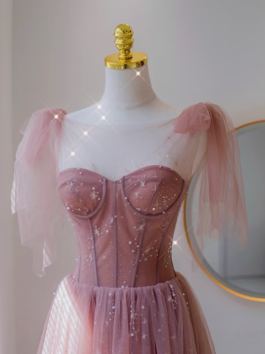 Fairy Sweet Pink Off Shoulder Evening Gown with Lace up Tulle Skirt Prom, Bridesmaid, Wedding Guest Dress
