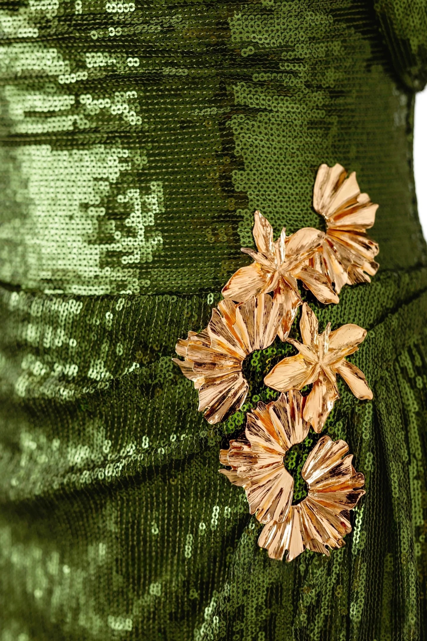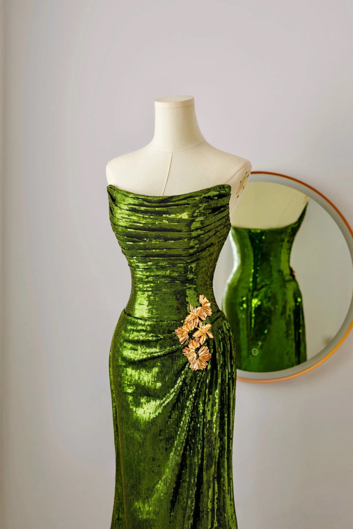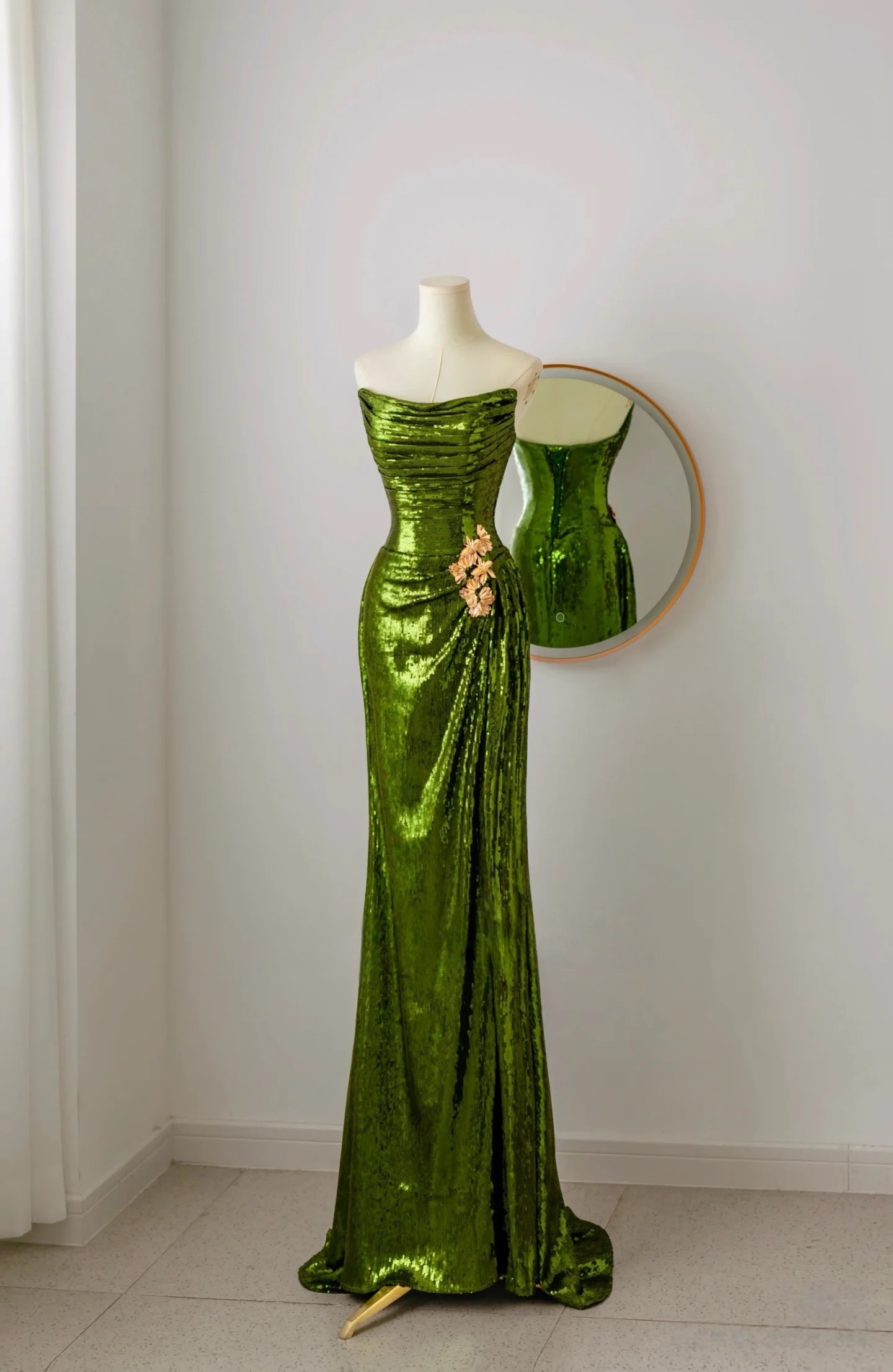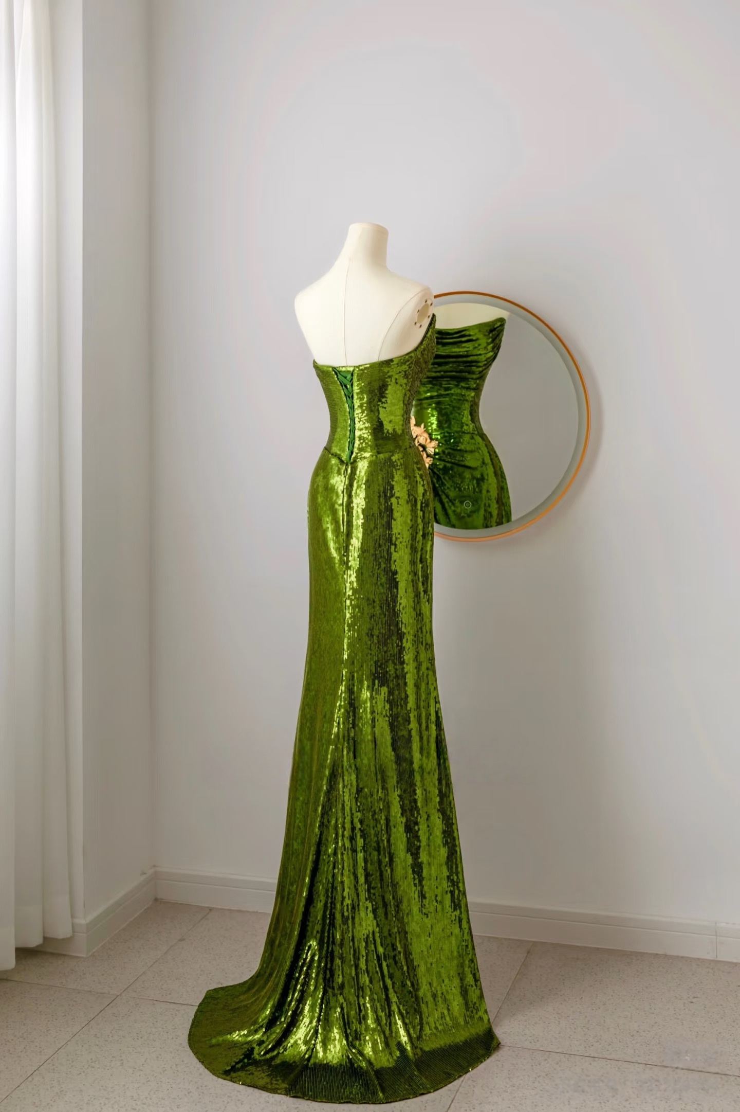 Custom Green Sequin Ruched Scoop Neck Strapless Slit Prom Dress,, Strapless Evening Party Dress,Open Back Dresses