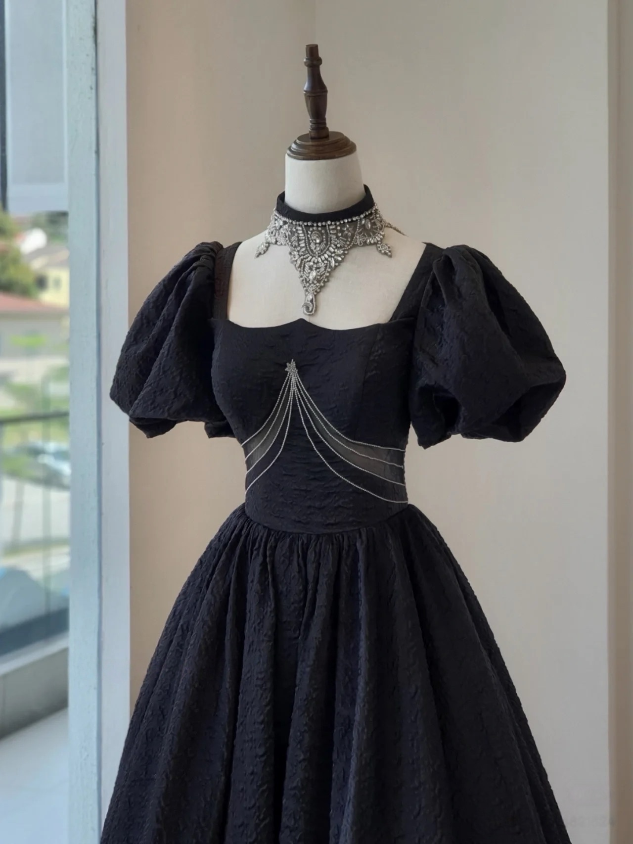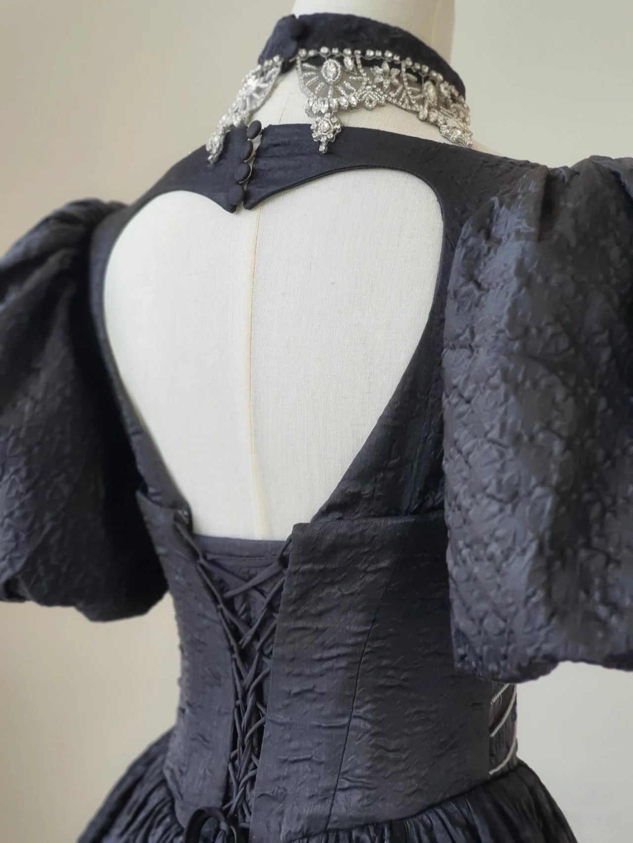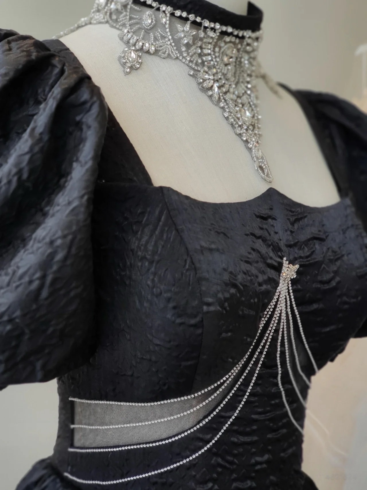 Black Jacquard Prom Dresses Puffed Sleeve Formal Dresses ,Long Black Prom Dress with Intricate Beaded Cut-out Evening Dress