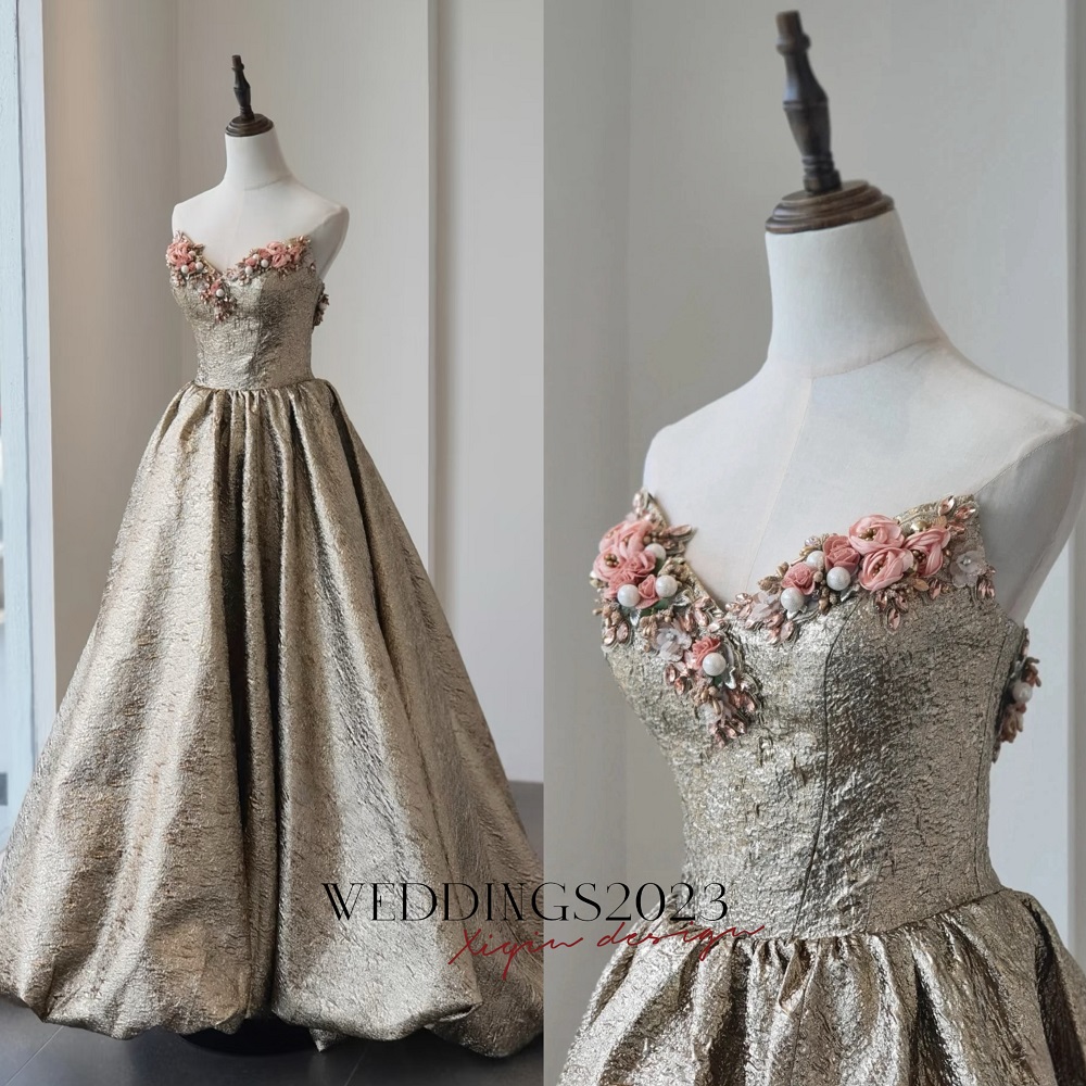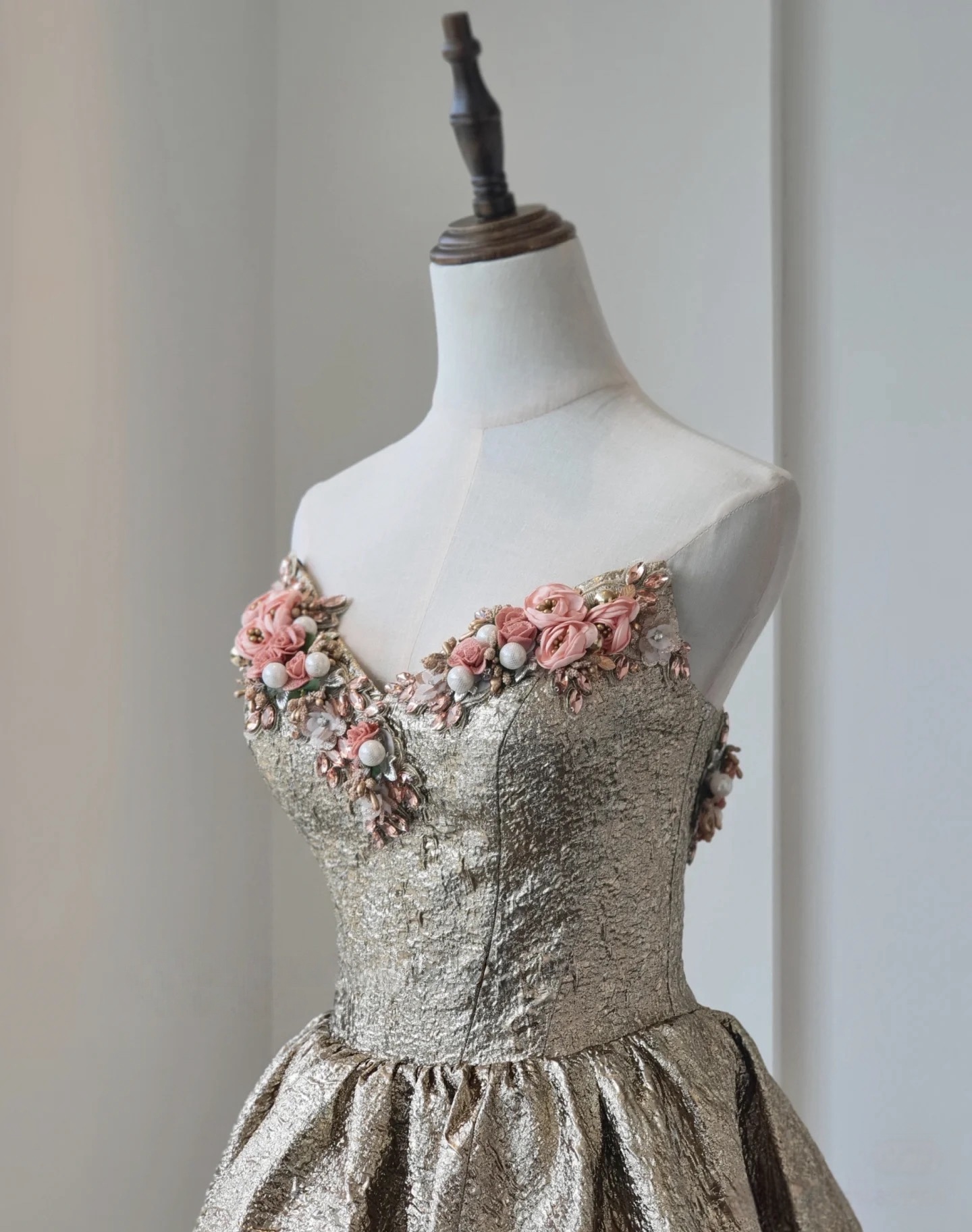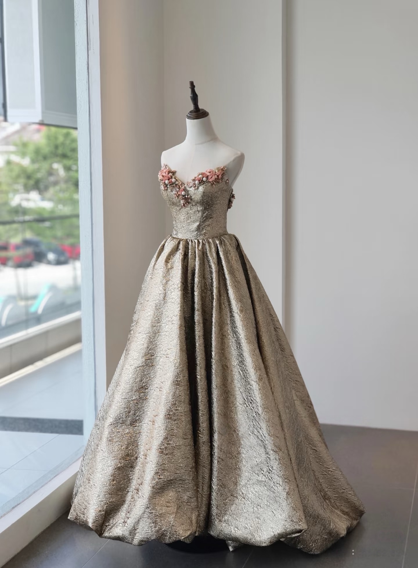 Champagne Jacquard Strapless Prom Dresses Floral Strapless Quinceanera Dresses