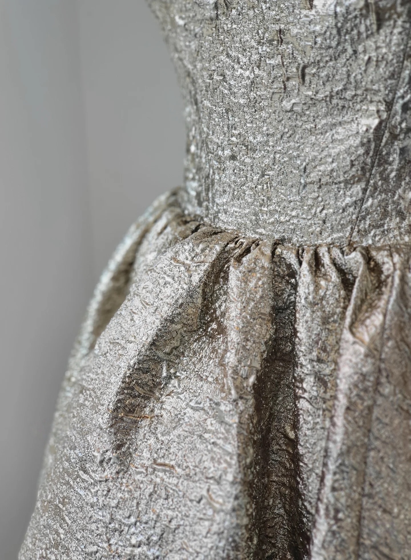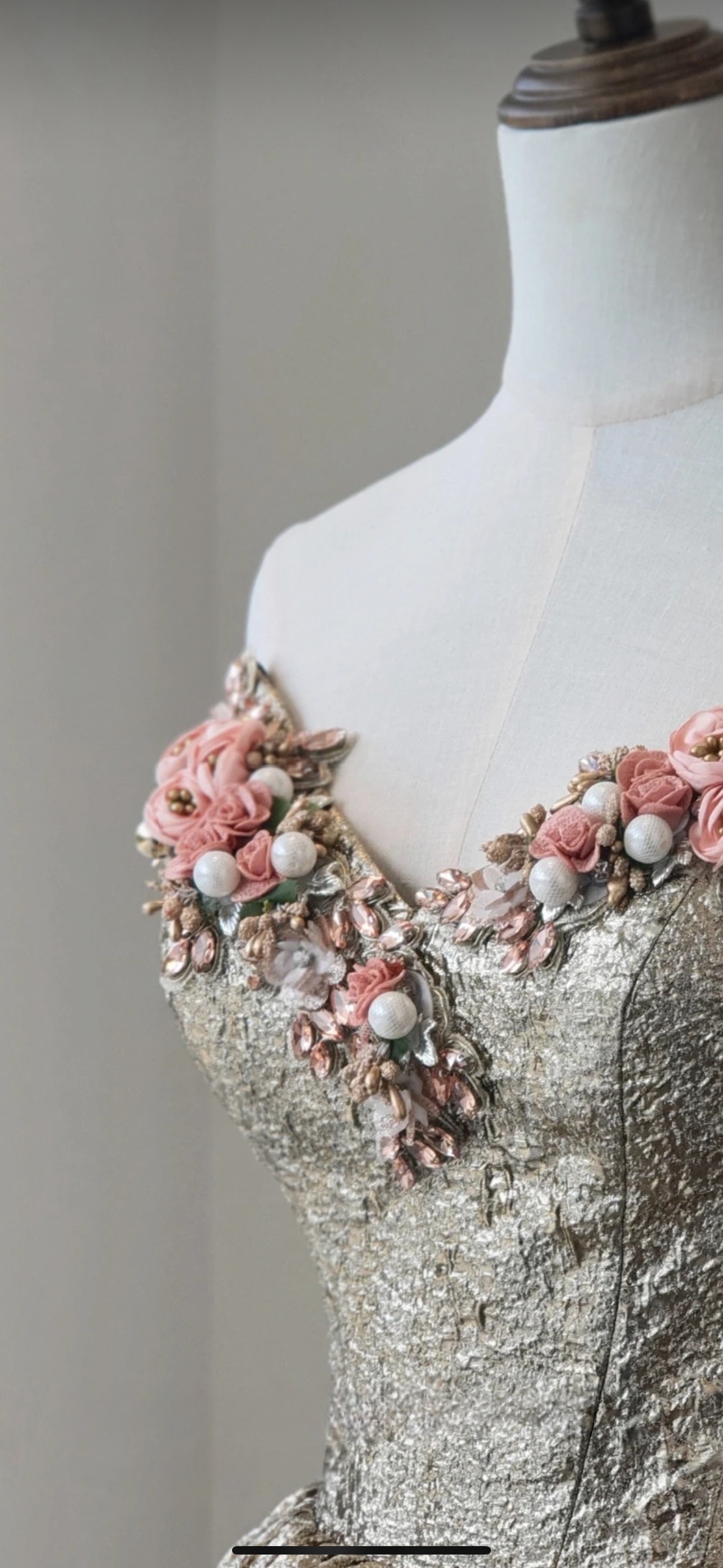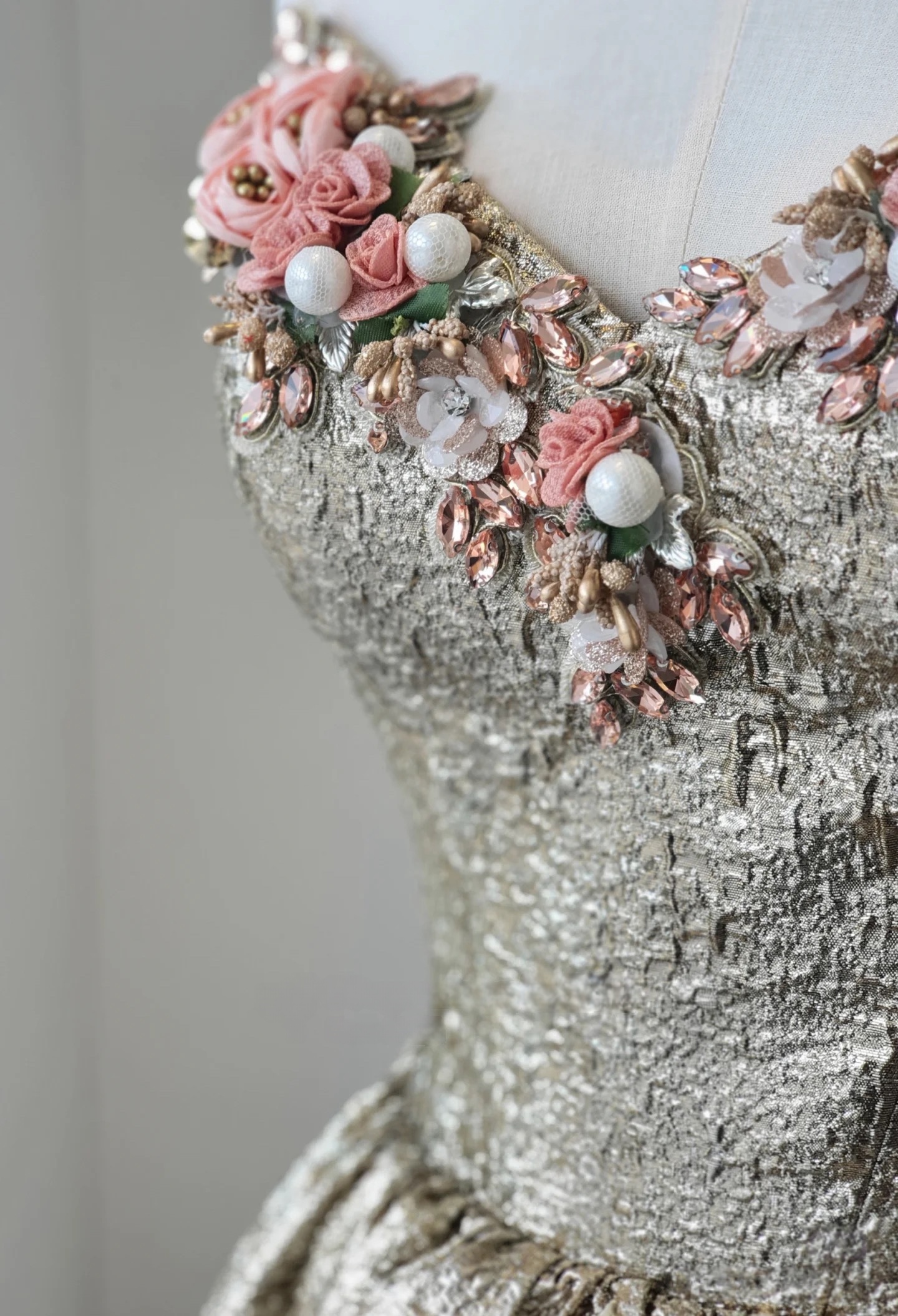 Champagne Jacquard Strapless Prom Dresses Floral Strapless Quinceanera Dresses