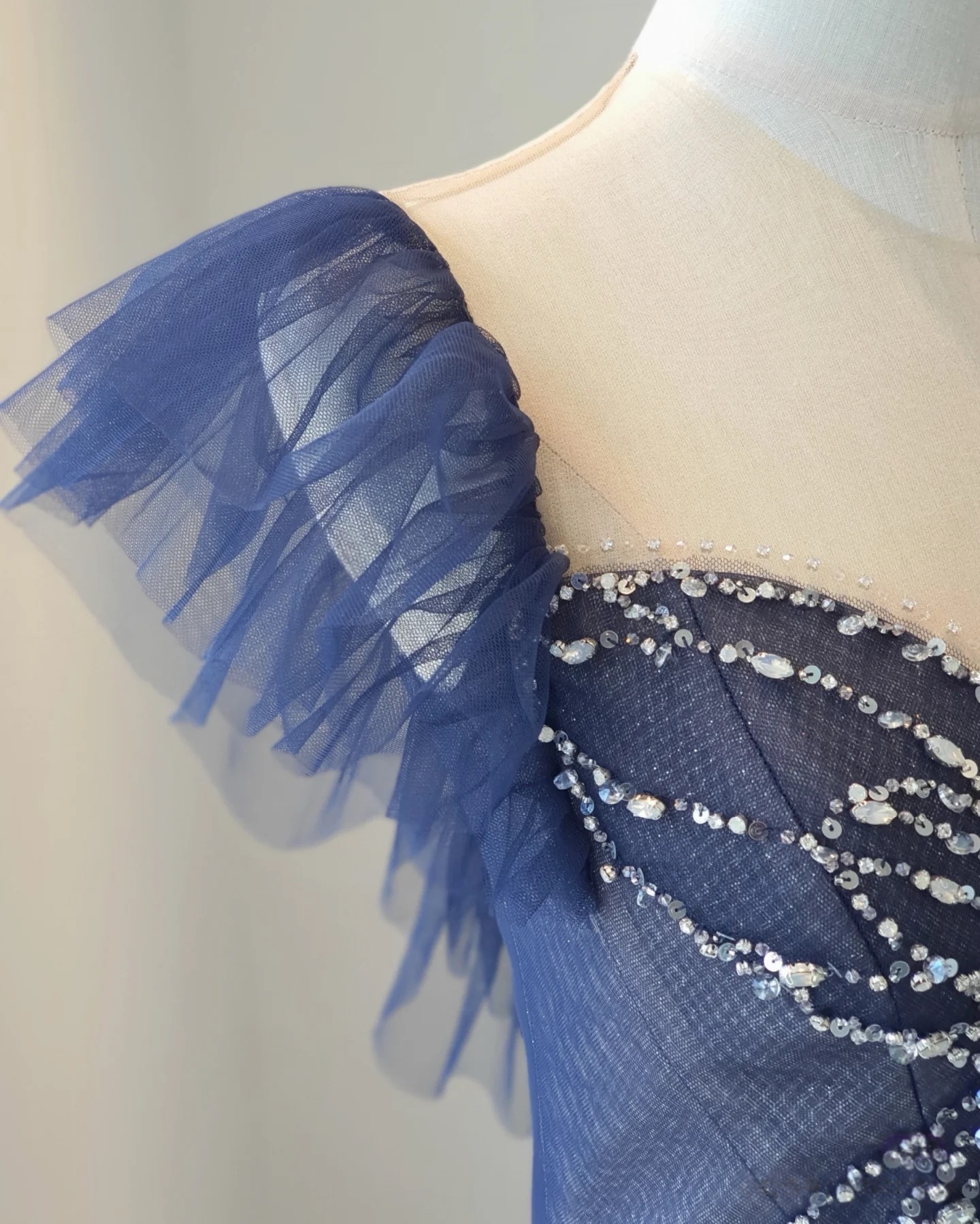 Navy Blue Prom Dress Sweetheart Neckline A-Line Long Sleeve Shiny Banquet Bridesmaid Evening Gown with Beaded Tulle Prom Dress
