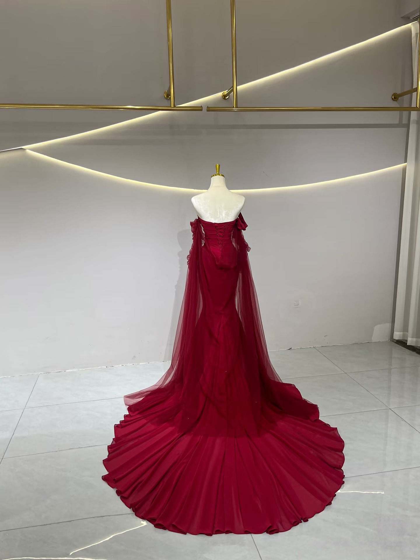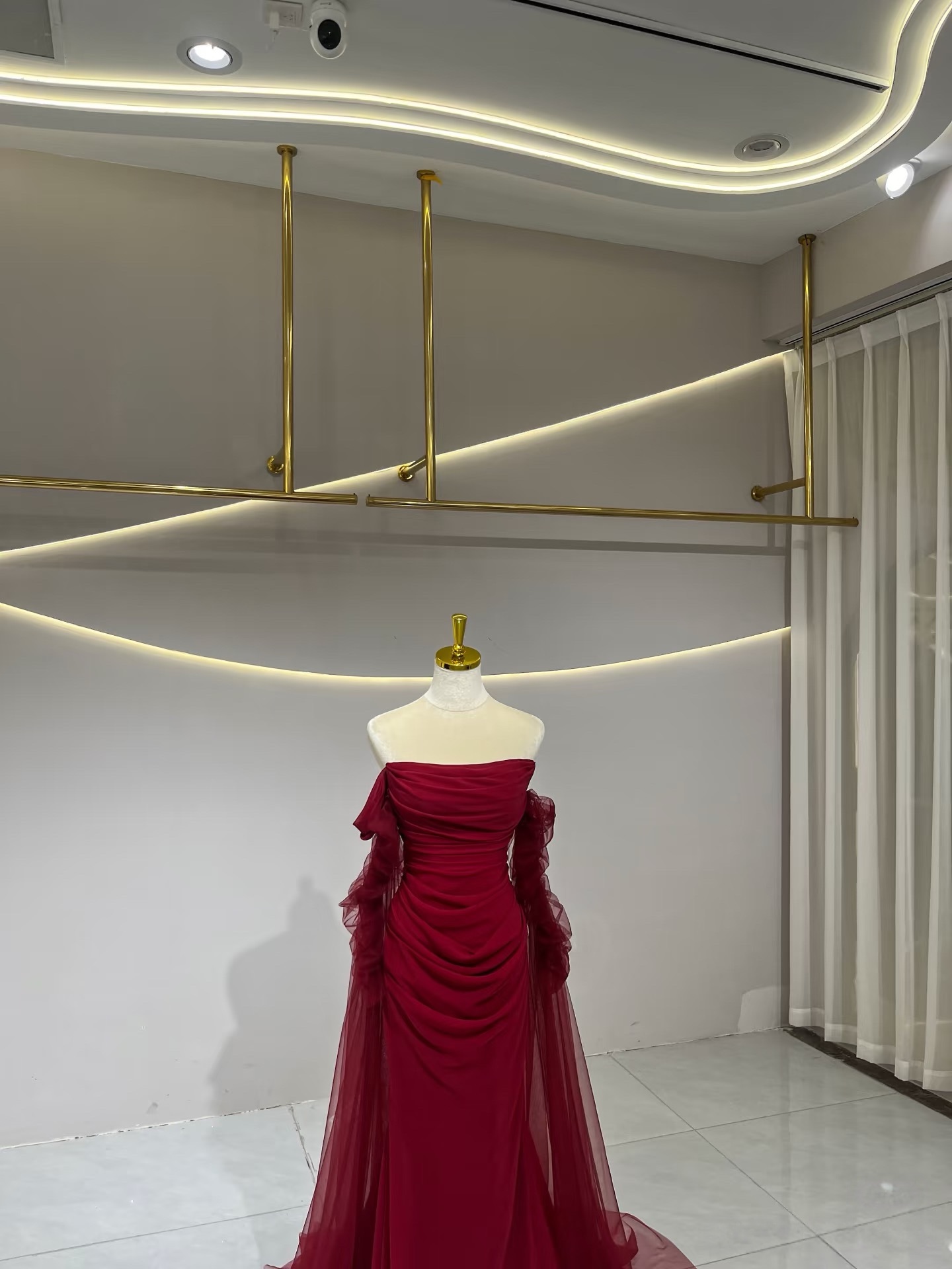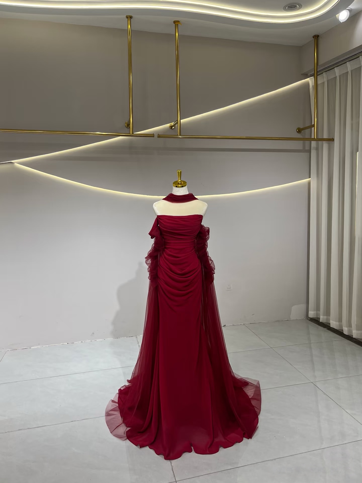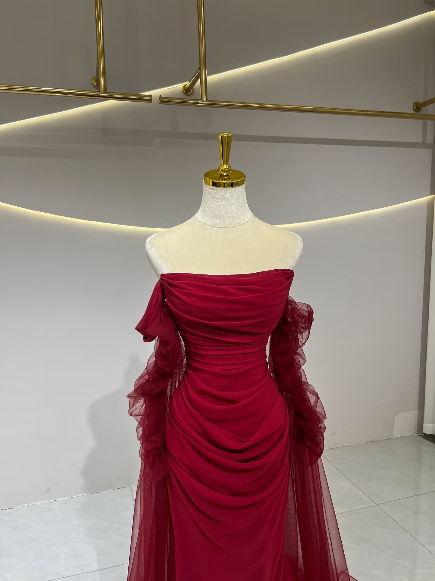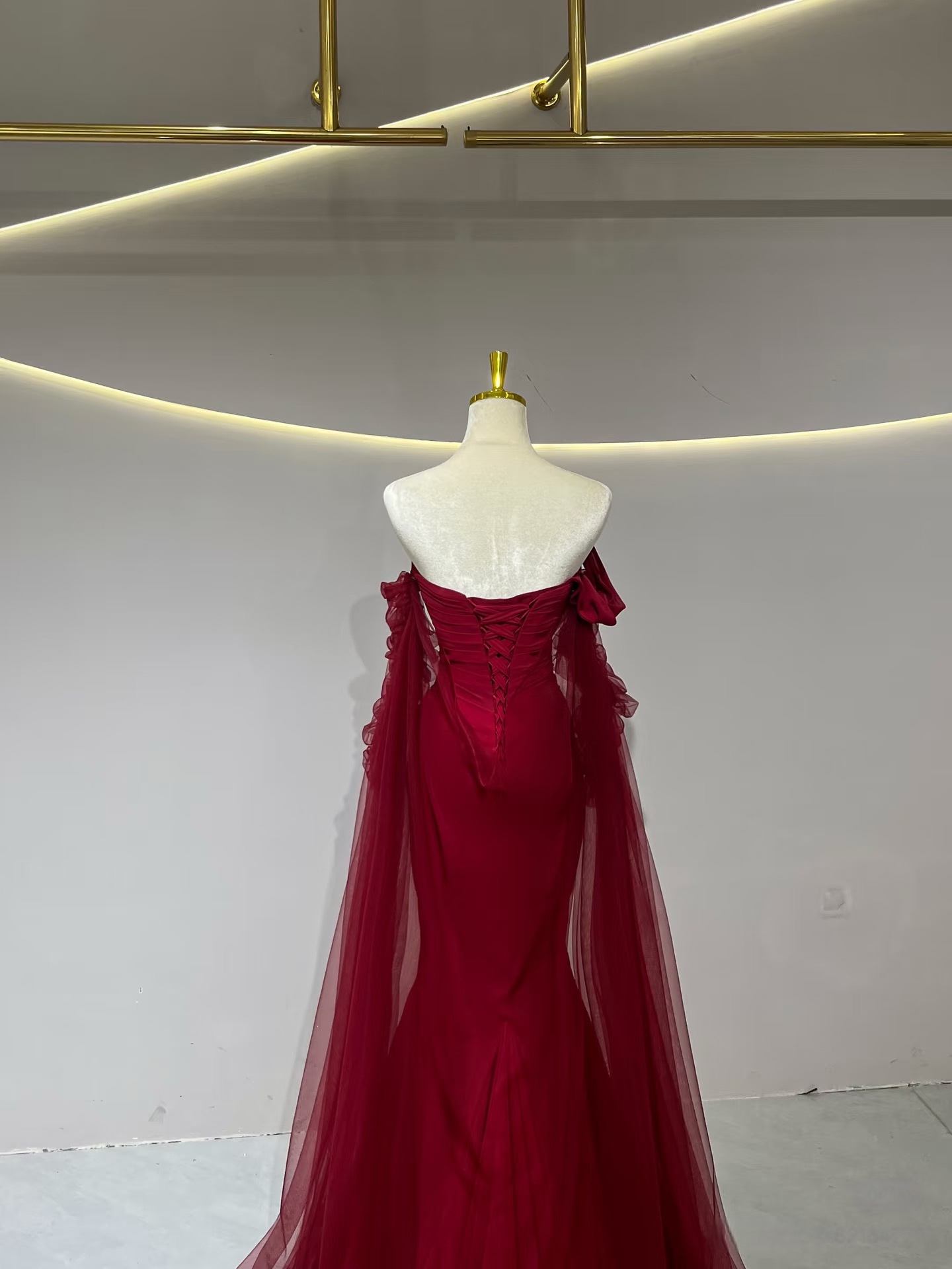Strapless Long Sleeves Mermaid Chiffon Off Shoulder Evening Dress with Bow Burgundy Prom Dress