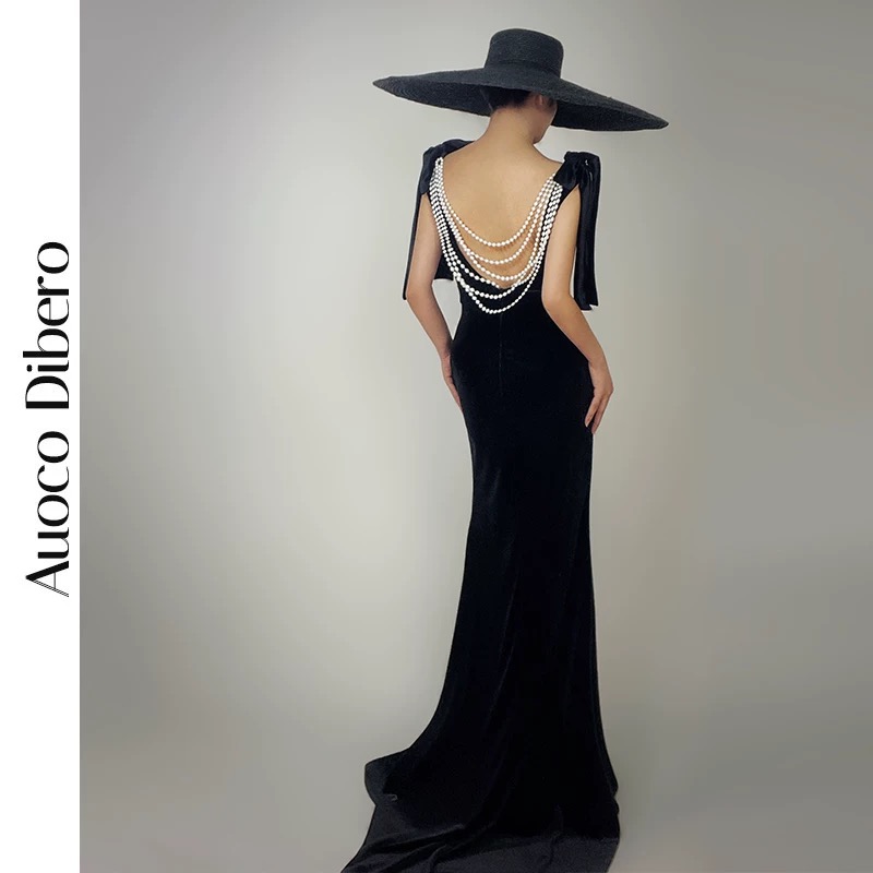 Black Mermaid Eembellished Velvet Open-back Maxi Dress,Floor Length Black Prom Dress