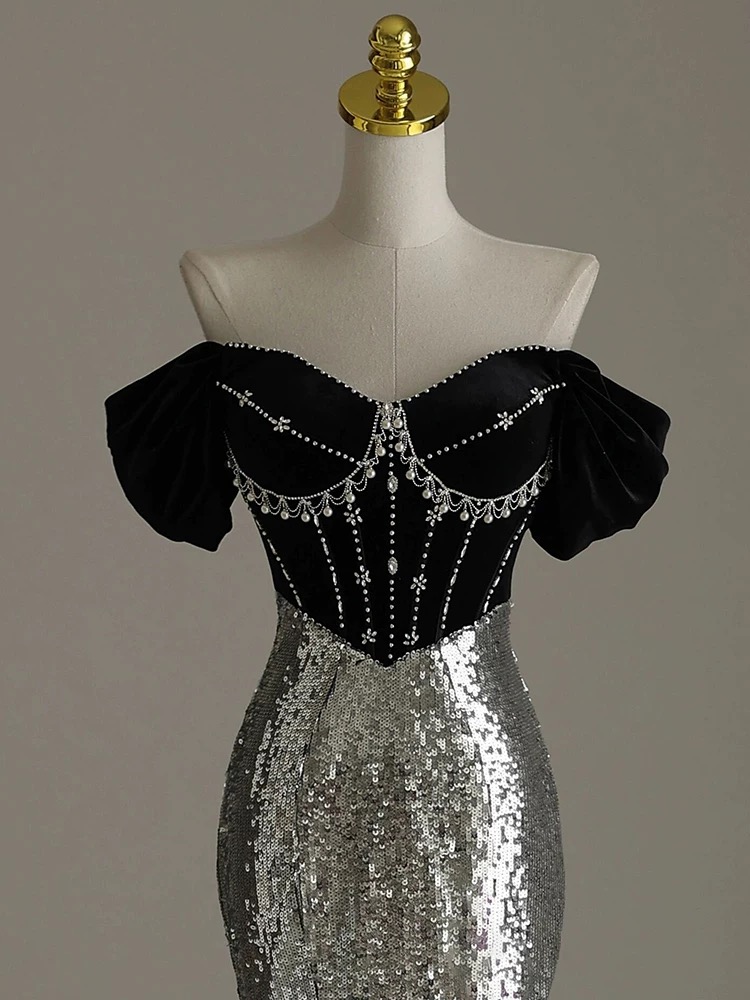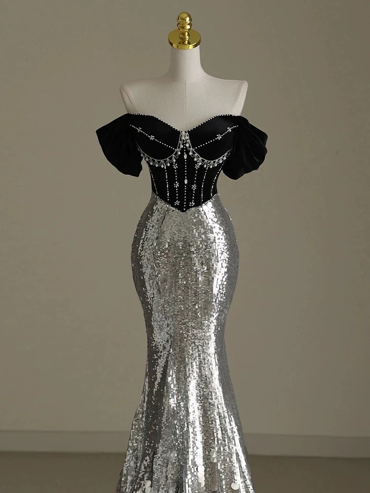 Elegant Silver Mermaid Off Shoulder Evening Gowns Chic Velvet Sequin Long Prom Dresses