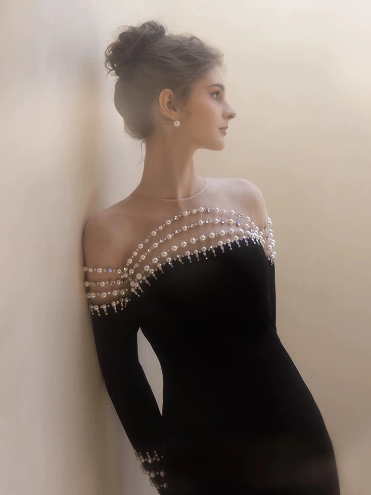 Elegant Velvet Evening Dress Women Luxury Pearls Long Sleeves Mermaid Pageant Dresses Black Split Illusion Back