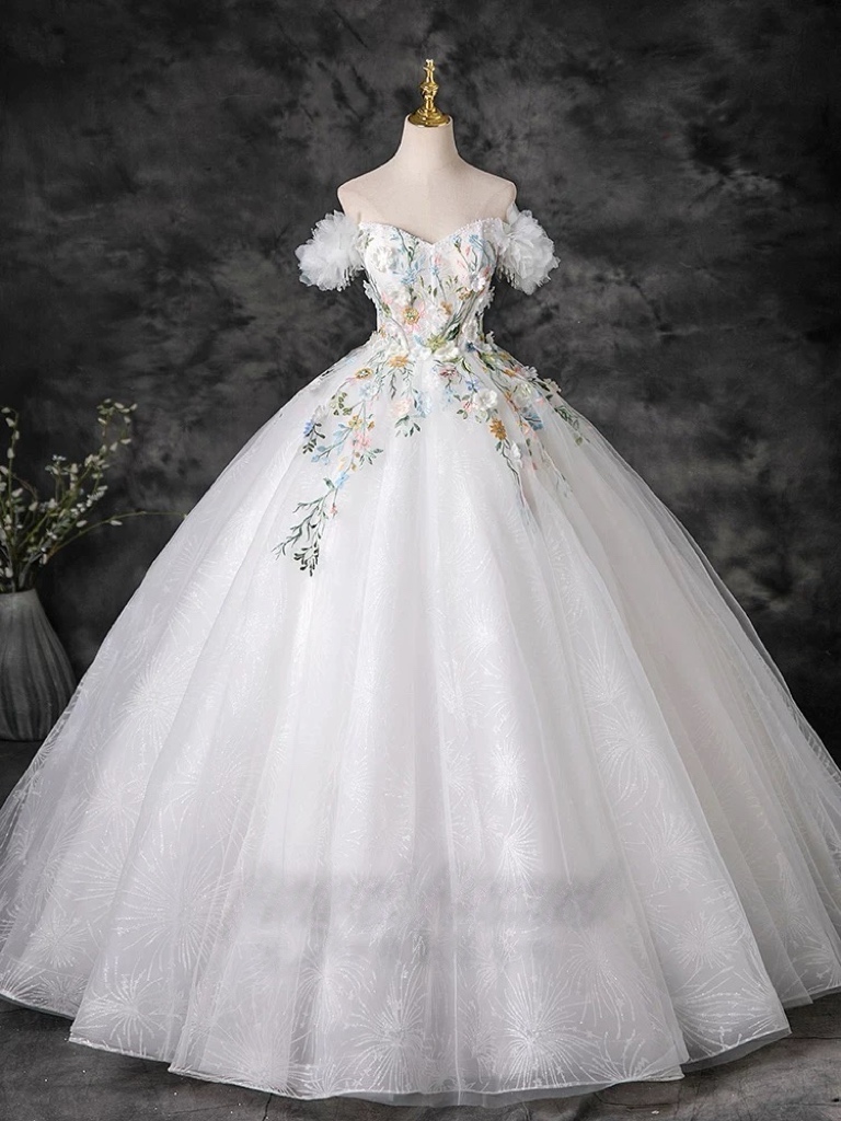 Fairytale Multi-Colors Lace Flower Appliques Pearl White Prom Dresses Ball Gown Off-The-Shoulder Short Sleeve Backless Floor-Length / Long Prom Formal Dresses