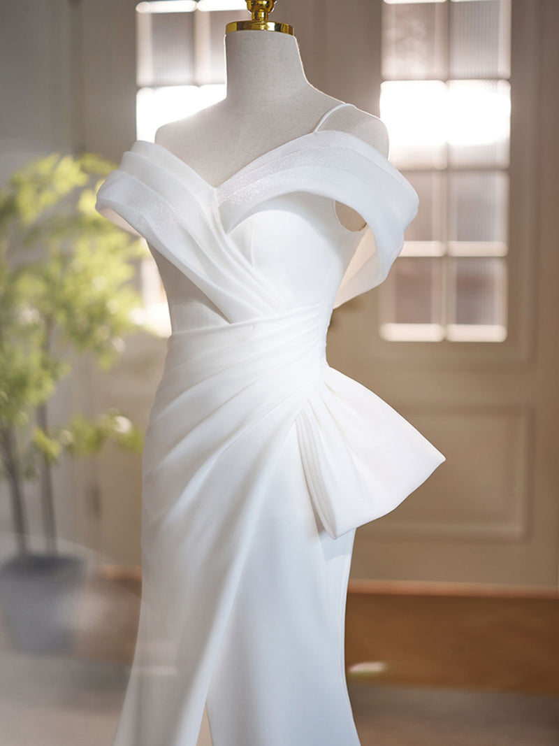 Vintage Mermaid Straps White Satin Long Wedding Dresses,Simple Split Front White Formal Dress Off Shoulder