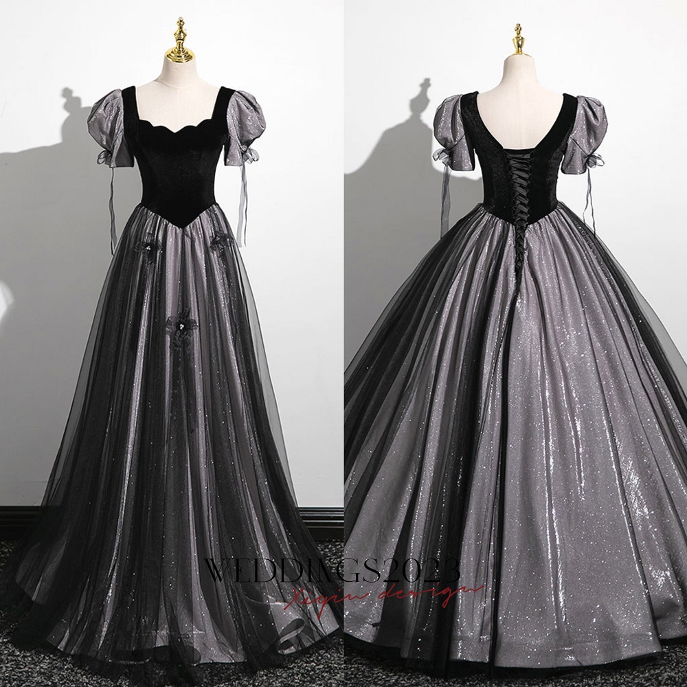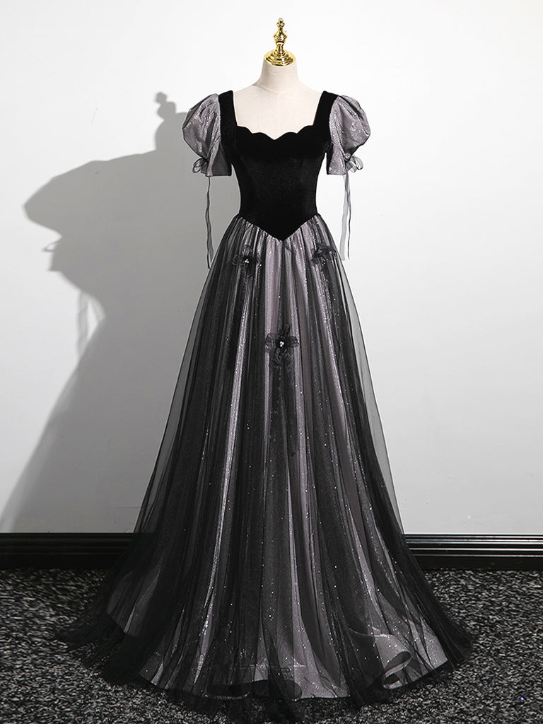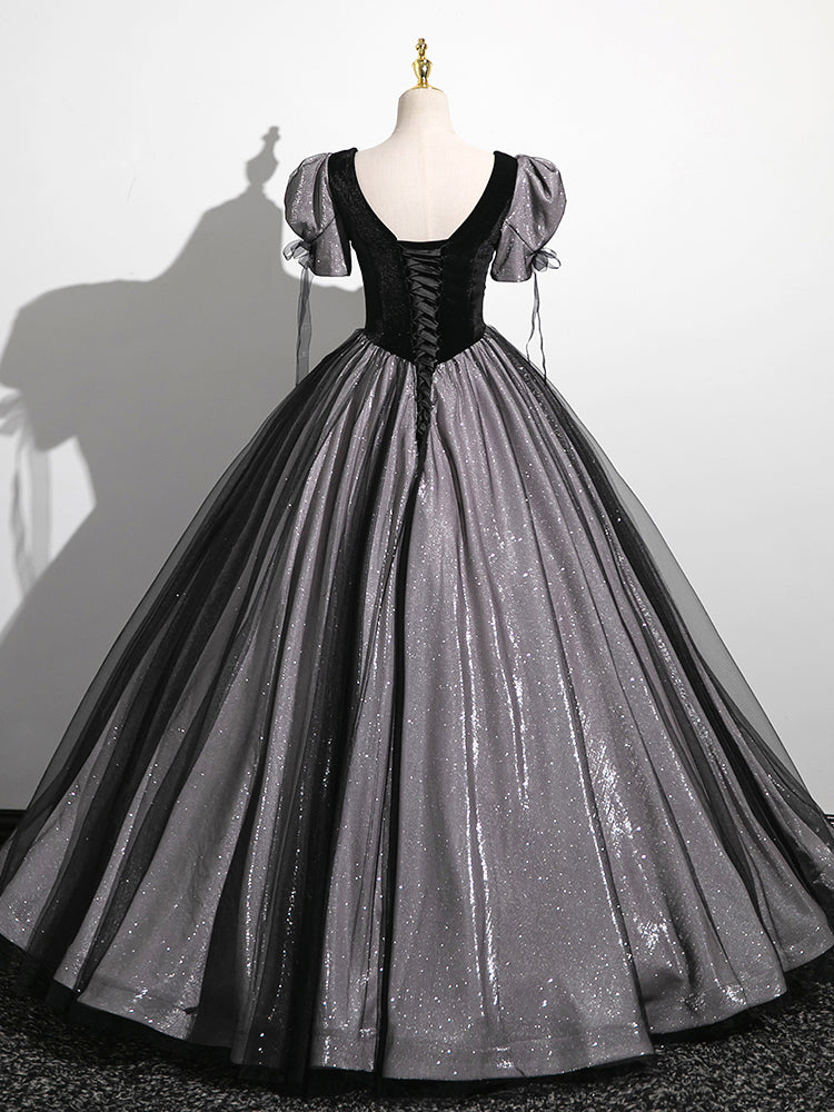 Black Tulle Sequins Square Neck Puff Sleeve Quinceanera Dress