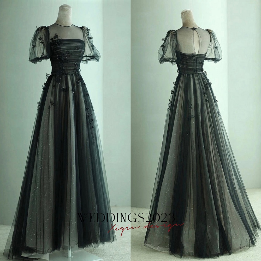 Black Tulle Puffy Short Sleeves A-line Prom Dress, Black Evening Dress Party Dress