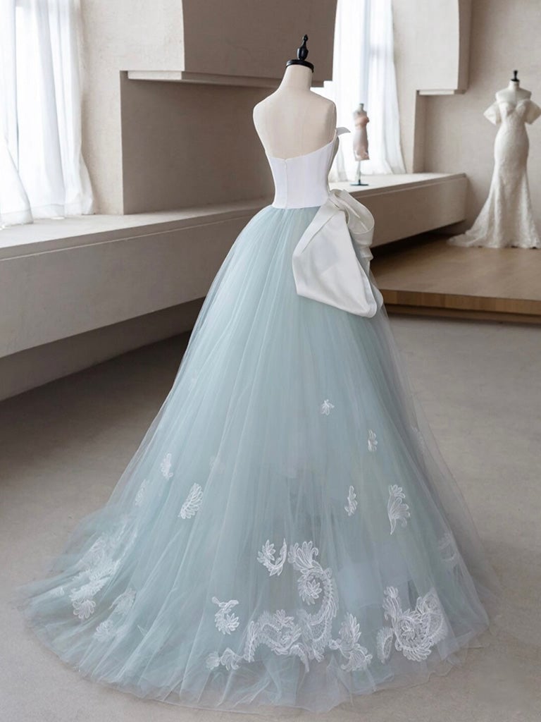 Blue Tulle Lace Applique Strapless A Line Long Prom Dress, Blue Long Formal Dress