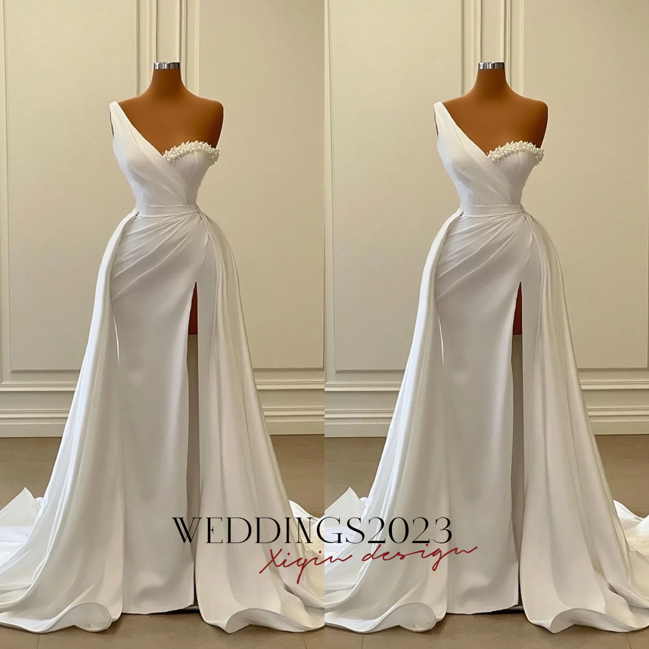 Flamboyance Mermaid Wedding Dresses With Detachable Train Beads Pearls Satin Bridal Gowns Side Split W-51831