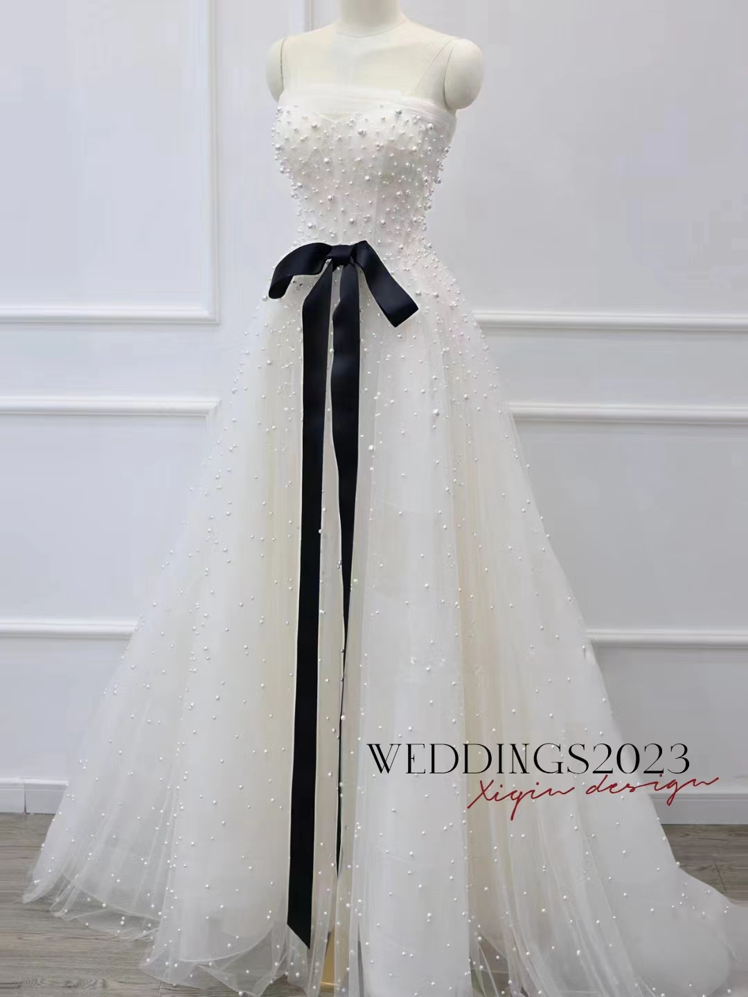 Elegant Long Tulle Pearl A-Line Spaghetti Strap Evening Dresses White Corset Back Formal Party Gown P-0018