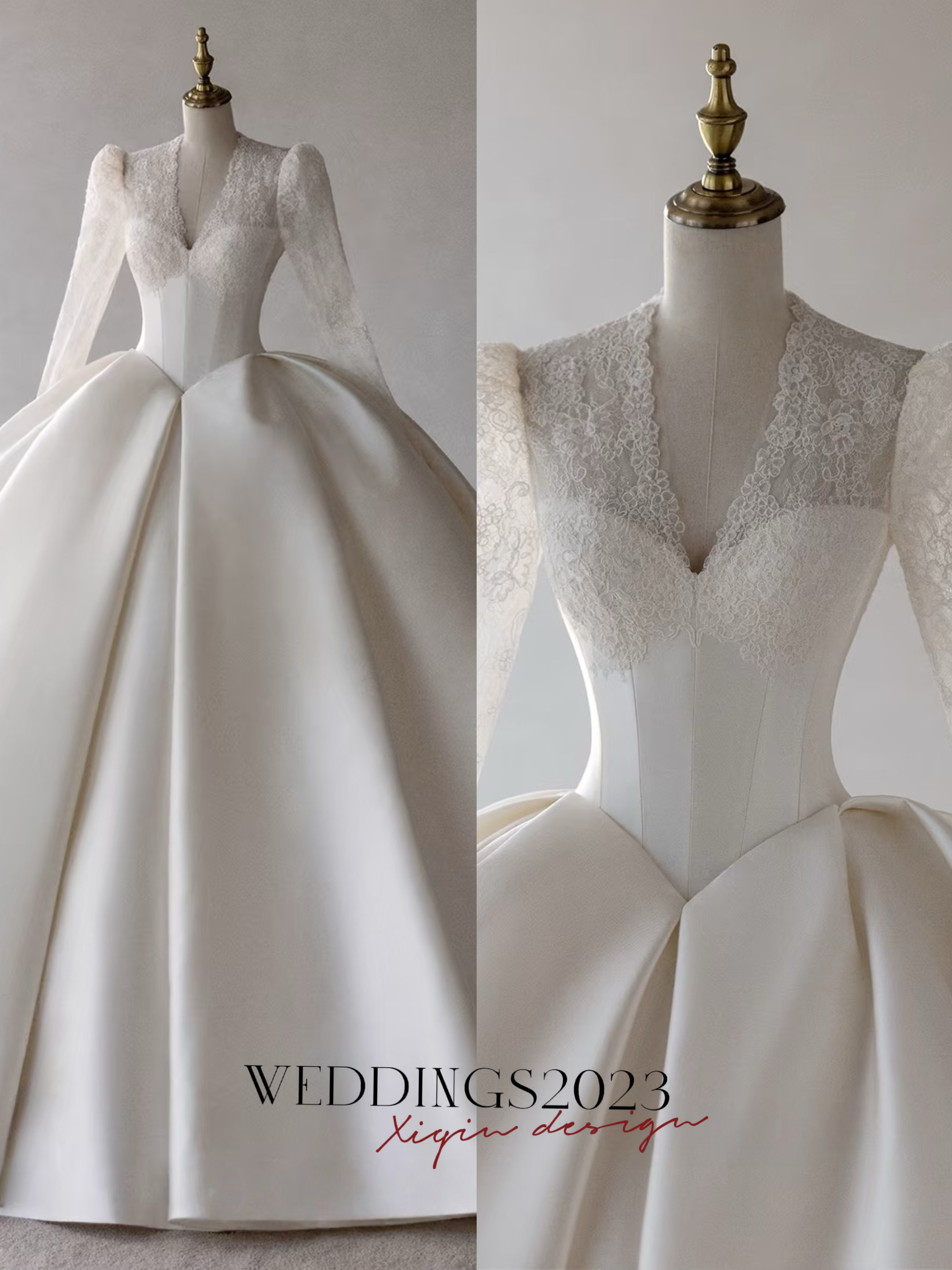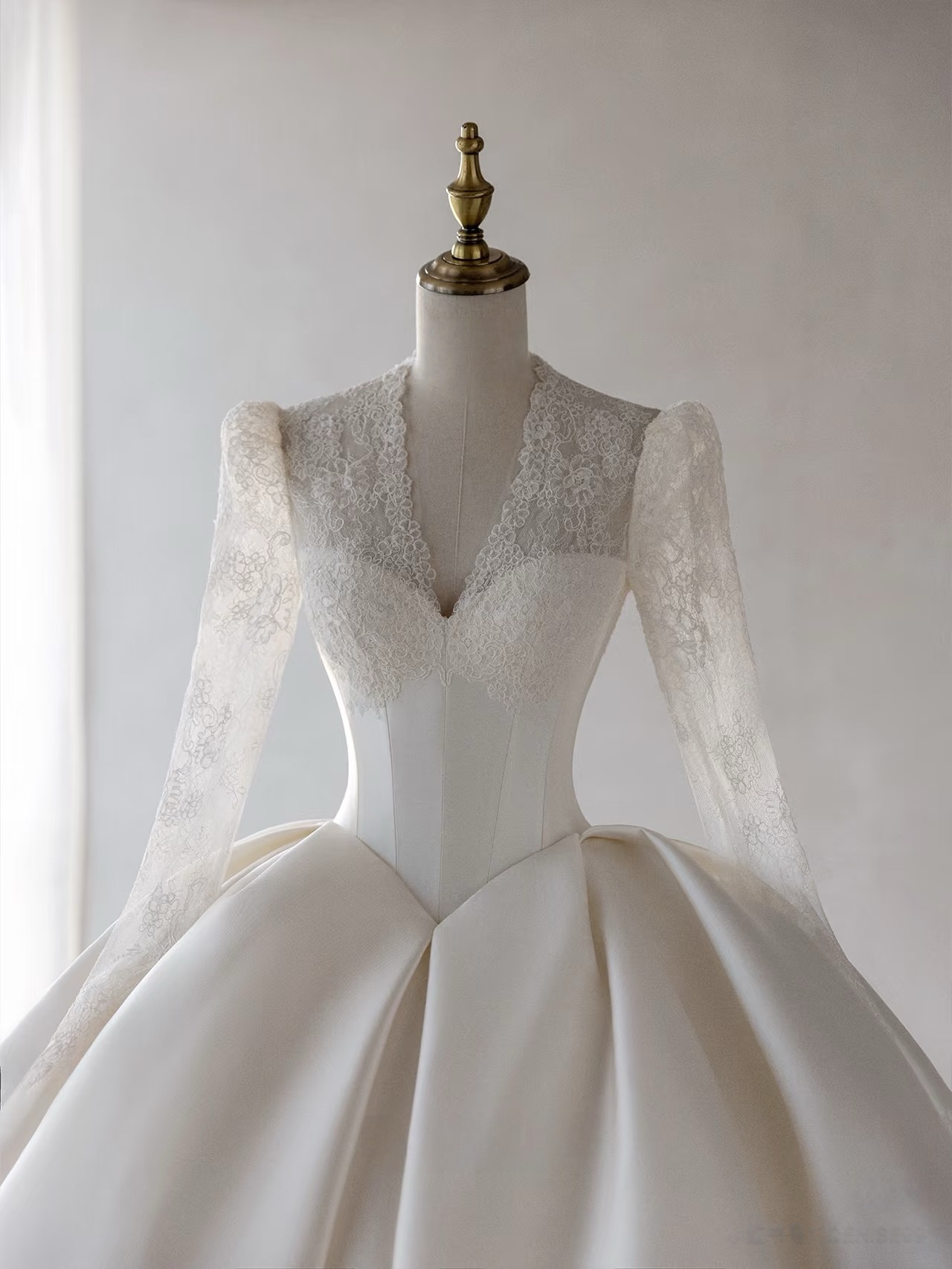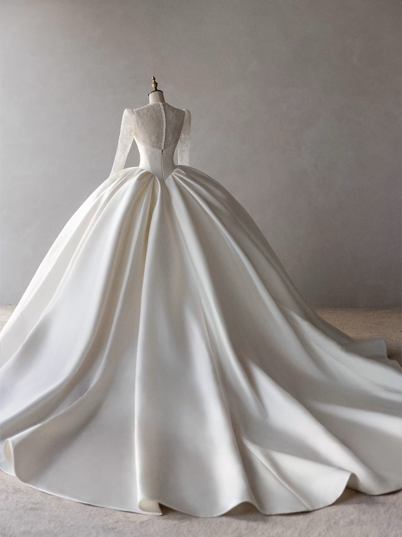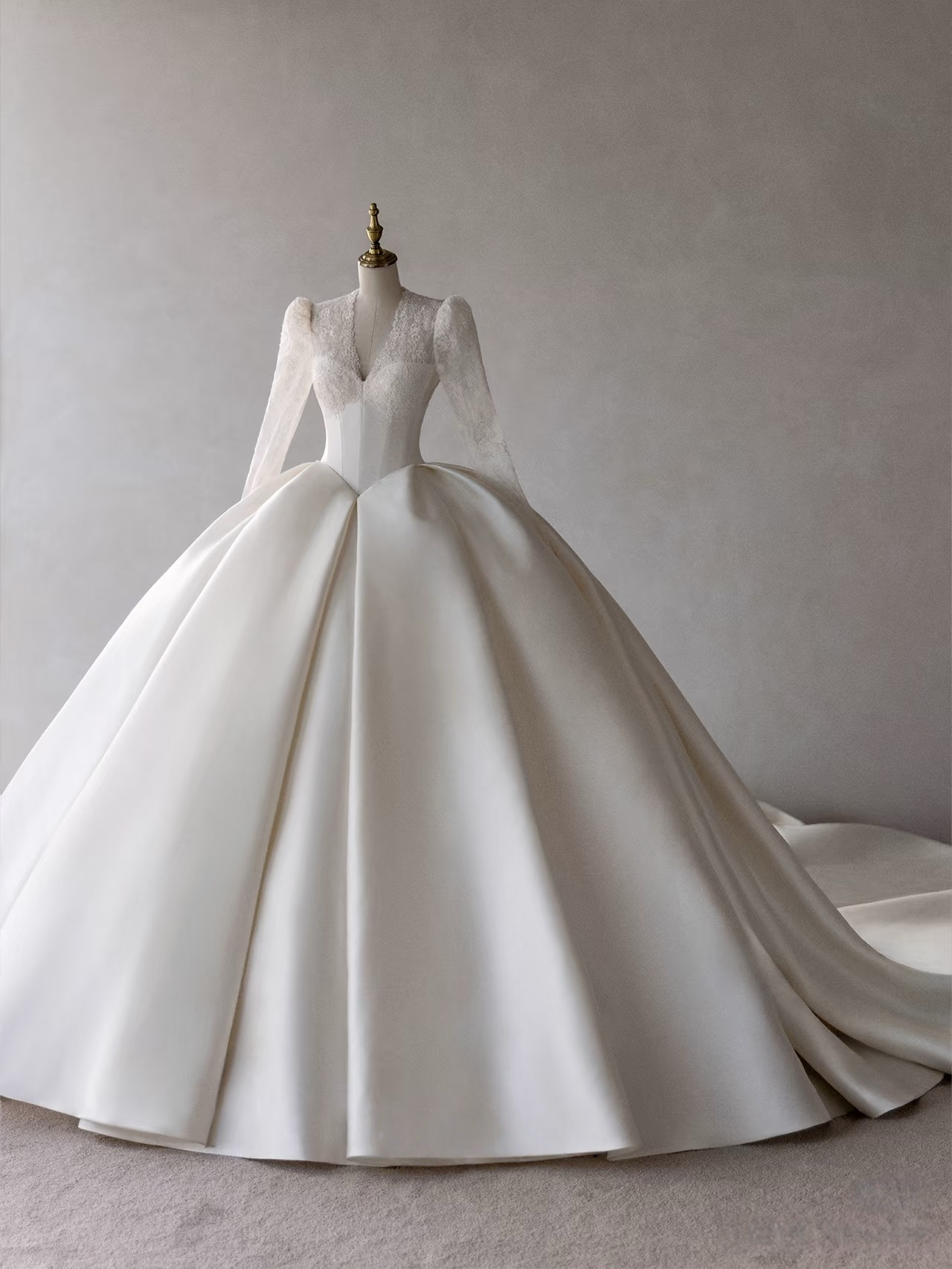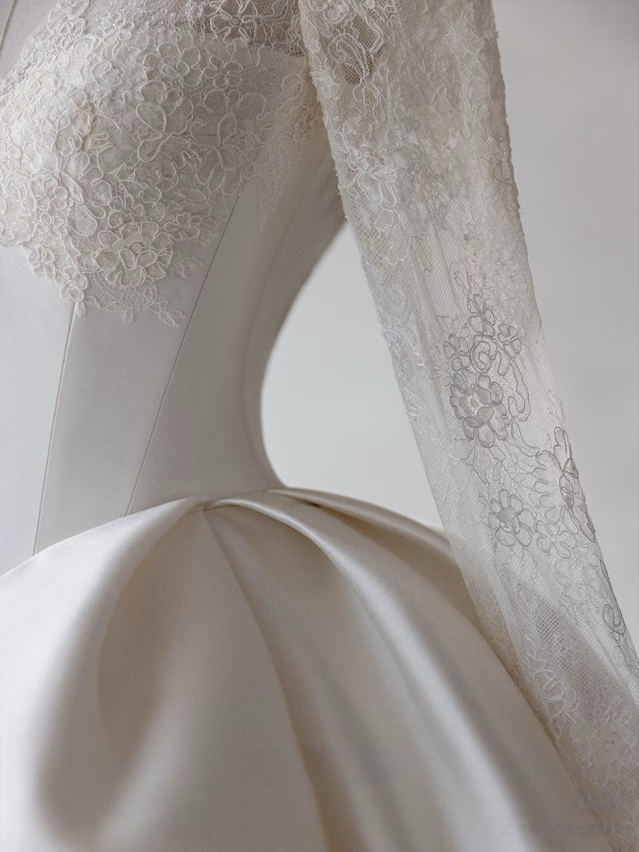 Ivory off-the-shoulder satin wedding dress, A-line gown with lace bodice and long sleeves, trailing bridal shape, minimalist bridal gown
