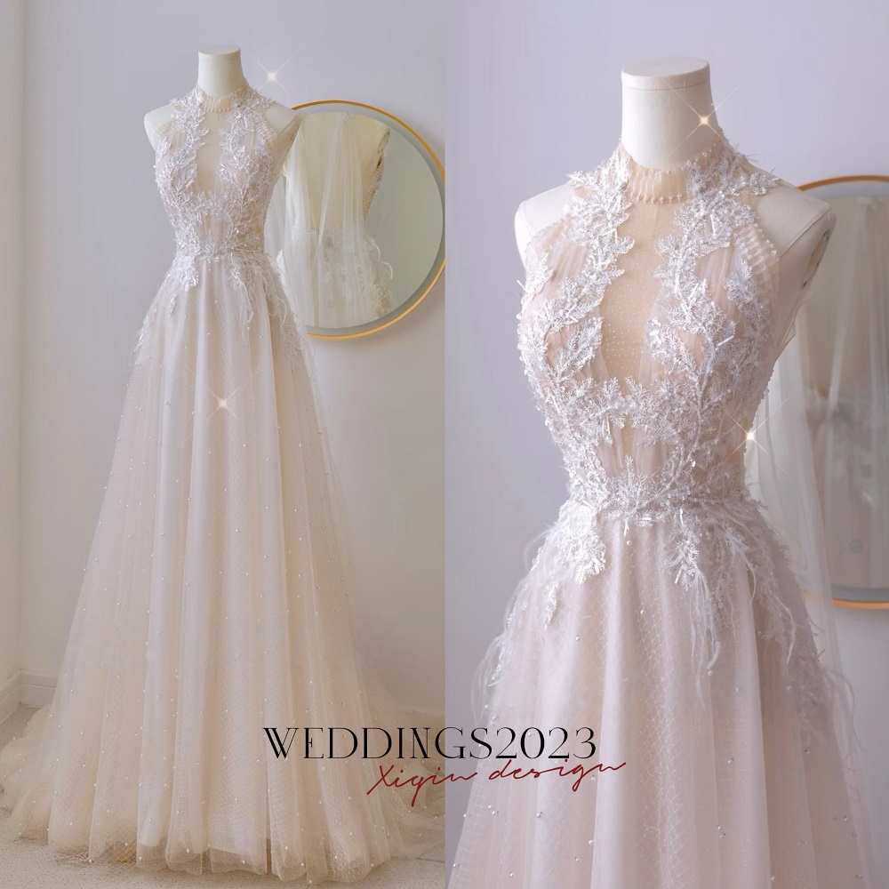 Boho Wedding Dress with Floral Lace Applique, High Neck Beading Beach Wedding Dress, Tulle Skirt Lace Wedding Dress