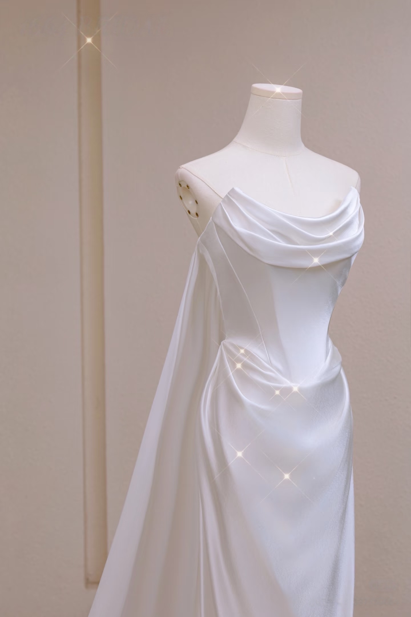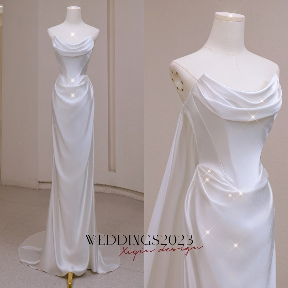 Minimalist Satin Off-Shoulder Corset Wedding Dress with Sheer Cape, Strapless Ivory Wedding Dress