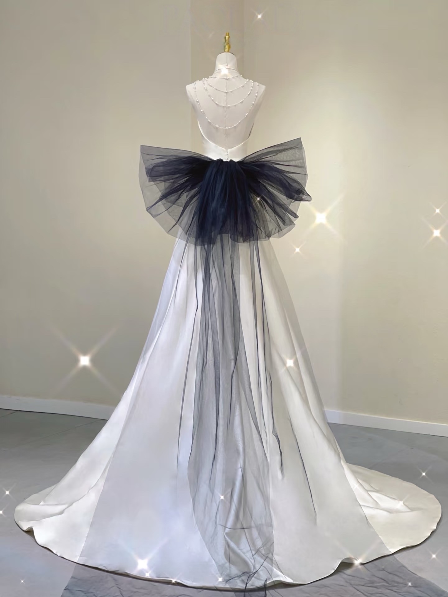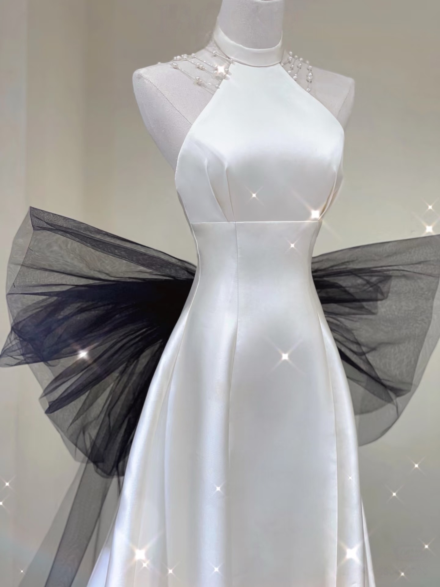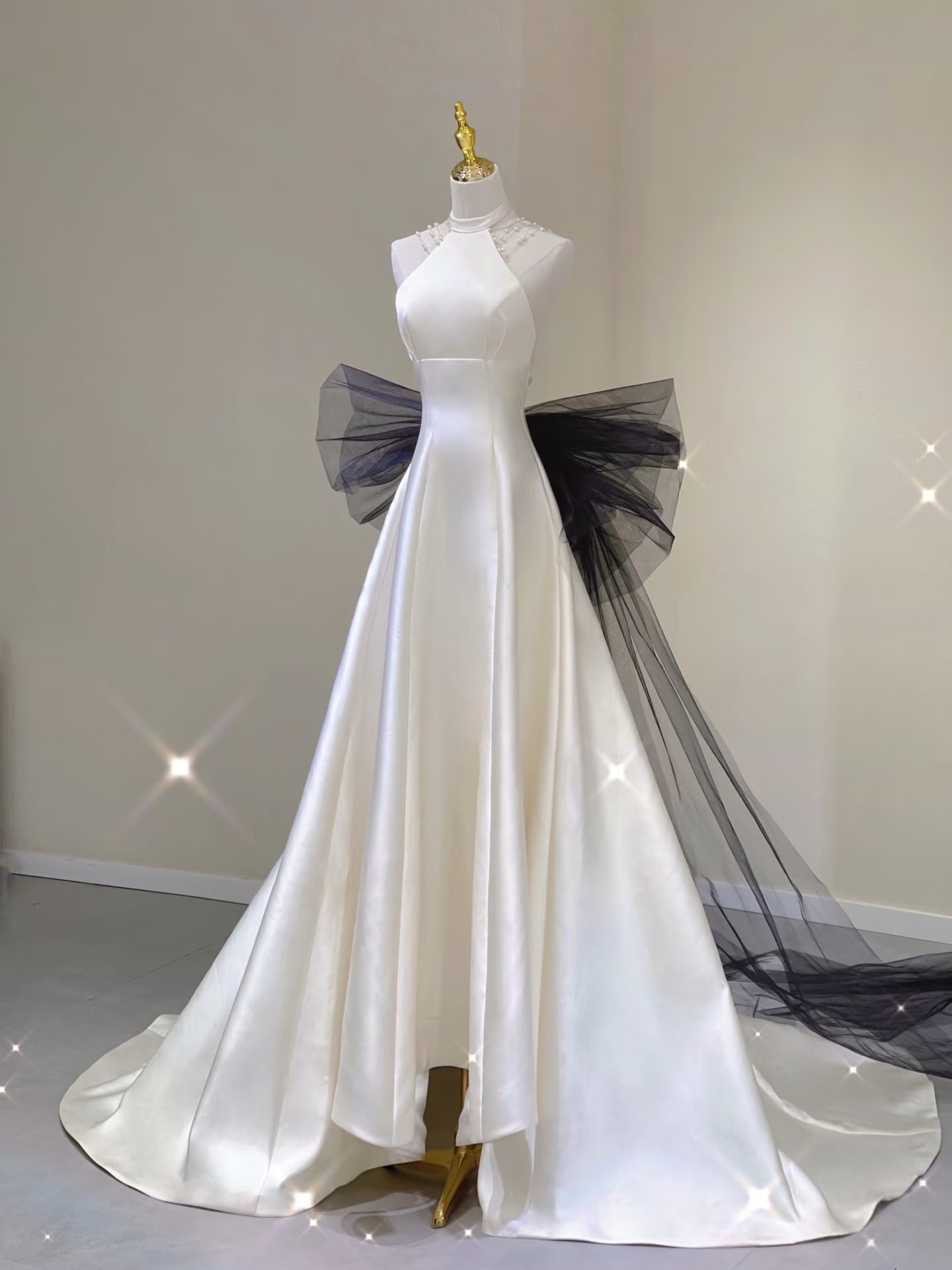 Ivory Satin Pearls Halterneck A Line Wedding Dress Sleeveless Bow Open Back Bridal Gown