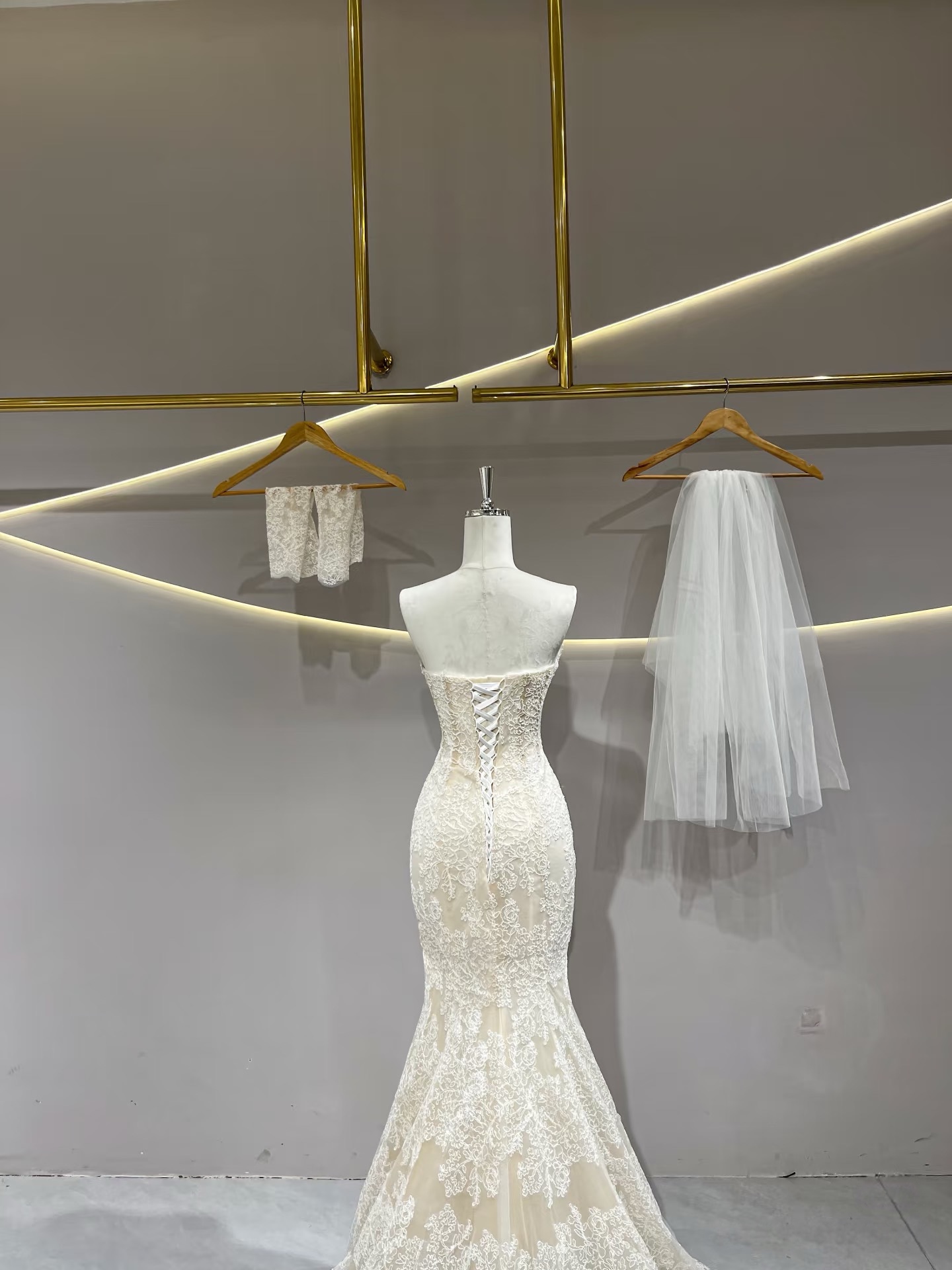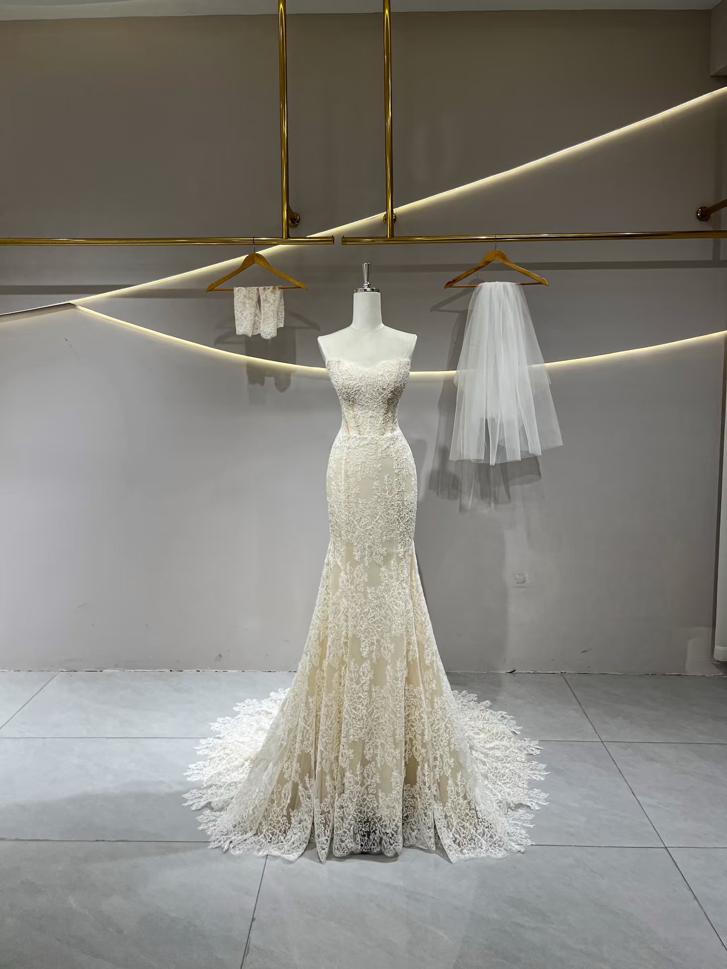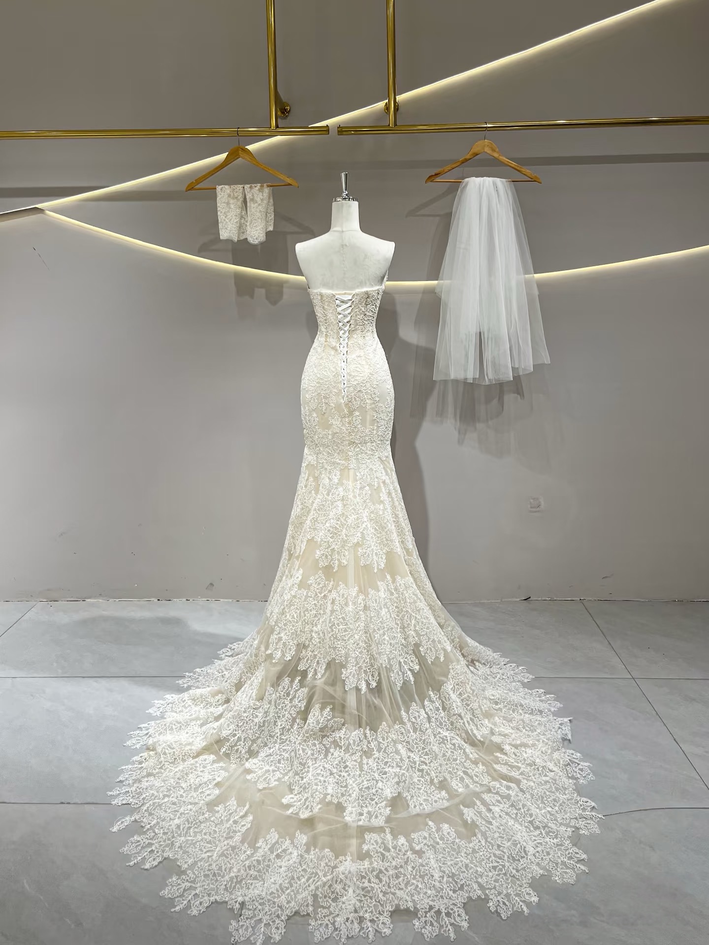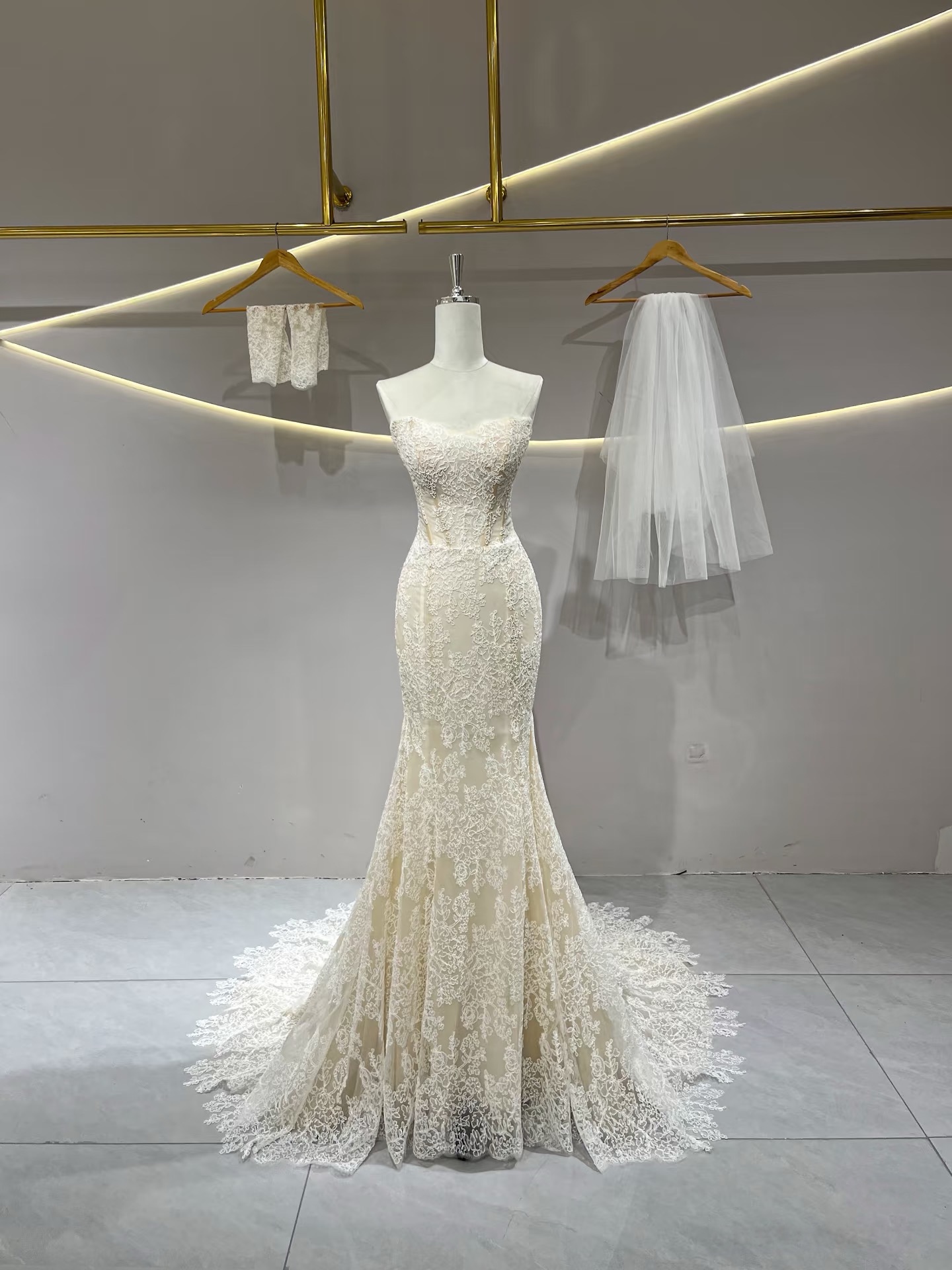 Lovely Champagne Off the Shoulder Mermaid Lace Wedding Bridal Dress, Unique Custom Reception Elopement Dress with Train