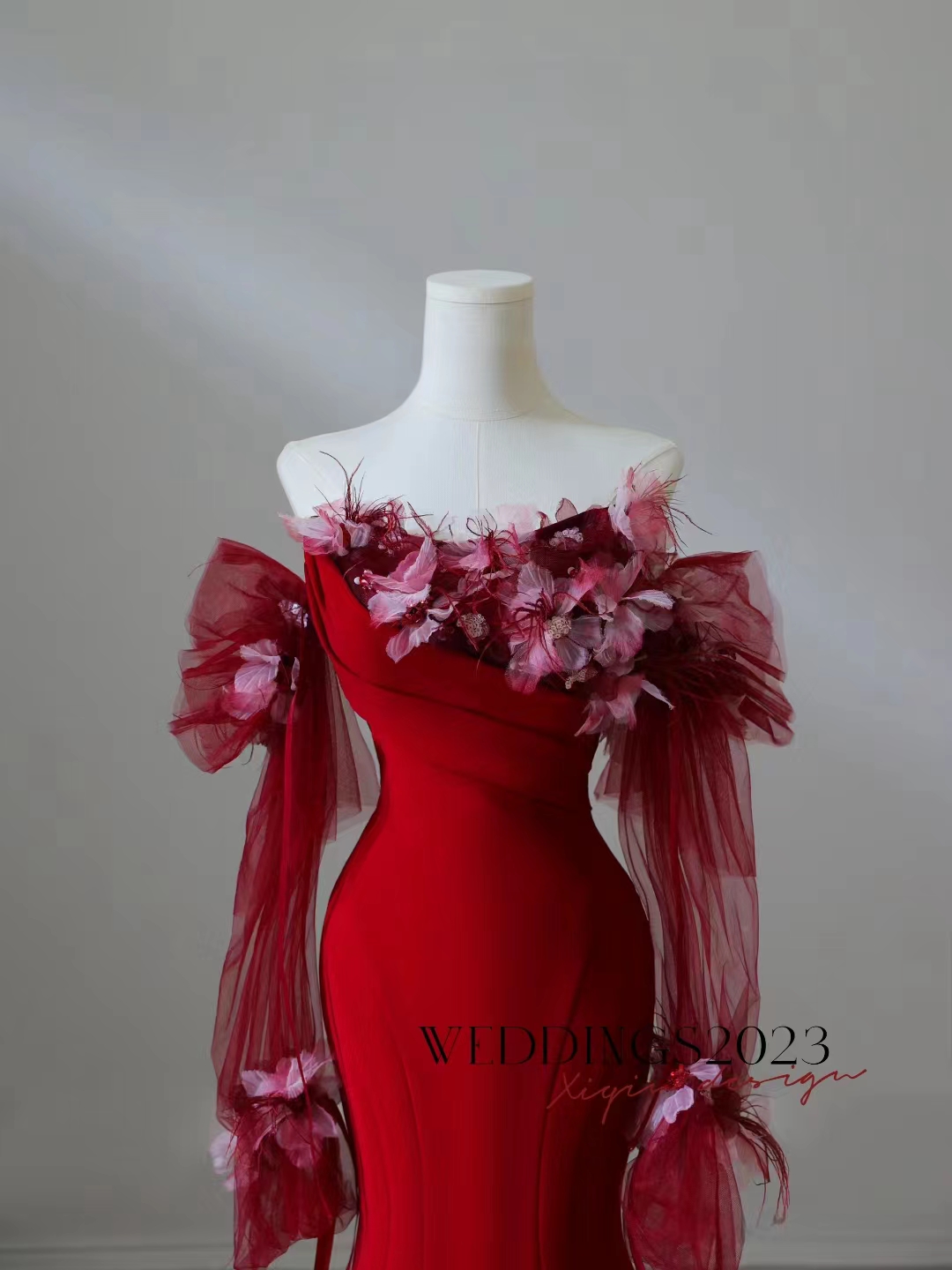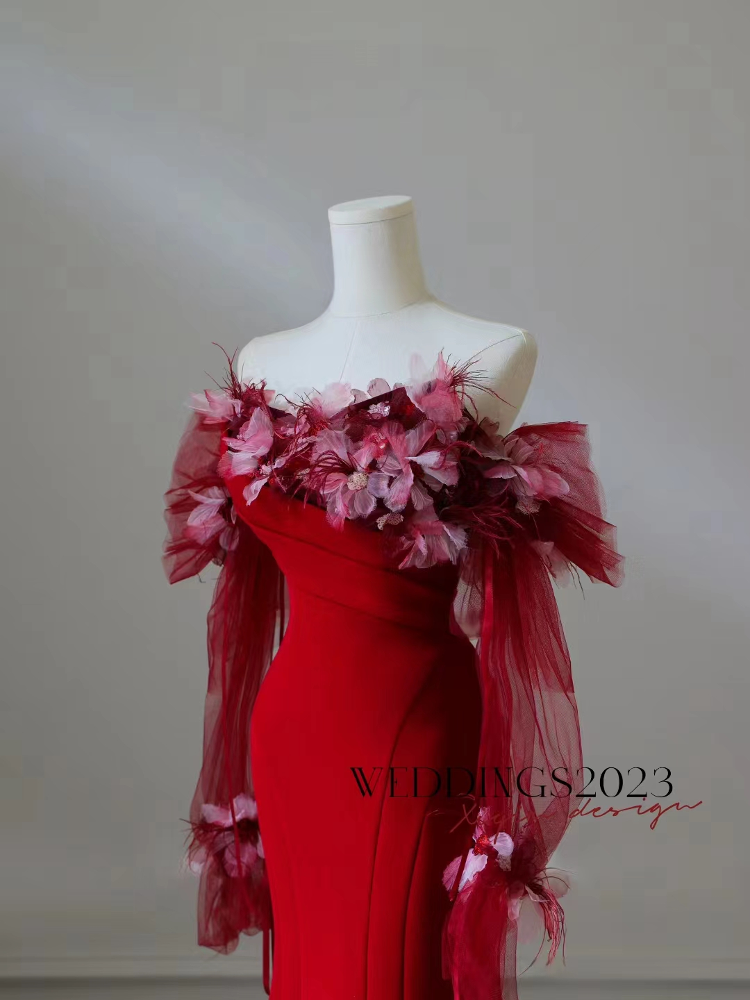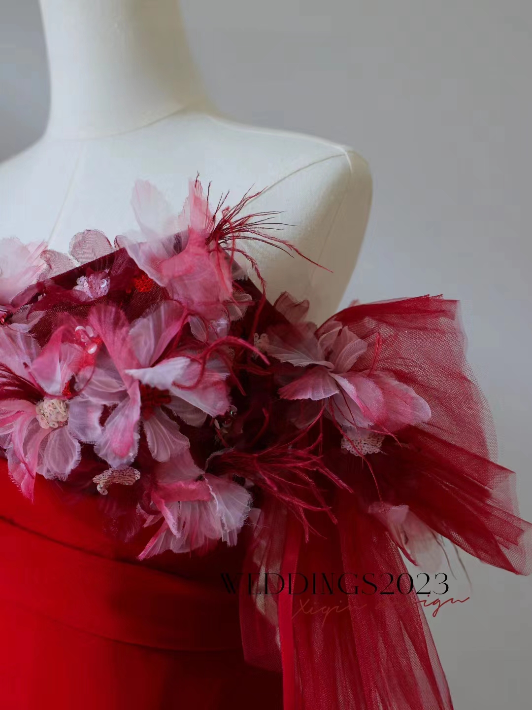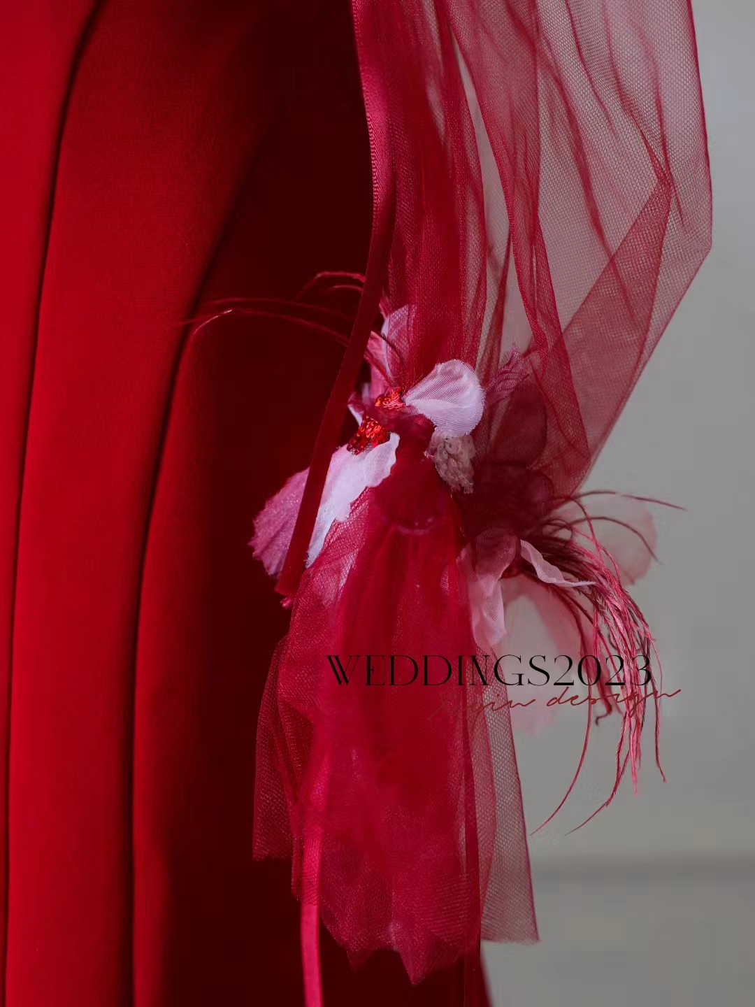 Decorative Details: Pink floral and feather embellishments on the shoulders create a light and airy look, adding a romantic touch to the red palette. The fabric drapes smoothly, creating a refined and sophisticated look.