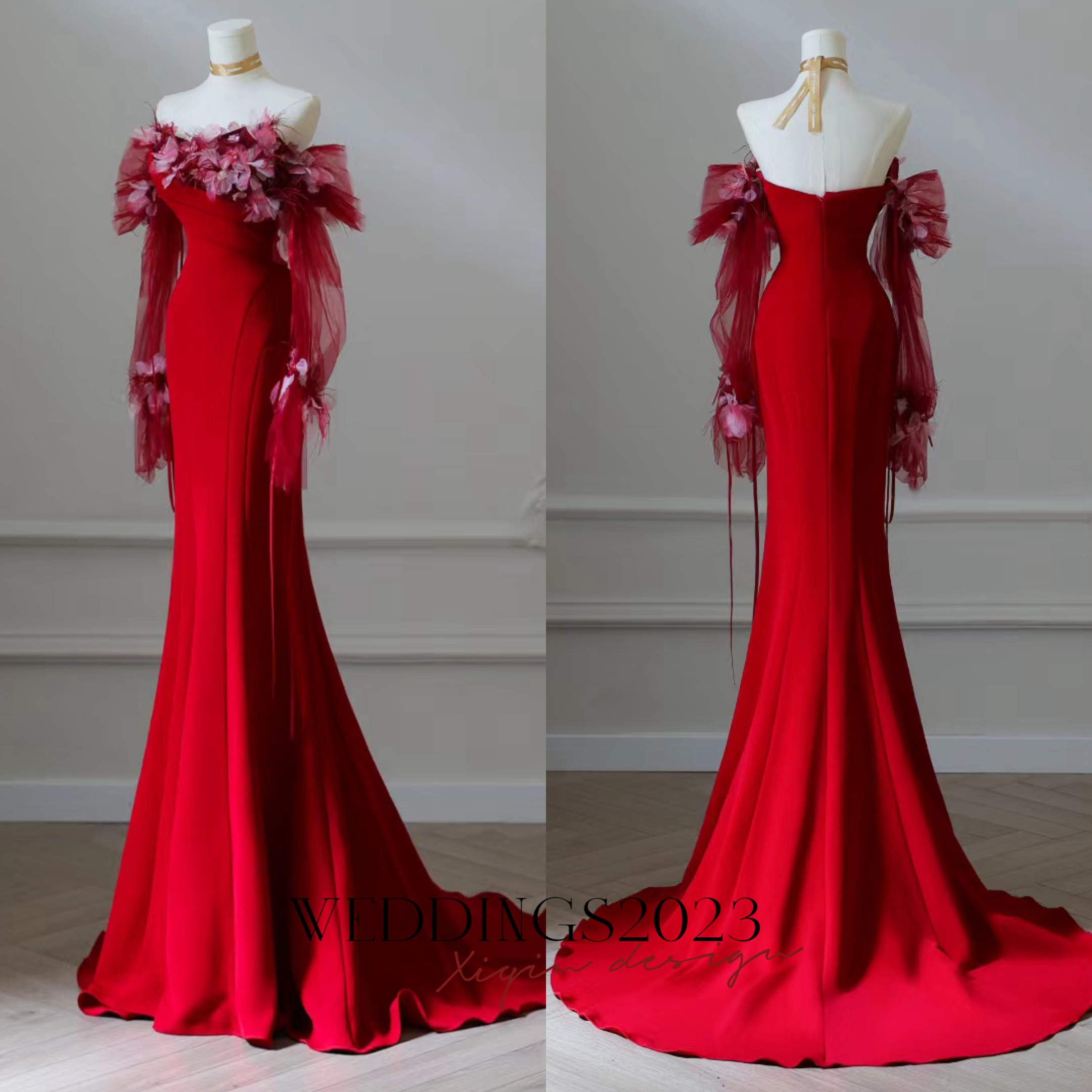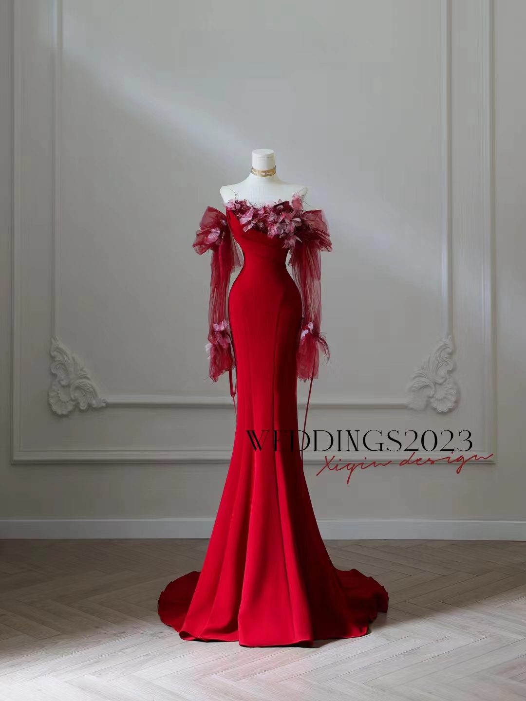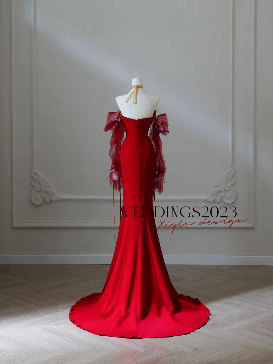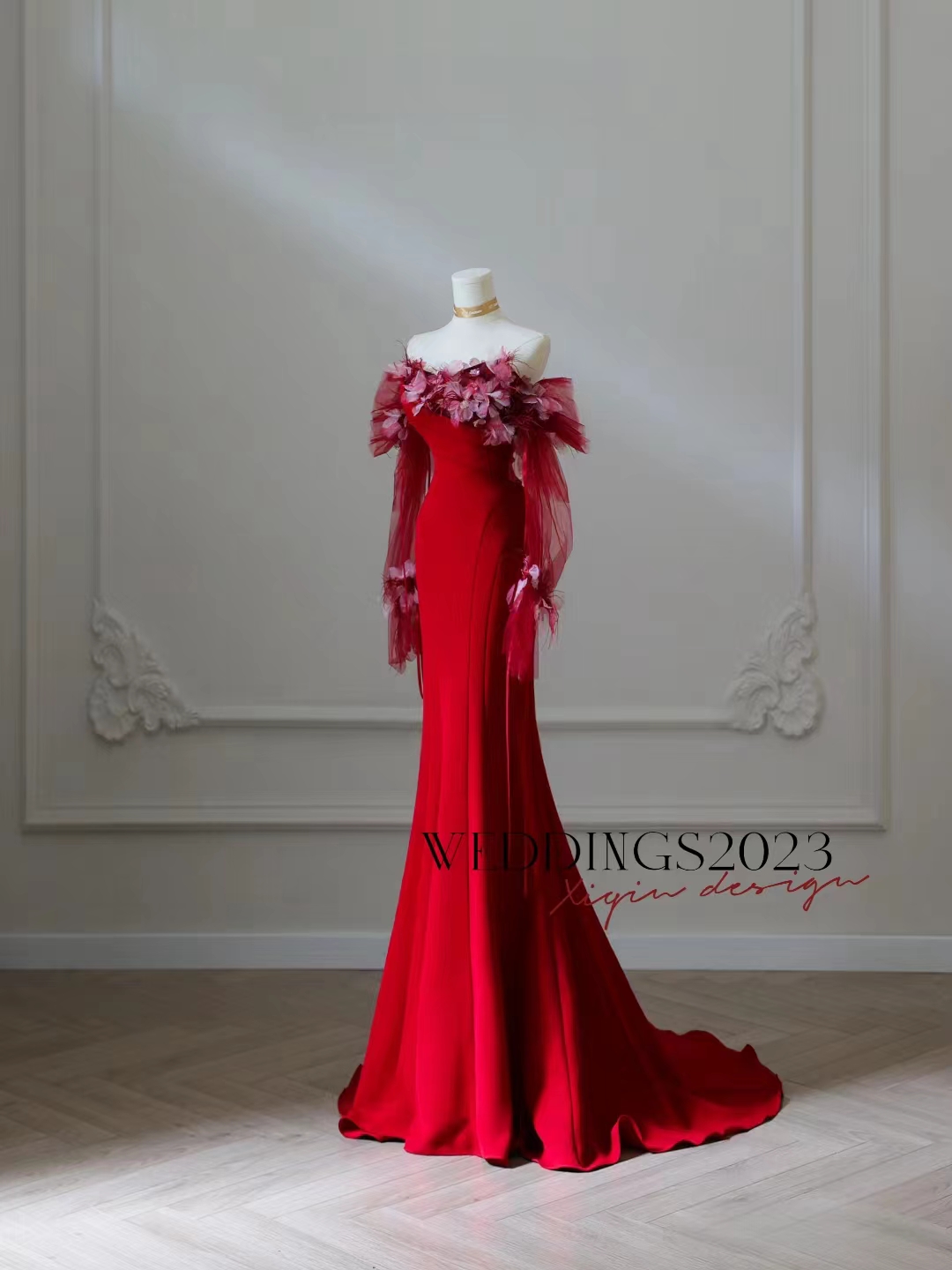 Decorative Details: Pink floral and feather embellishments on the shoulders create a light and airy look, adding a romantic touch to the red palette. The fabric drapes smoothly, creating a refined and sophisticated look.