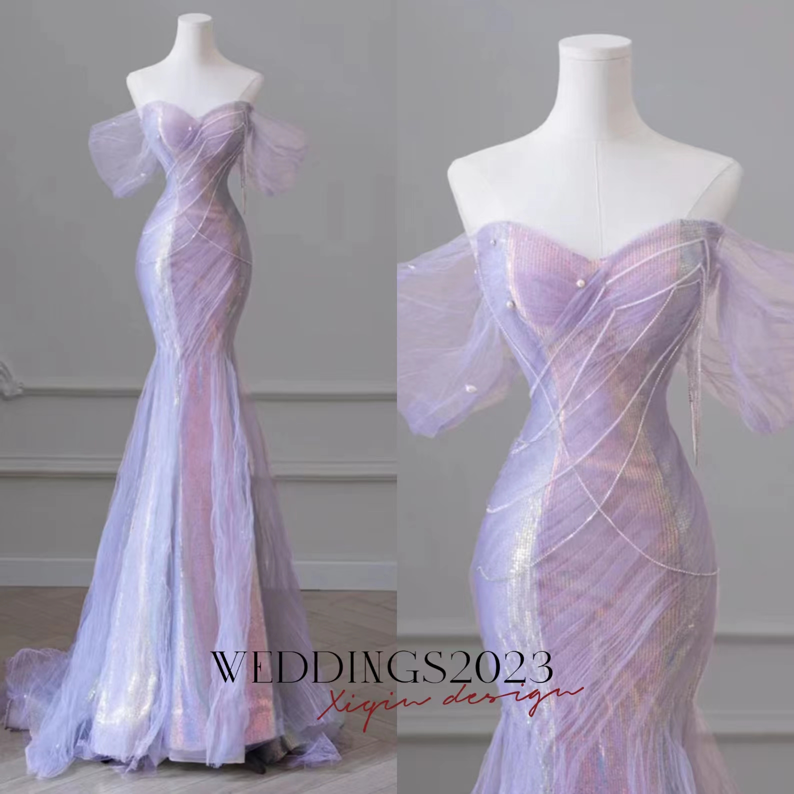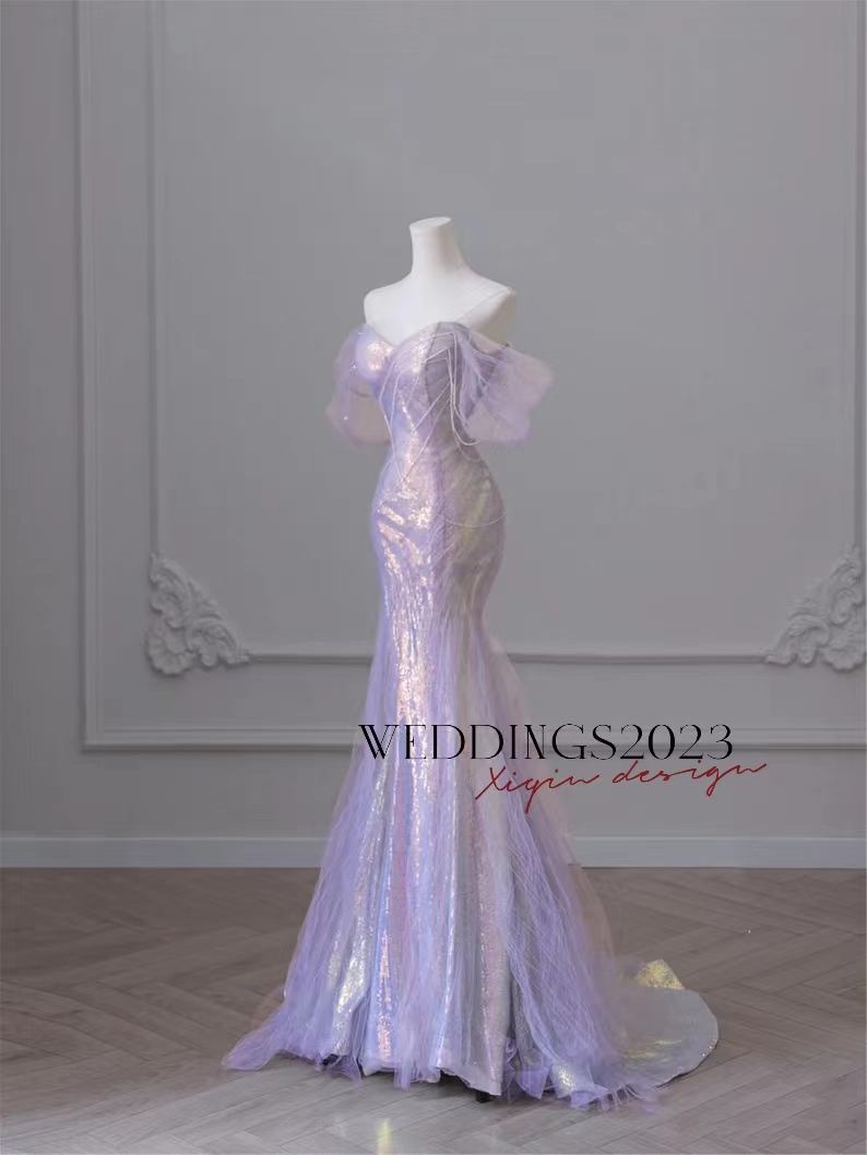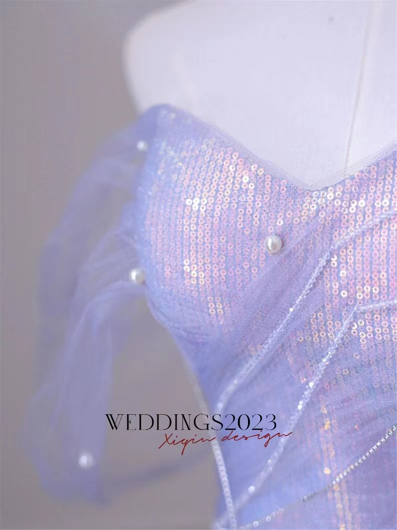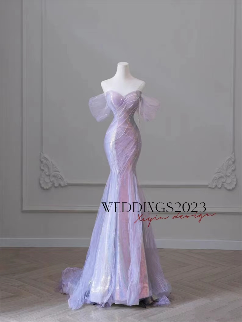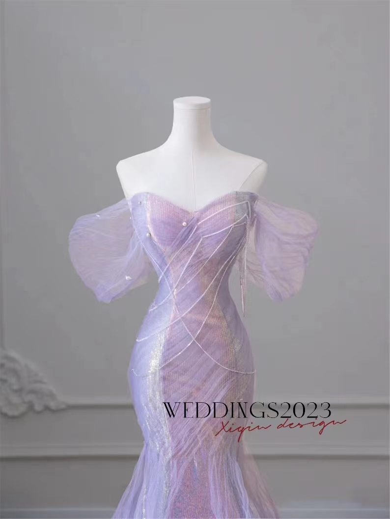 Fairy Purple Mermaid Prom Dress, Sparkly Sequin Party Dress, off Shoulder Graduaction Gown, Purple Bridal Gown, Blue Beach Wedding Dress