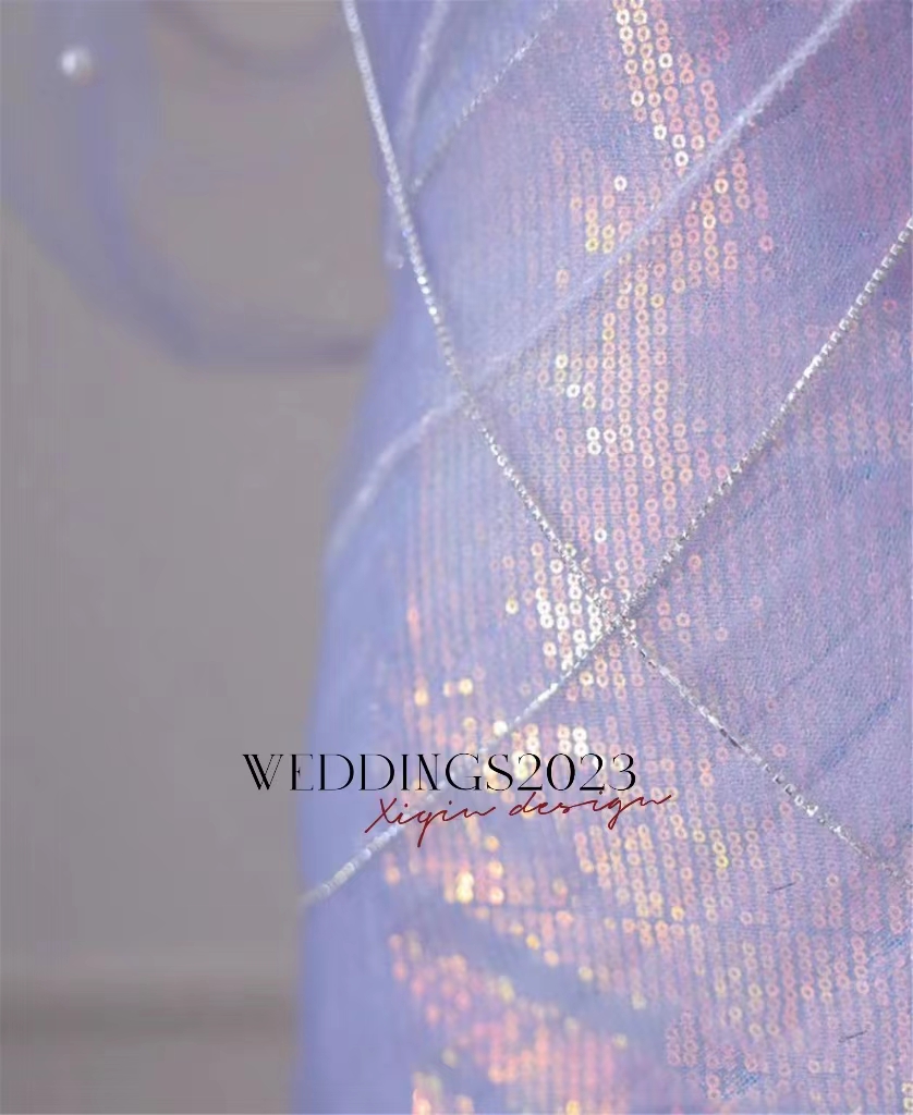 This purple mermaid wedding dress, launched by the brand "WEDDINGS2023," blends romantic fantasy with elegant sophistication, perfect for weddings seeking a unique visual impact.