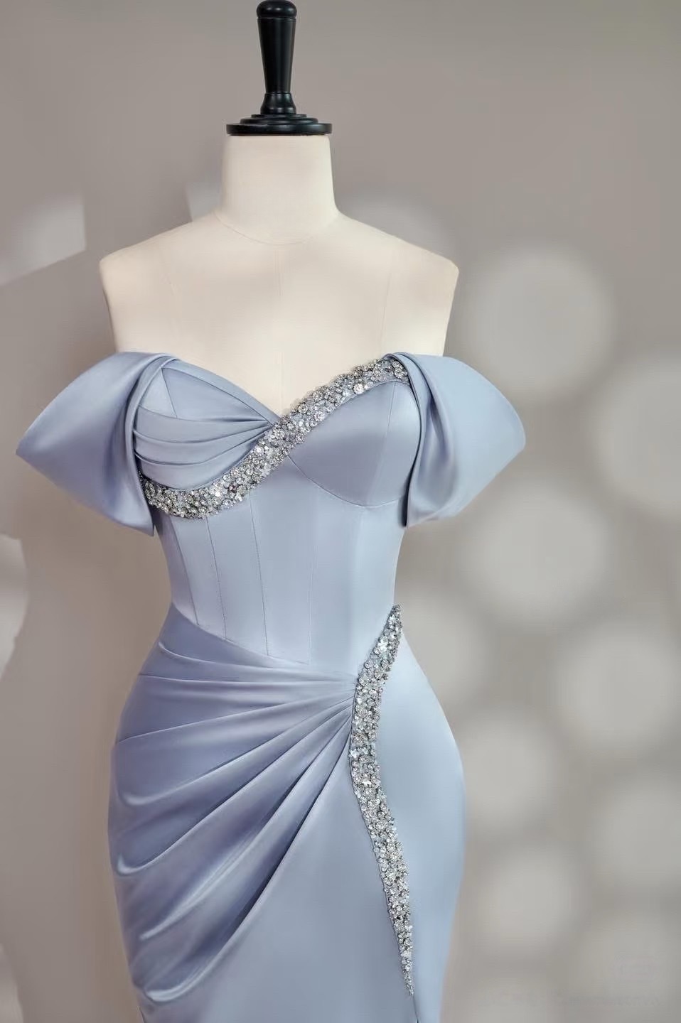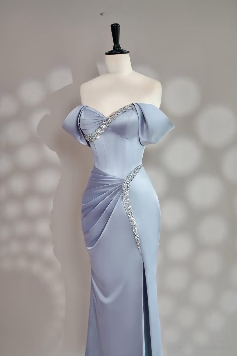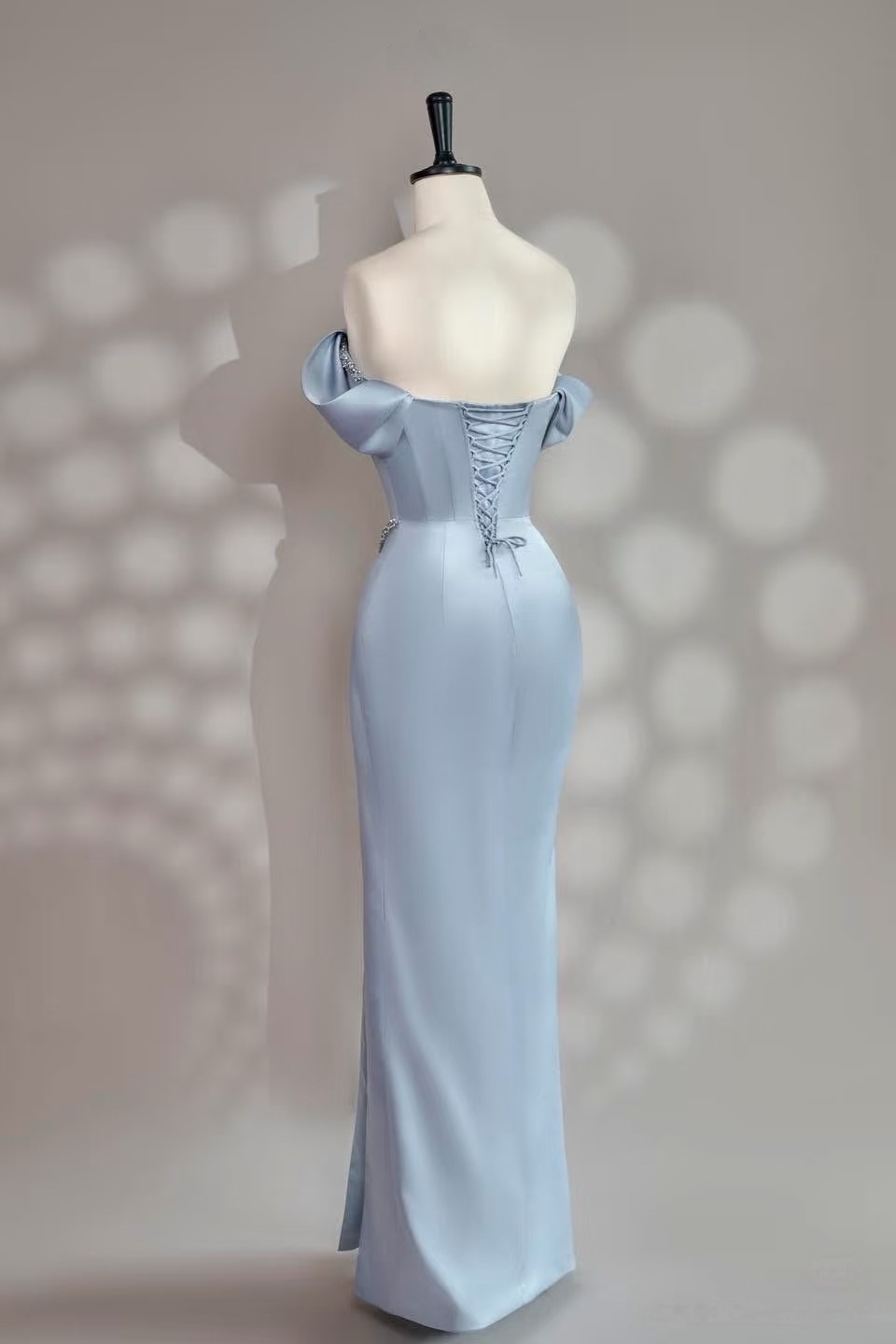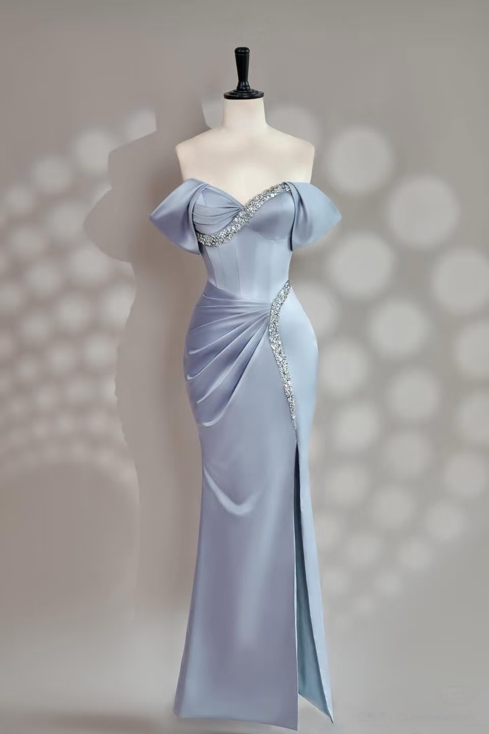 Fairy Light Blue Beaded Satin Ball Gown, Light Blue Strapless Evening Dress, Prom Dress, Maxi Satin Dress, Wedding Party Dress, Sky Blye Gown