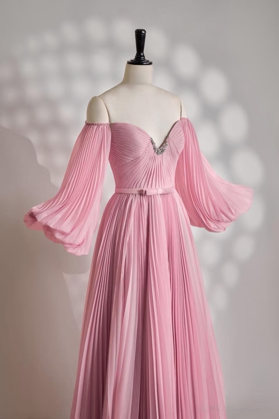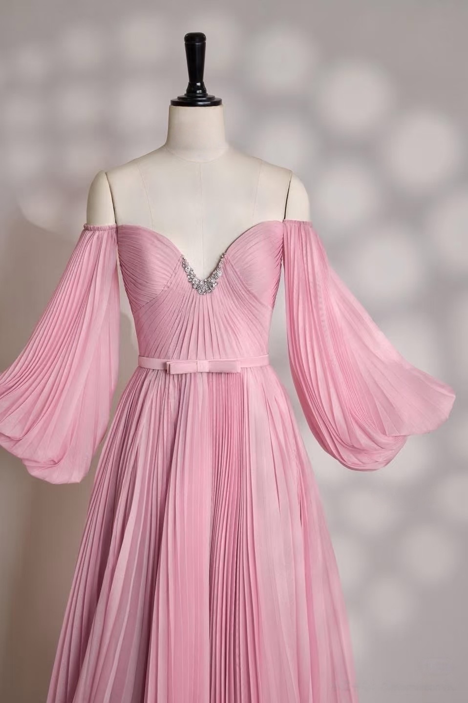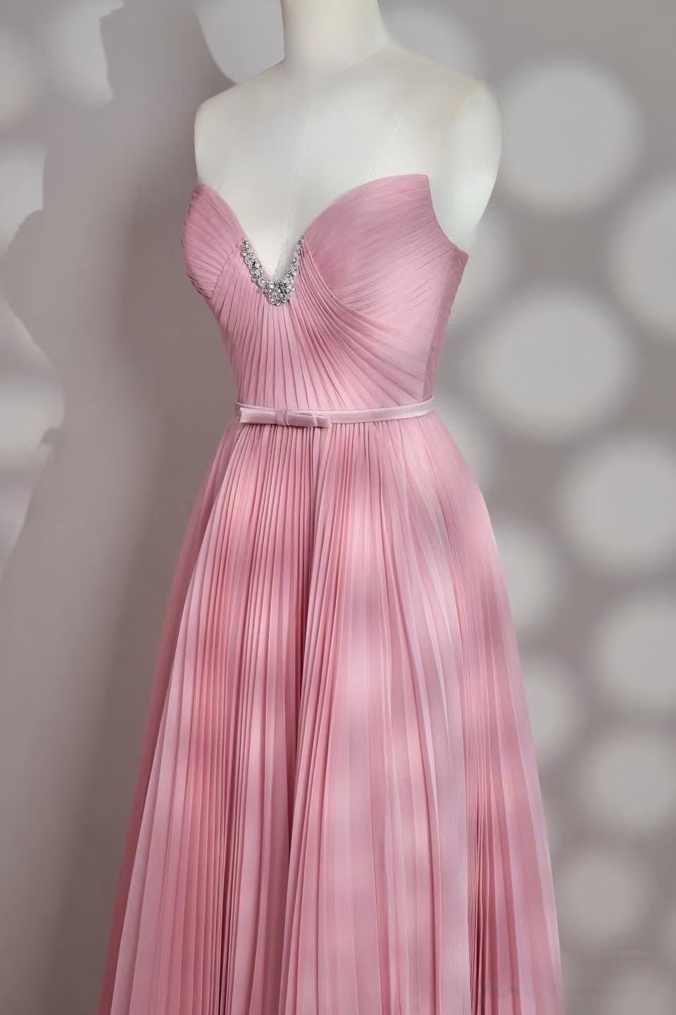 Beautiful Pink Strapless U-neck Beaded Long Dress with Beading and Detachable Sleeves