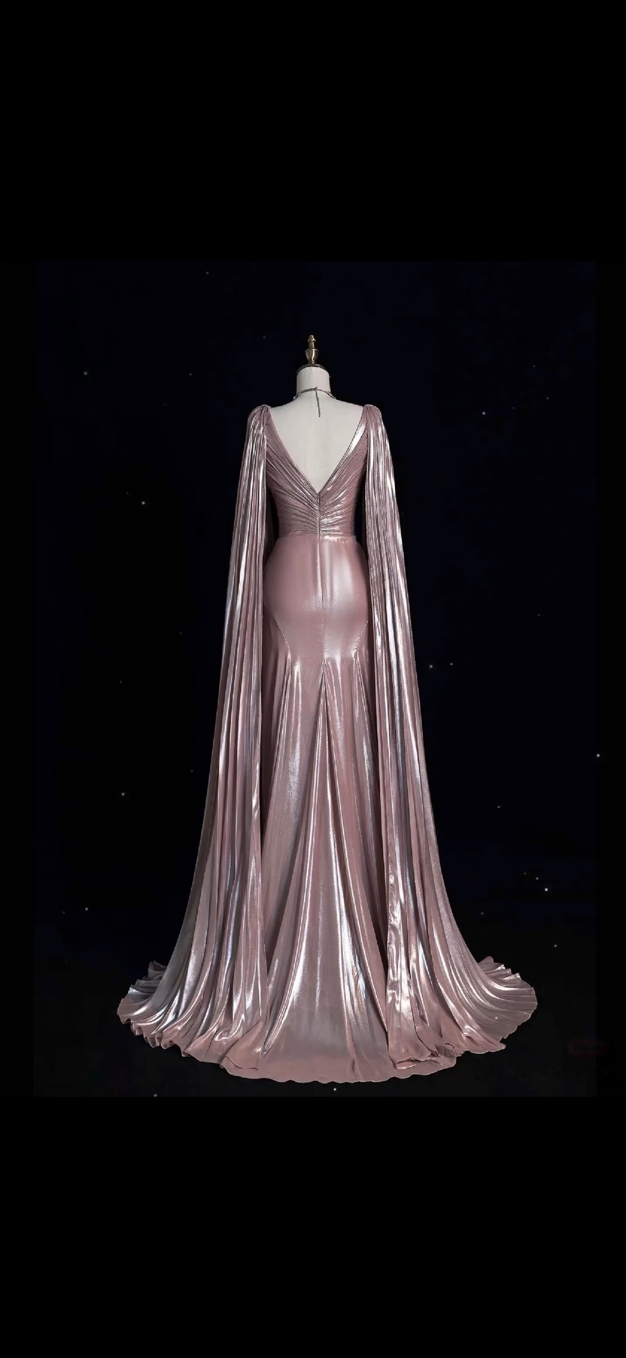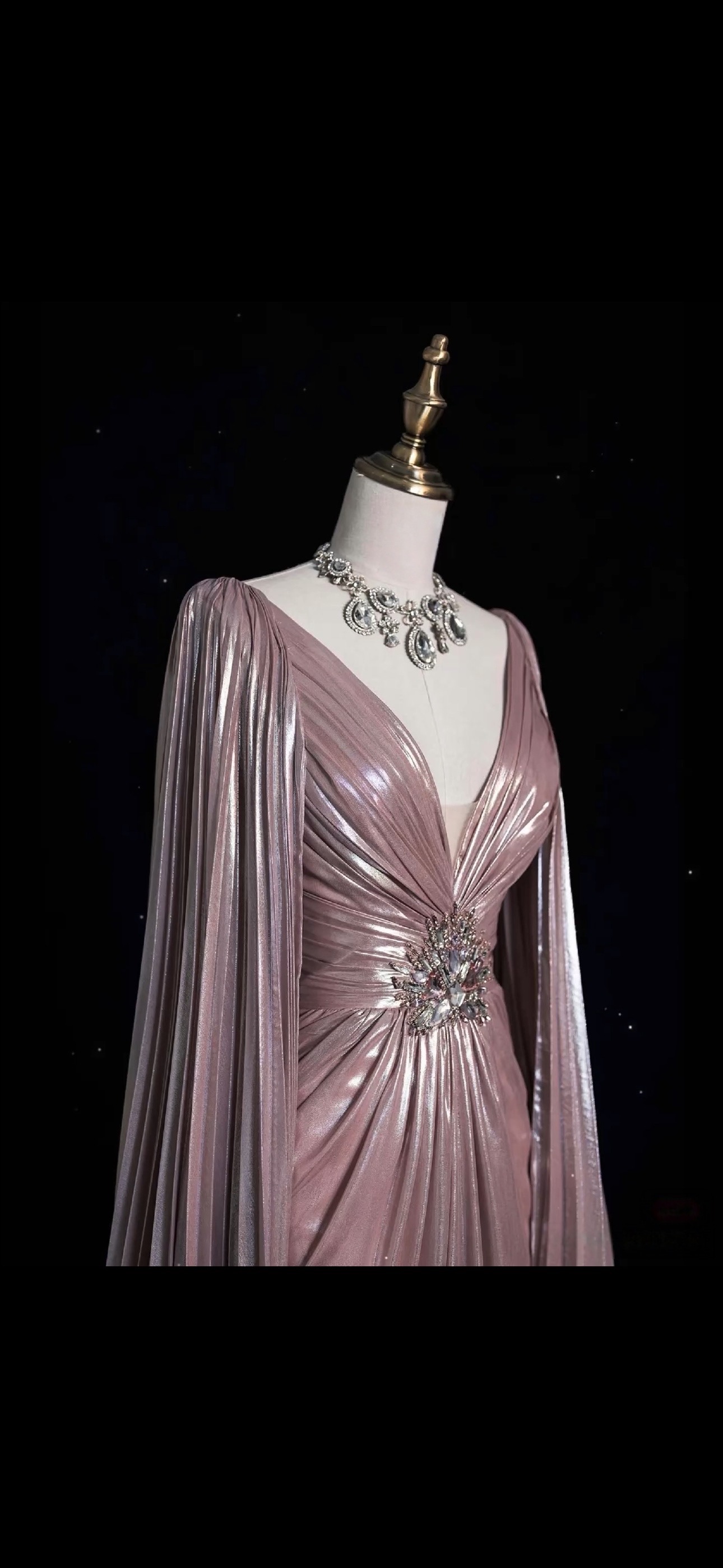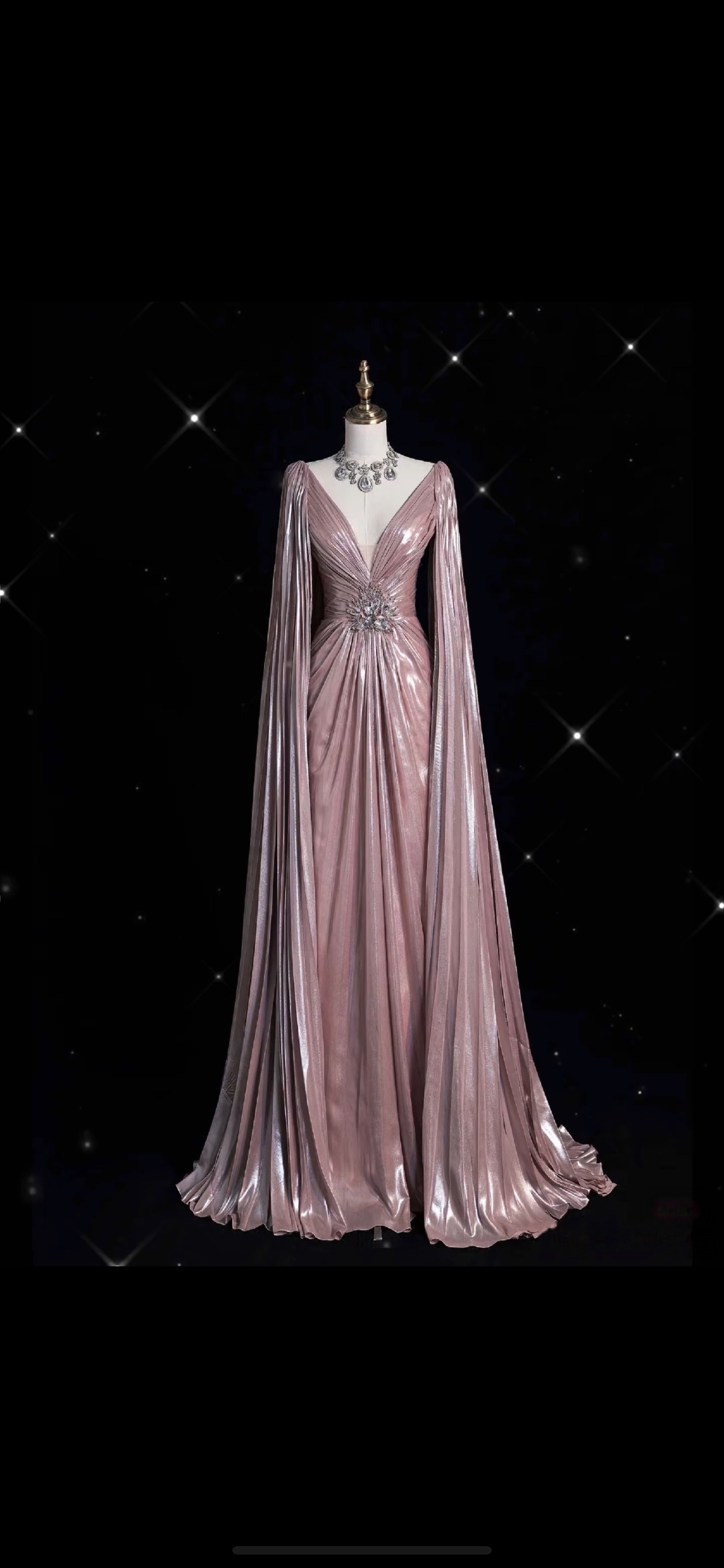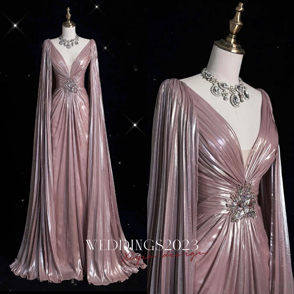 Elegant Light Pink Deep V-neck Cape Design Pleated Waist Crystal Embellishment Formal Prom Dresses