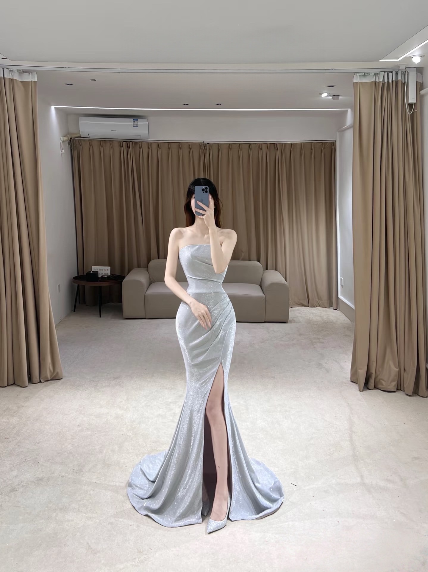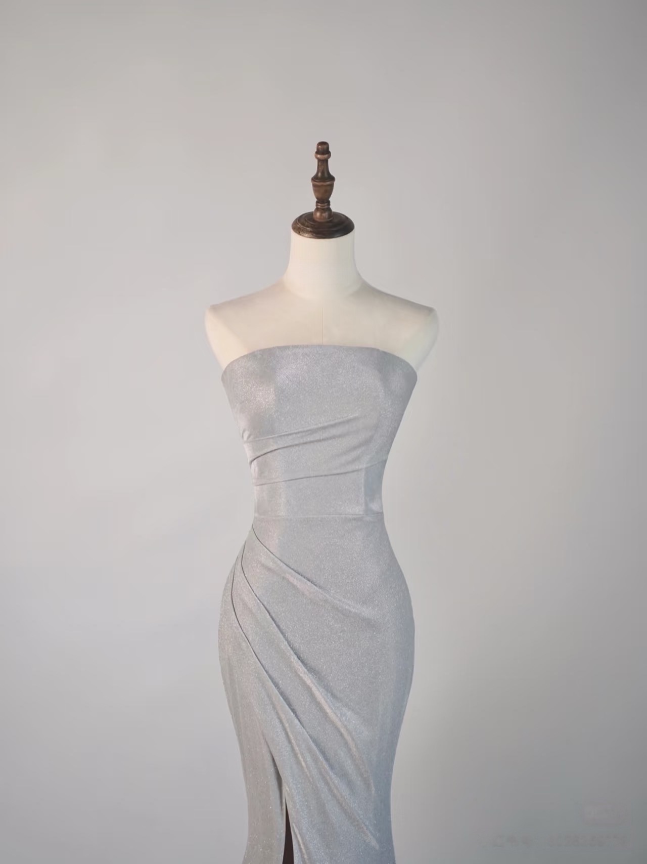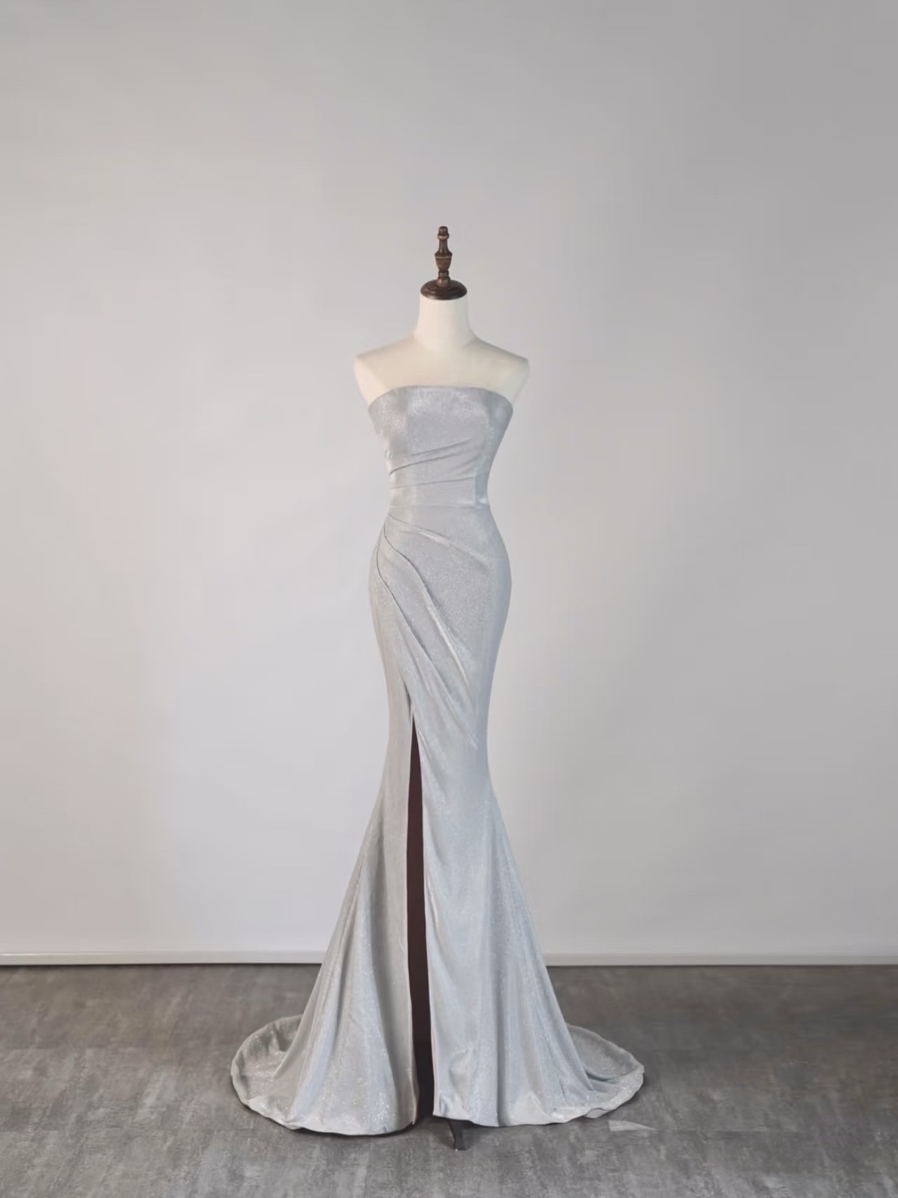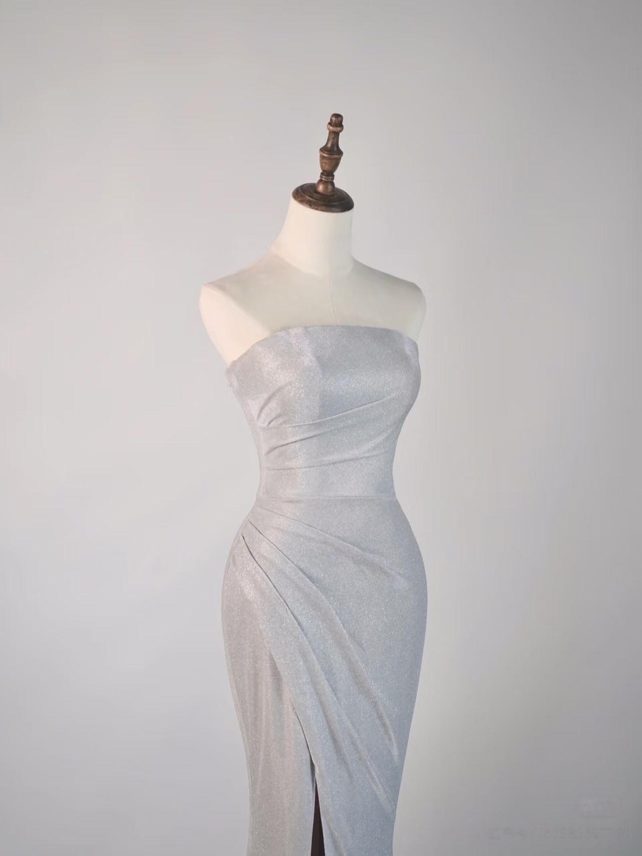 Sexy Silver Strapless Slit Floor Length Evening Eress