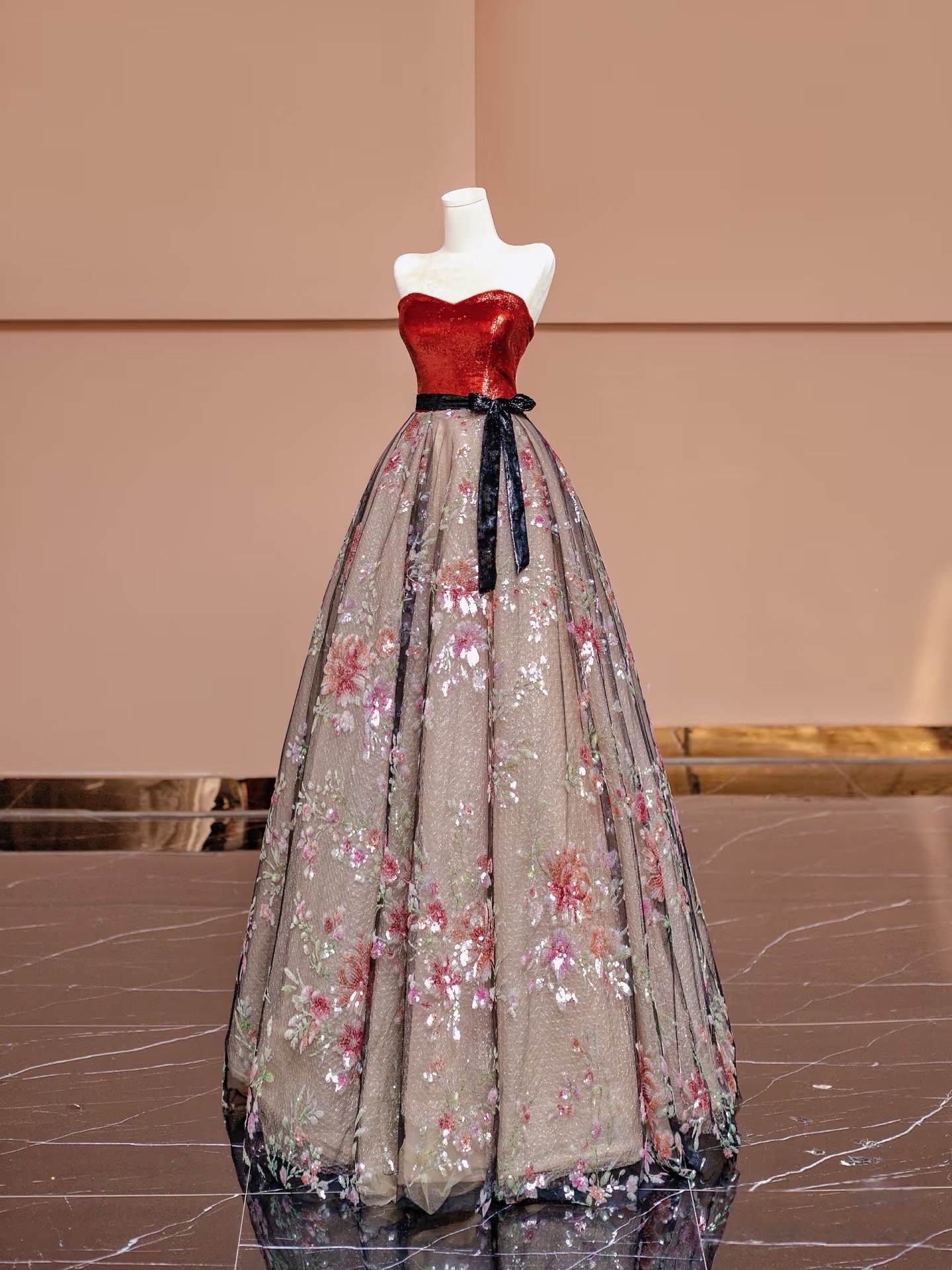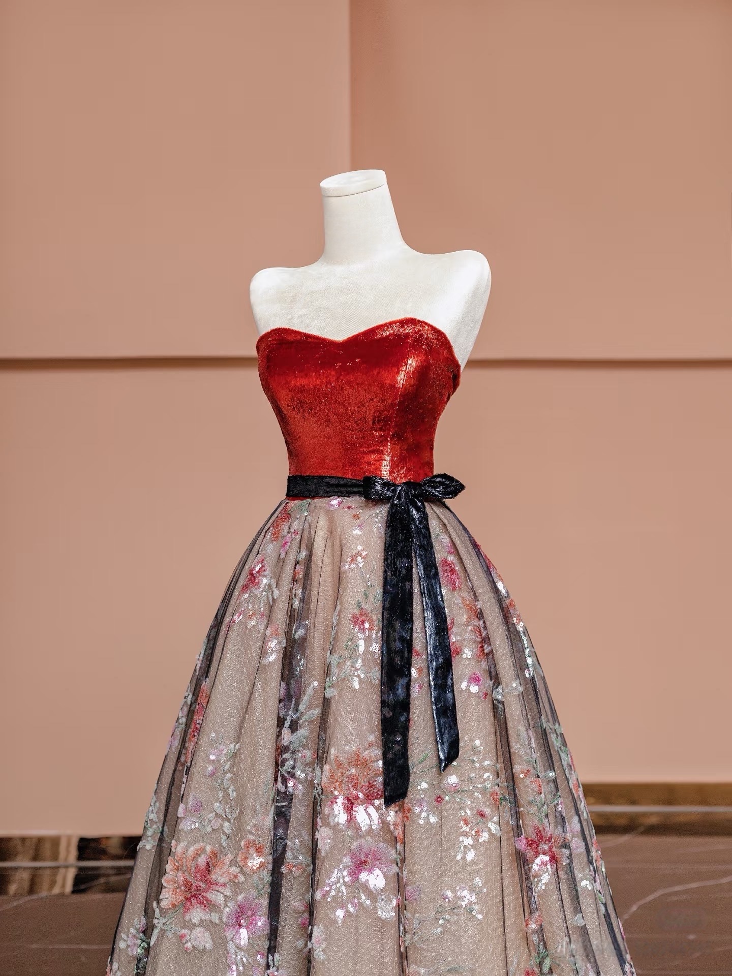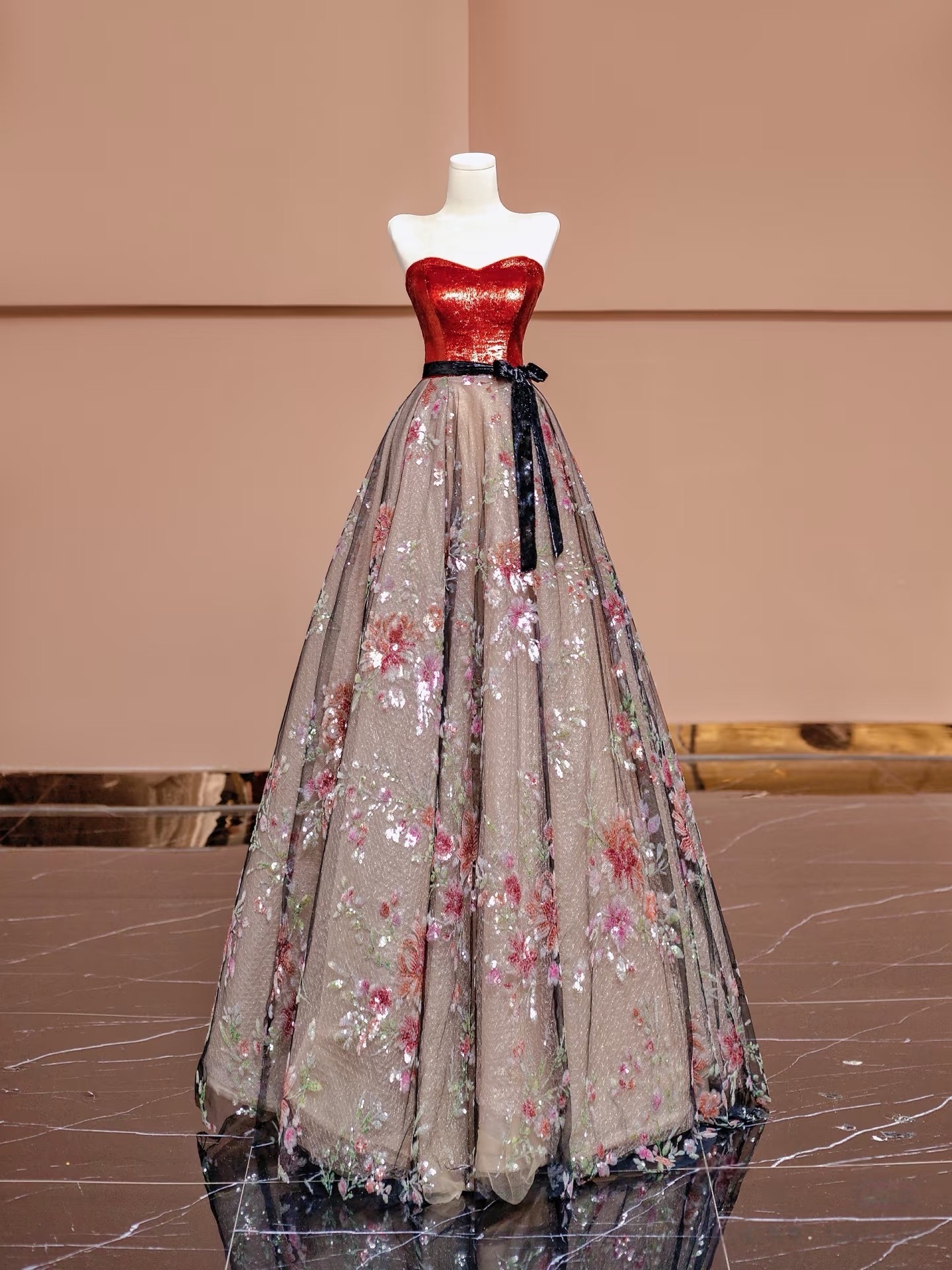 Red Lace with Black Belt A-line Floor Length Evening Dress