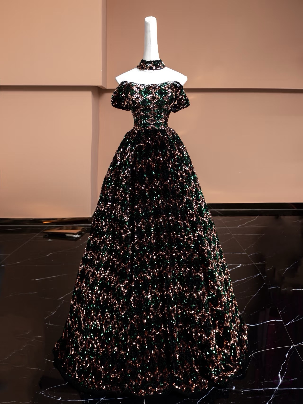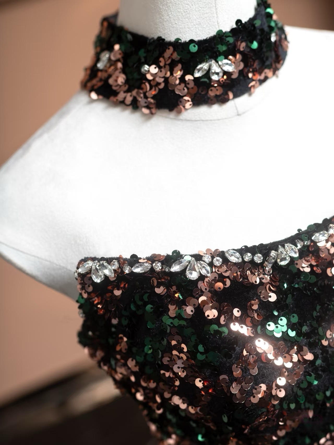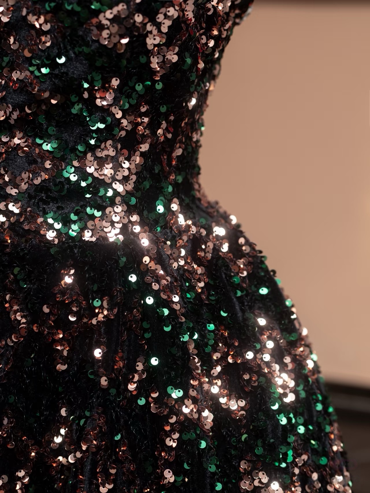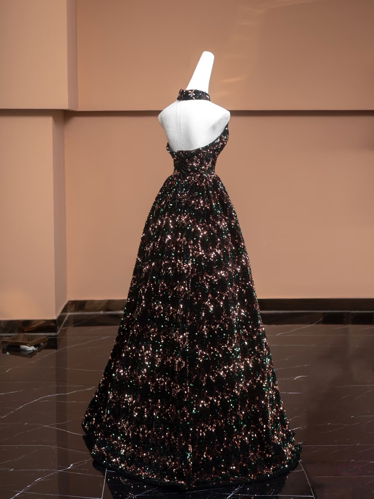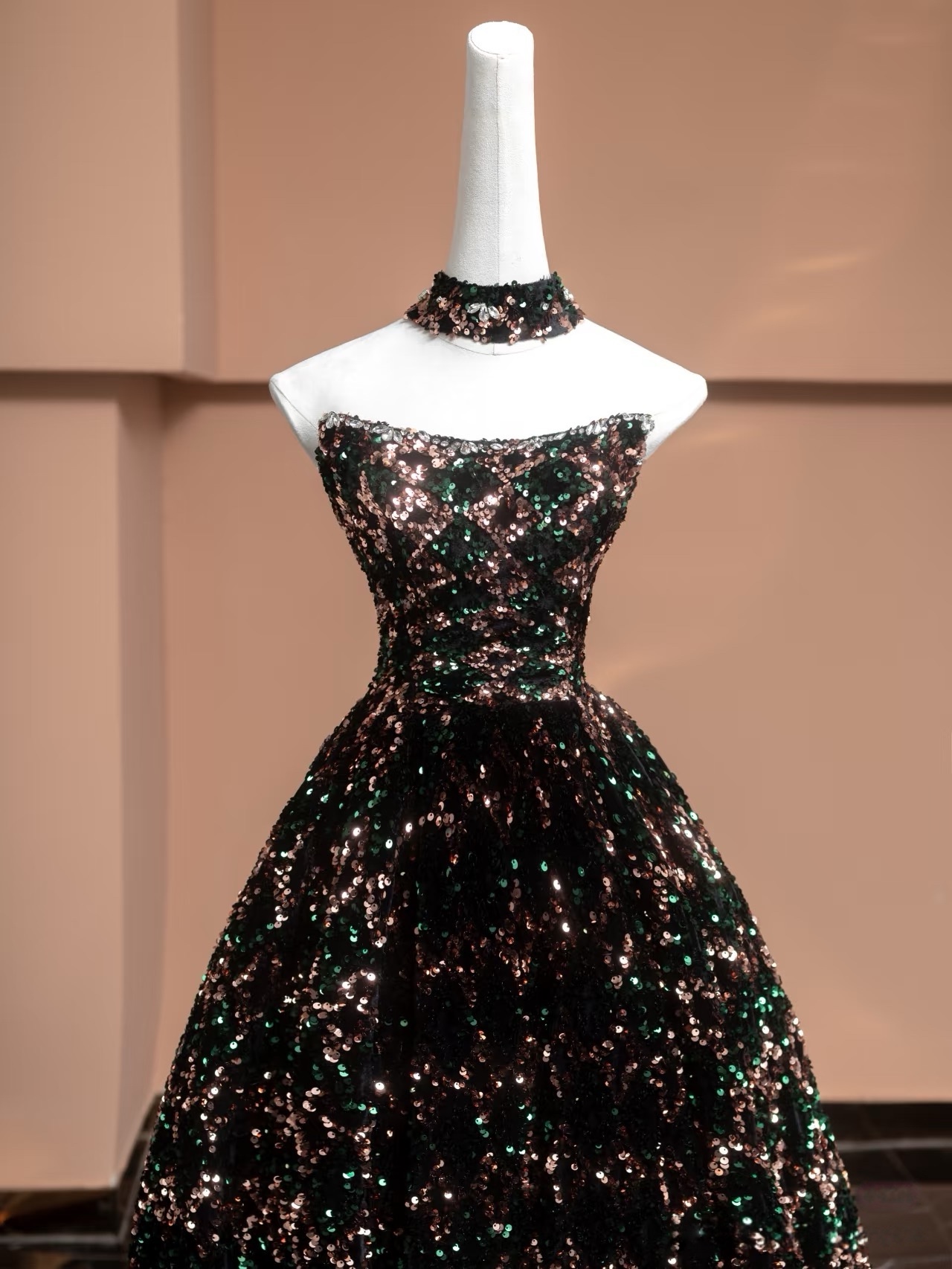 Shiny colorful sequined strapless floor-length dress with a neck gaiter,Detachable sleeves Prom Dresses