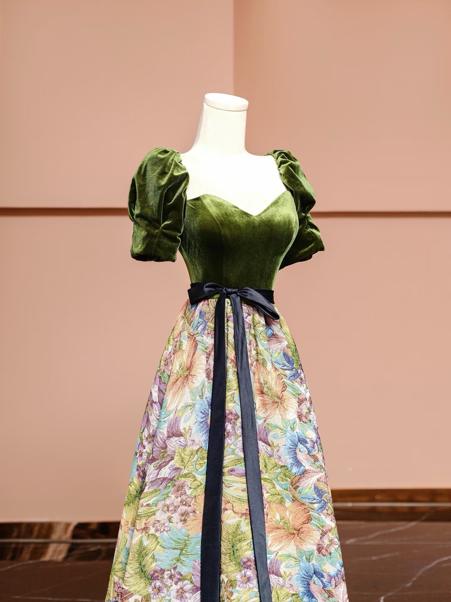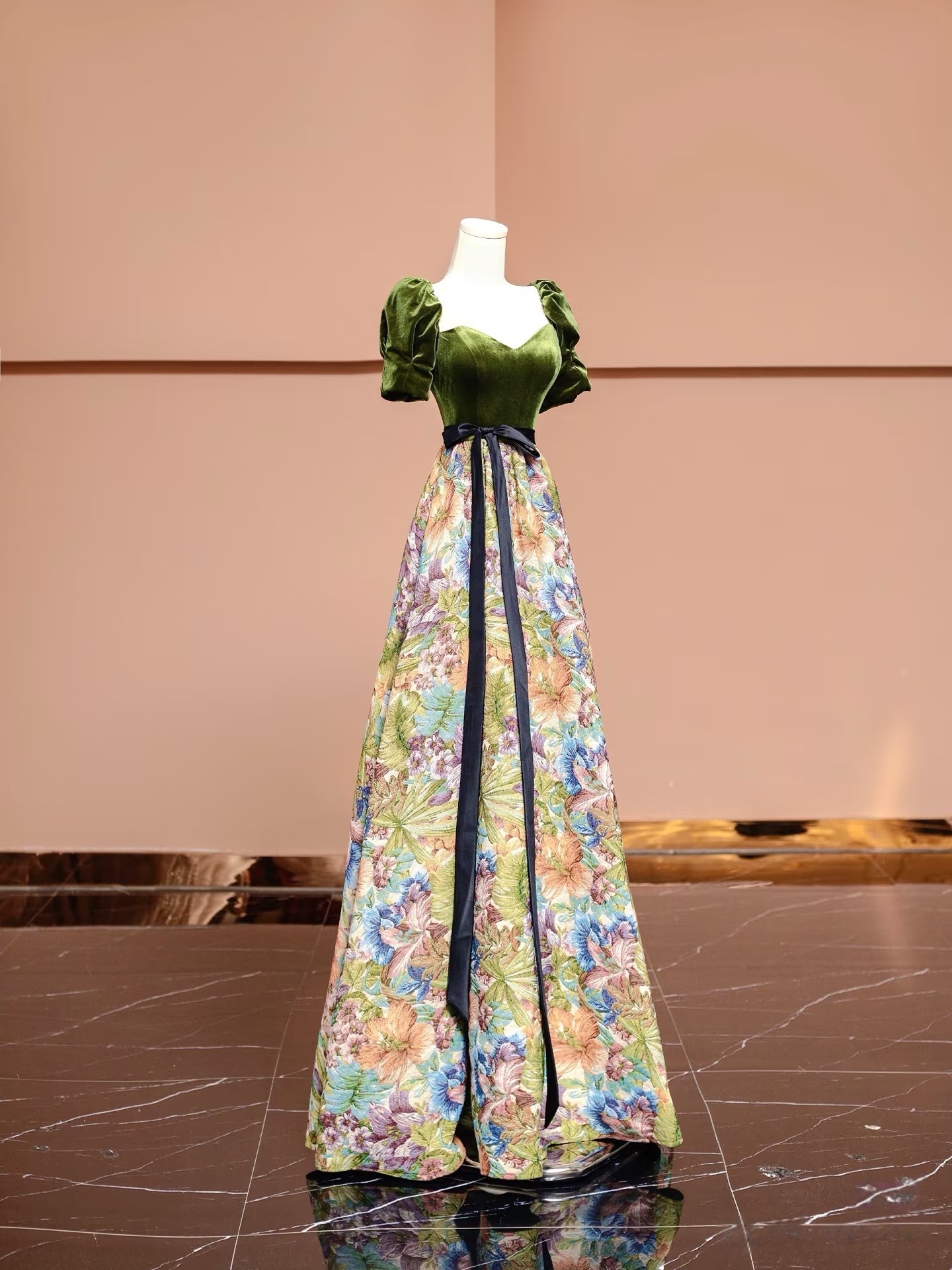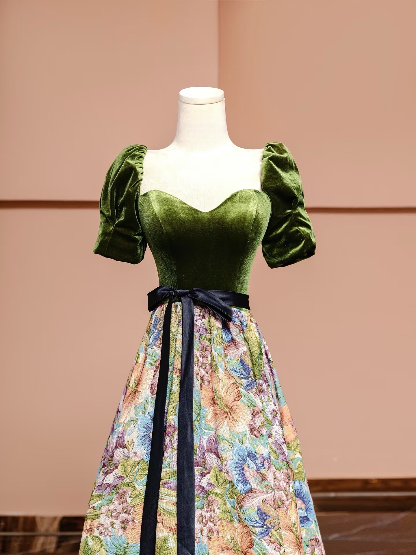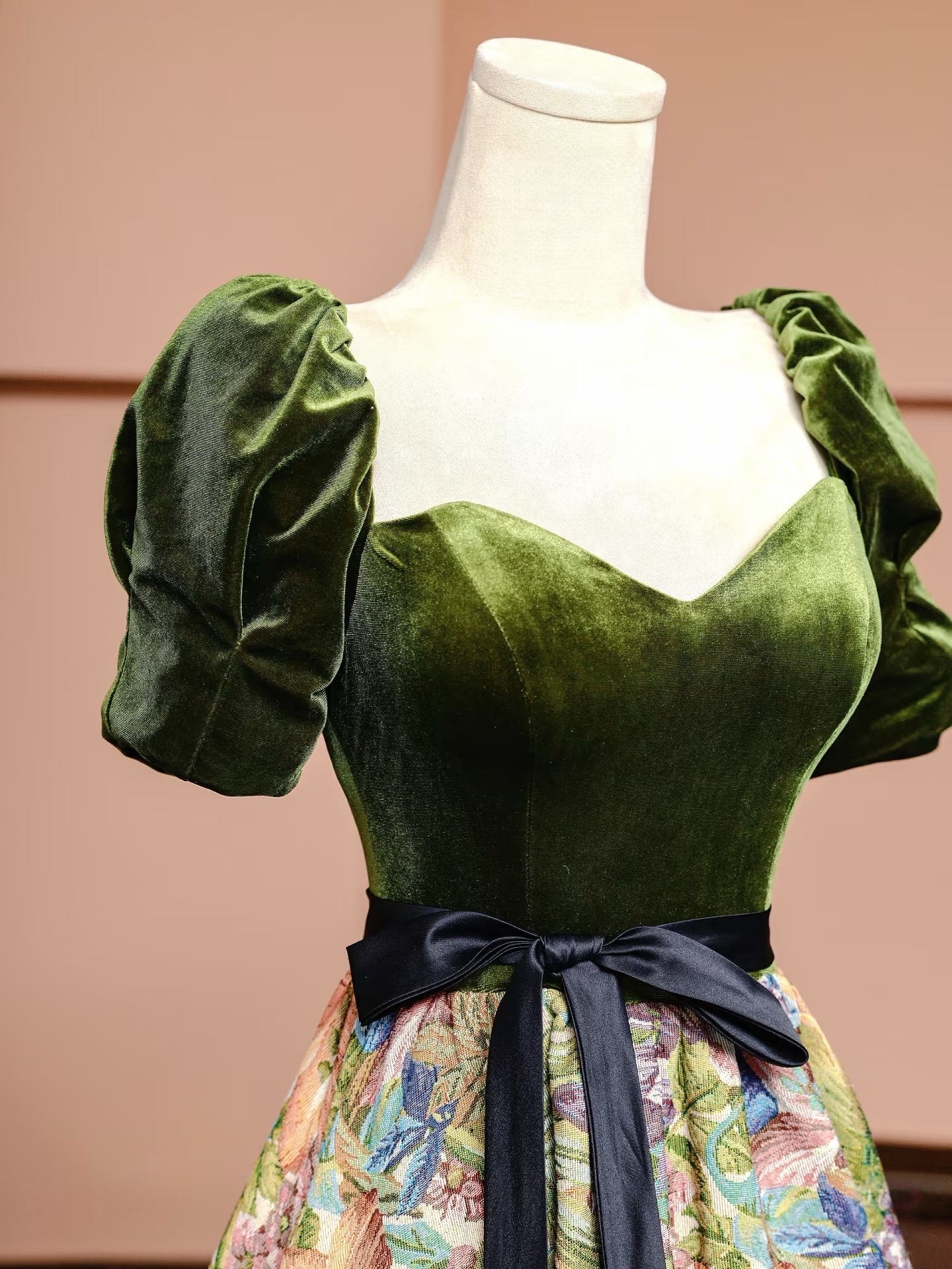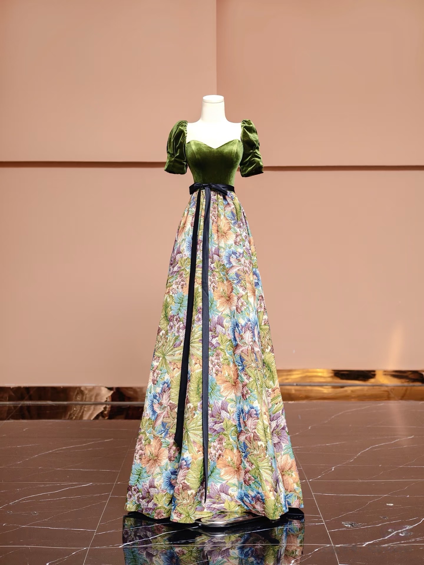 Green Velvet Maxi Dress Fall Winter Printing Party Dress Women Short Sleeve Floor Length Formal Evening Gown Elegant Holiday Gala Outfit Custom Dress