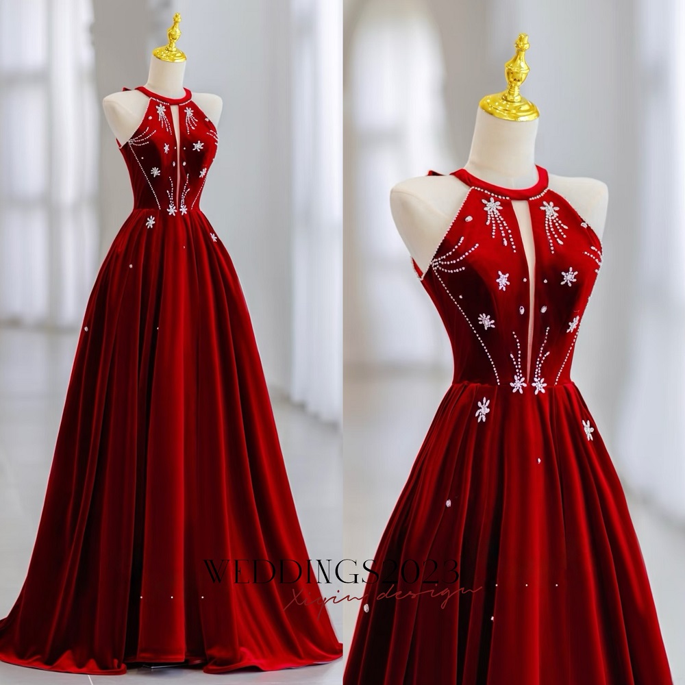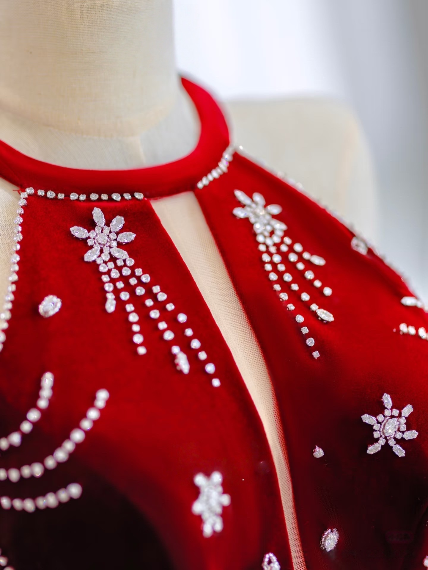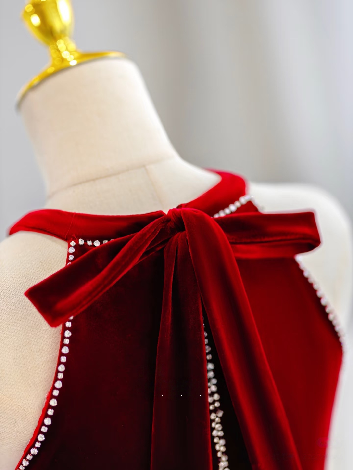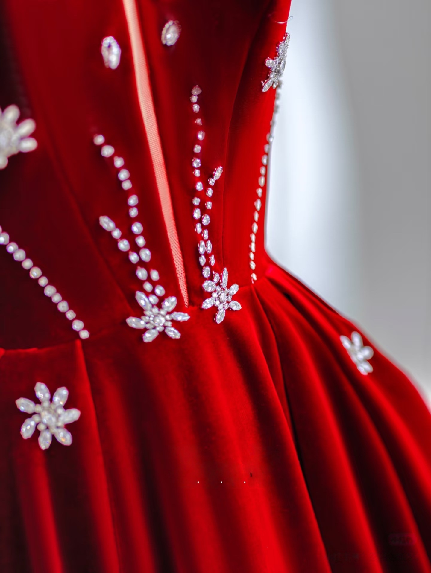 Red Velvet Beading A-line with Bow Floor Length Prom Dress