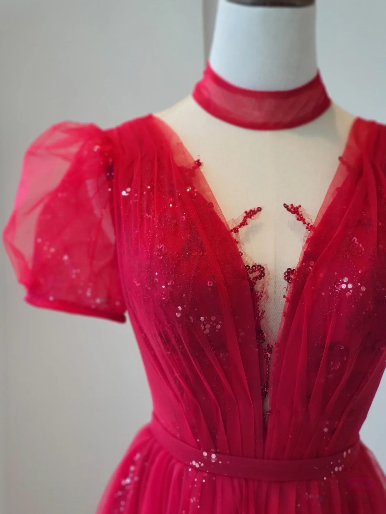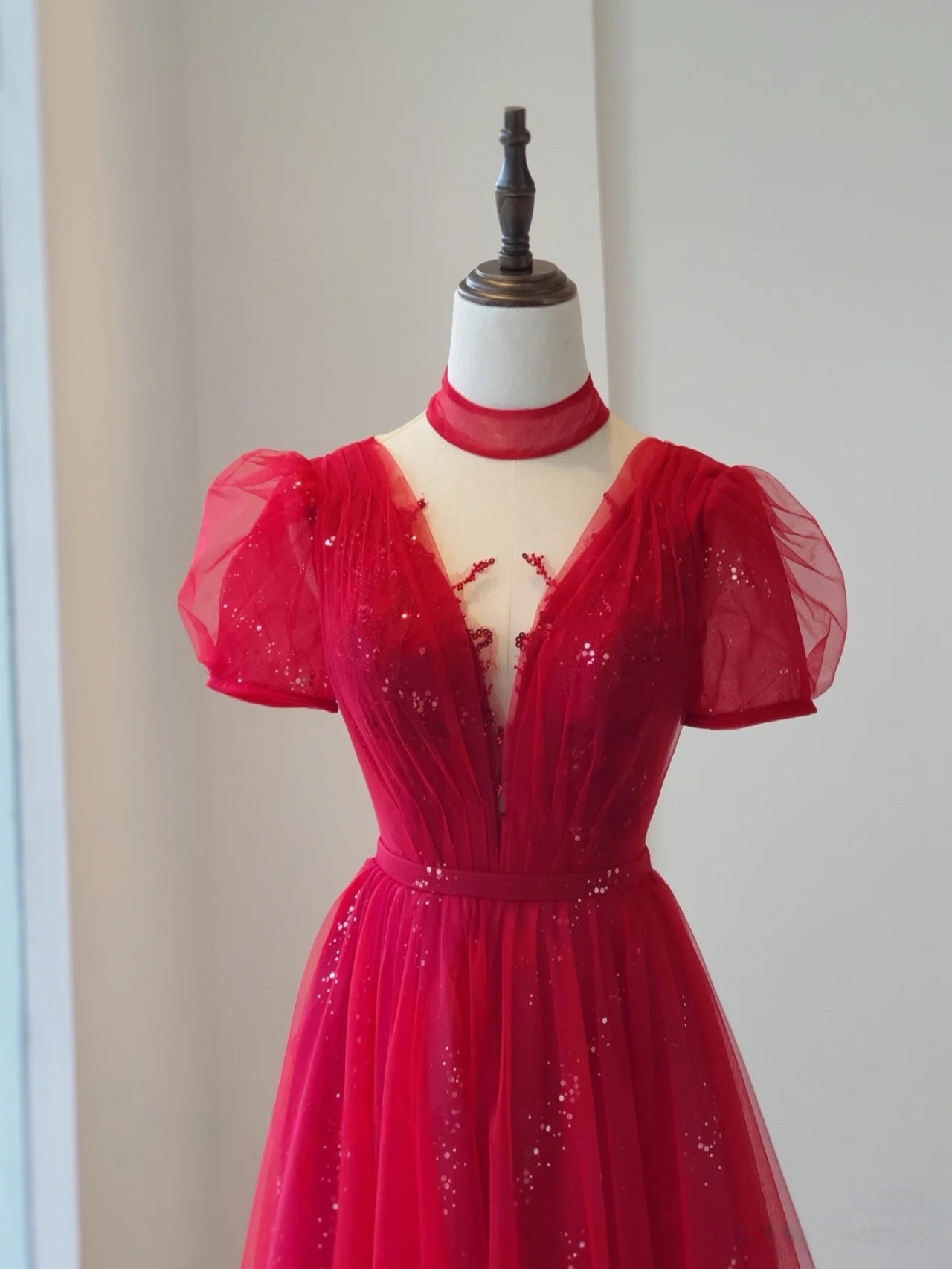 Burgundy Tulle Sequin Short Sleeves Long Prom Dress, Burgundy Evening Dress