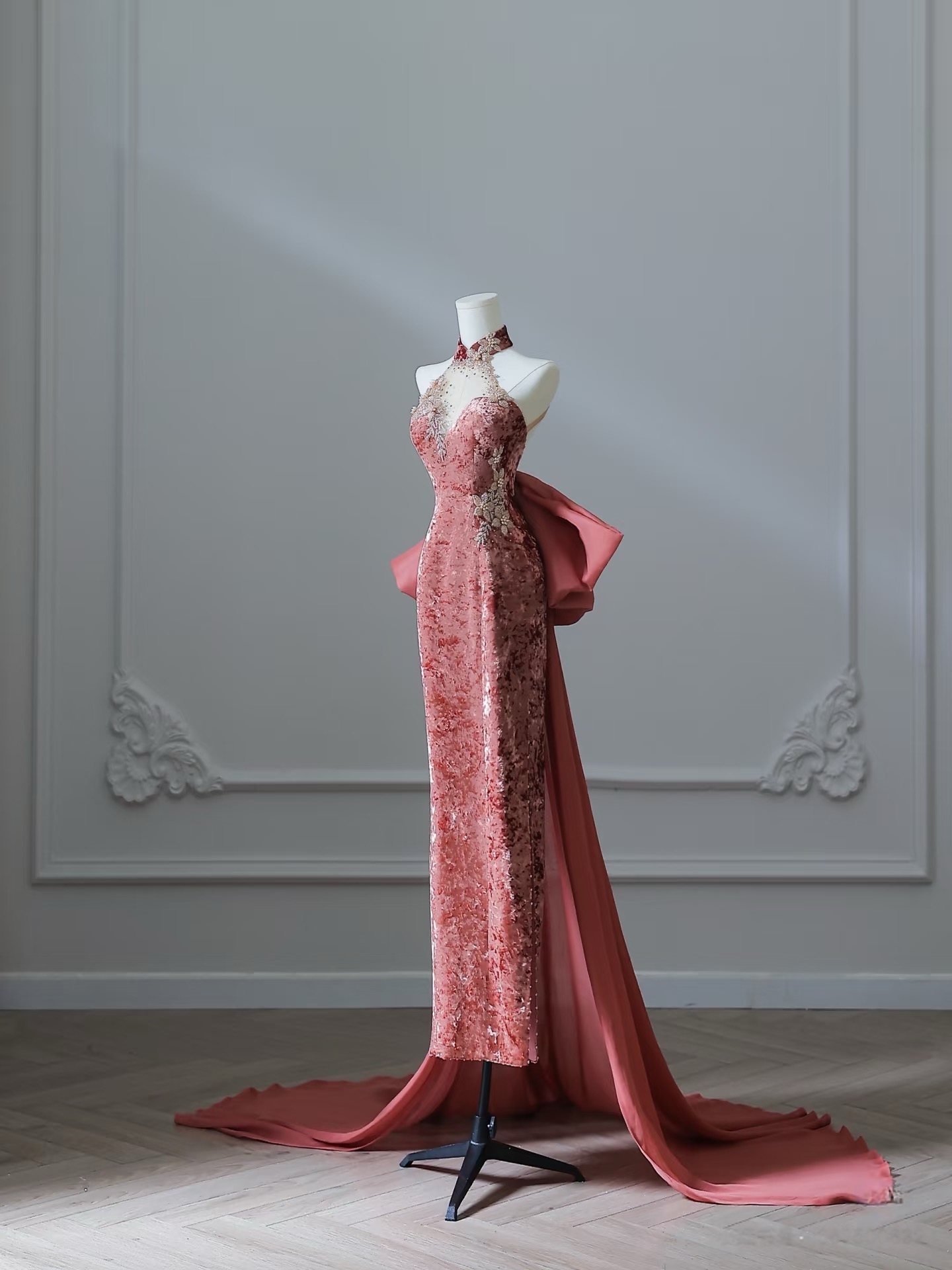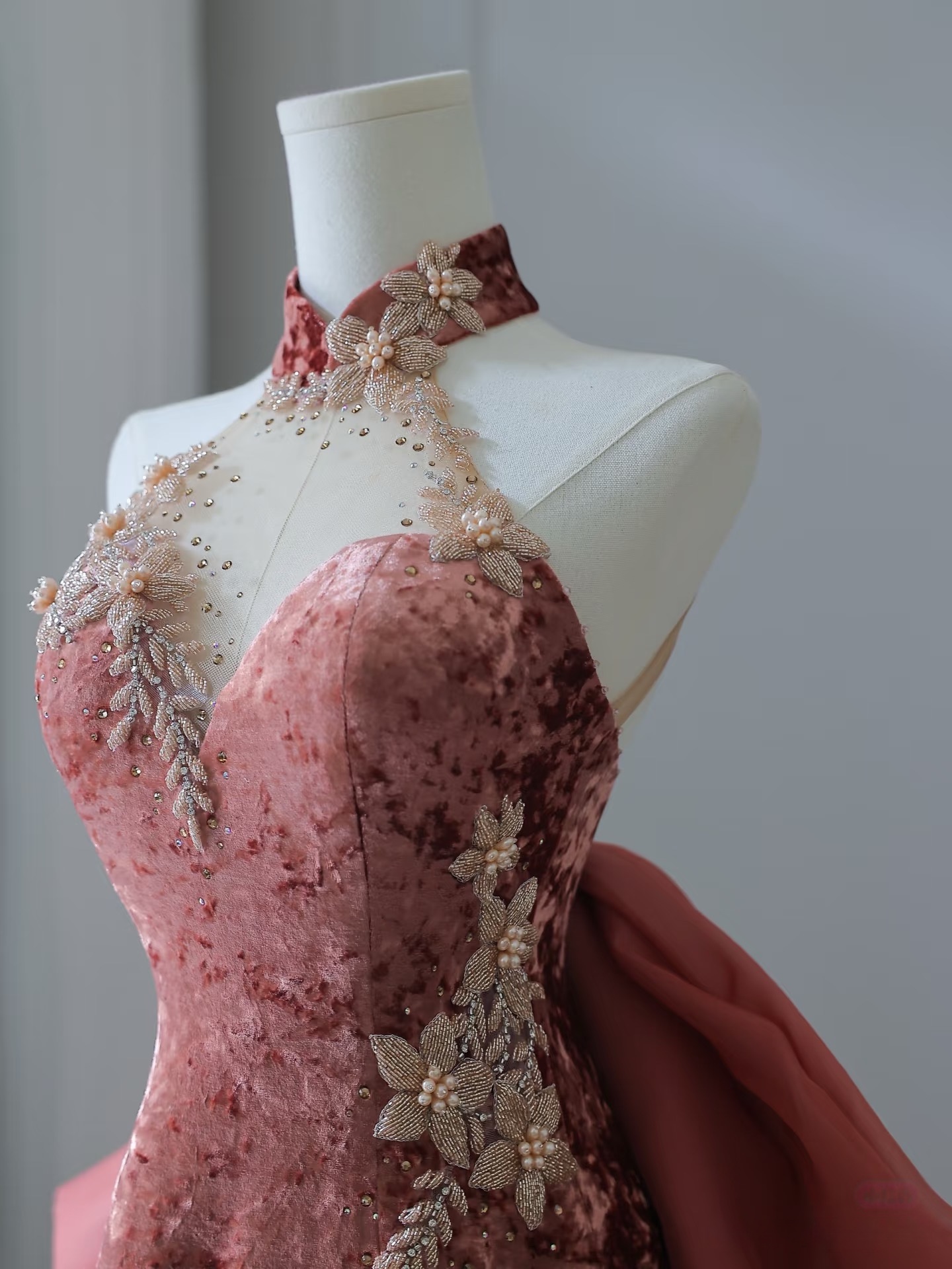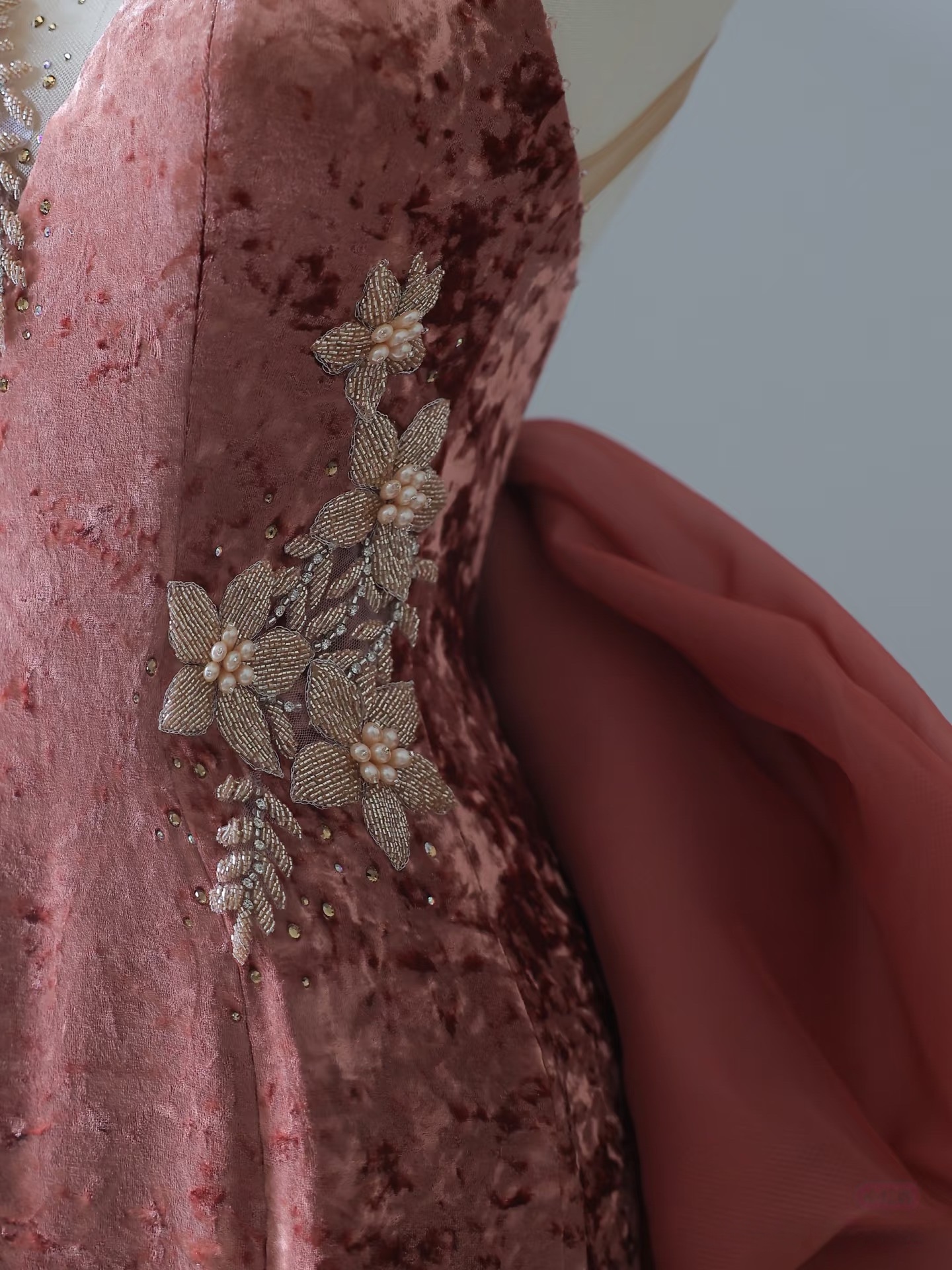 Elegant Dark Peach Mandarin Collar Sheath Printed Velvet Long Prom Dresses Formal Evening Gowns