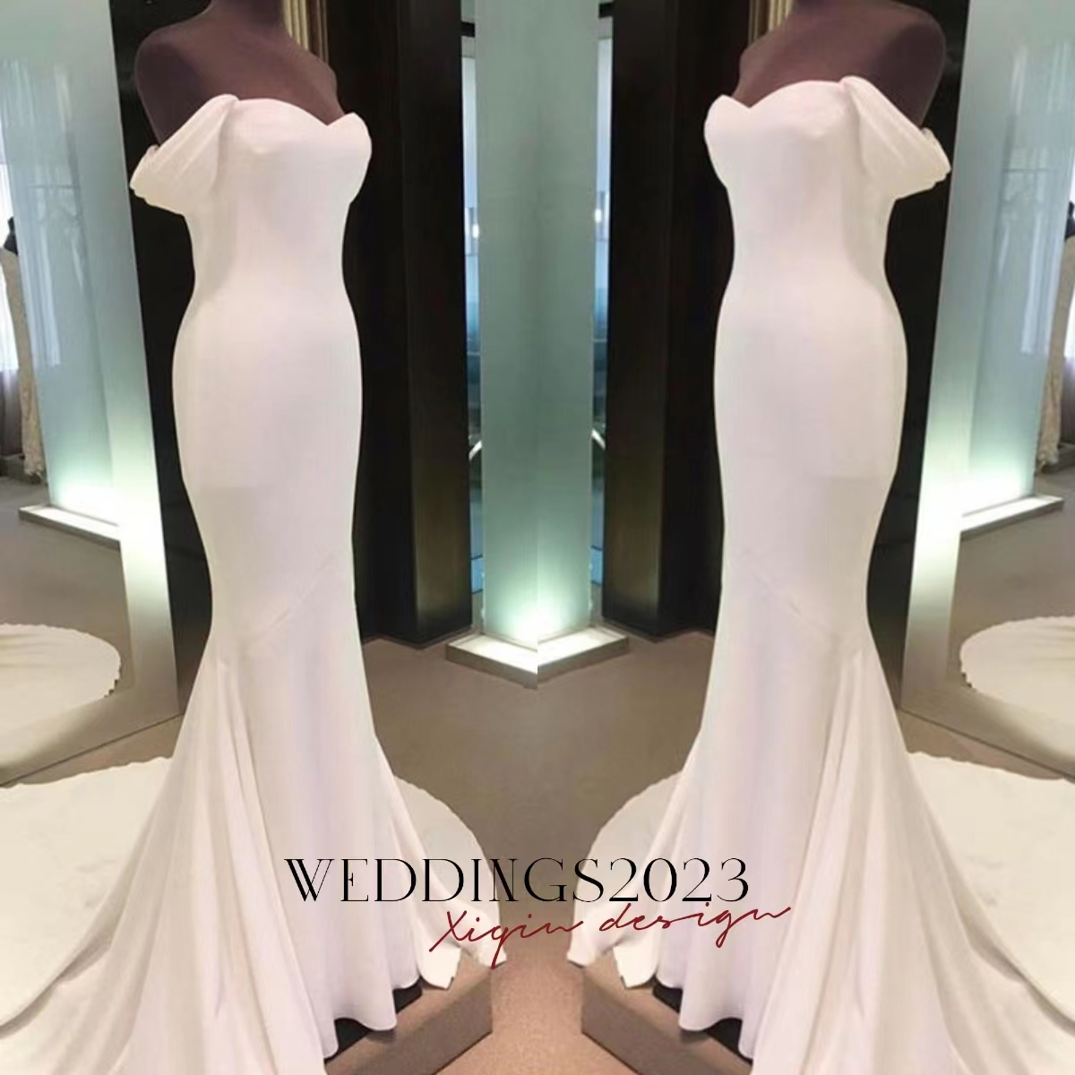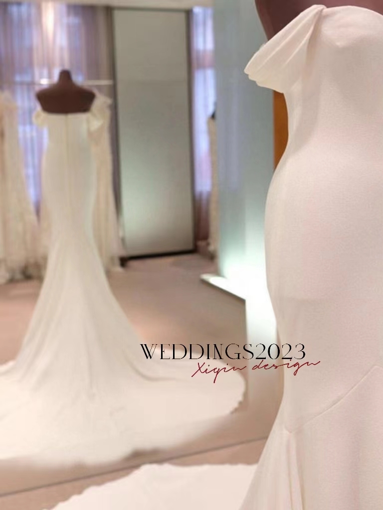 Gorgeous Mermaid Long Off Shoulder Wedding Dresses Satin V-Neck Floor Length Corset Back Sweep Train Bridal Gown for Women W-56011
