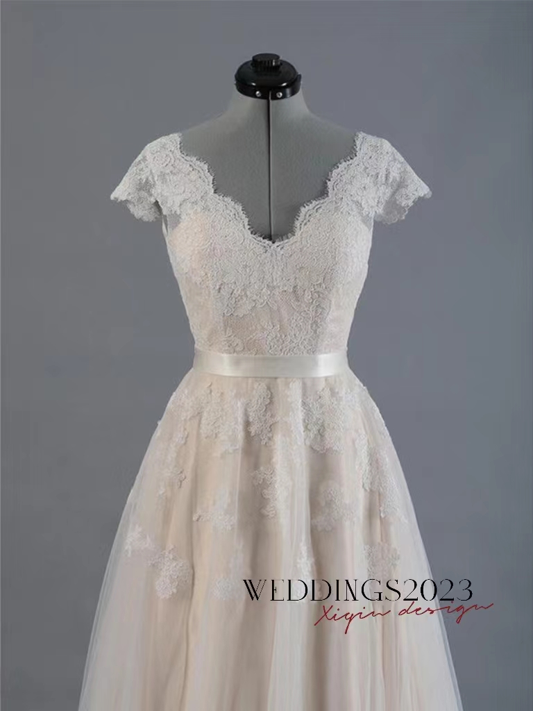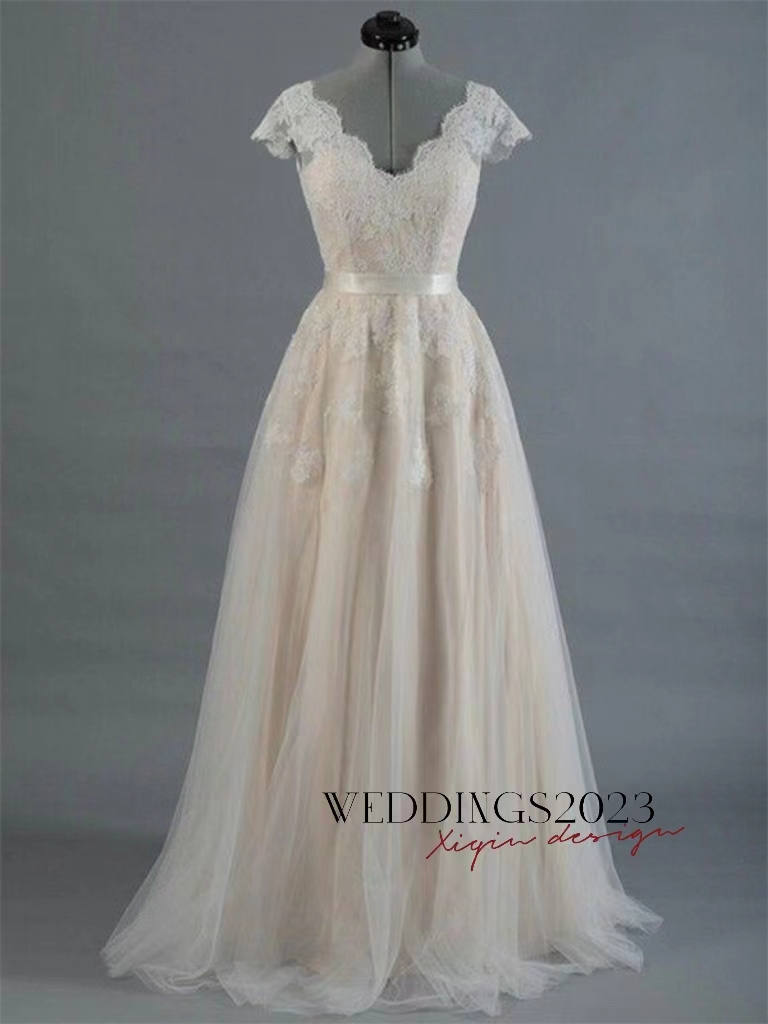 Ready to ship - Beaded wedding dress cap sleeve lace wedding dress boho wedding dress in champagne color, V-back alencon lace W-56013