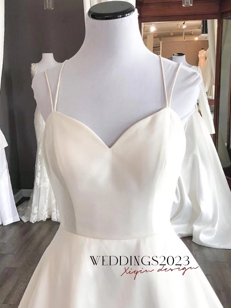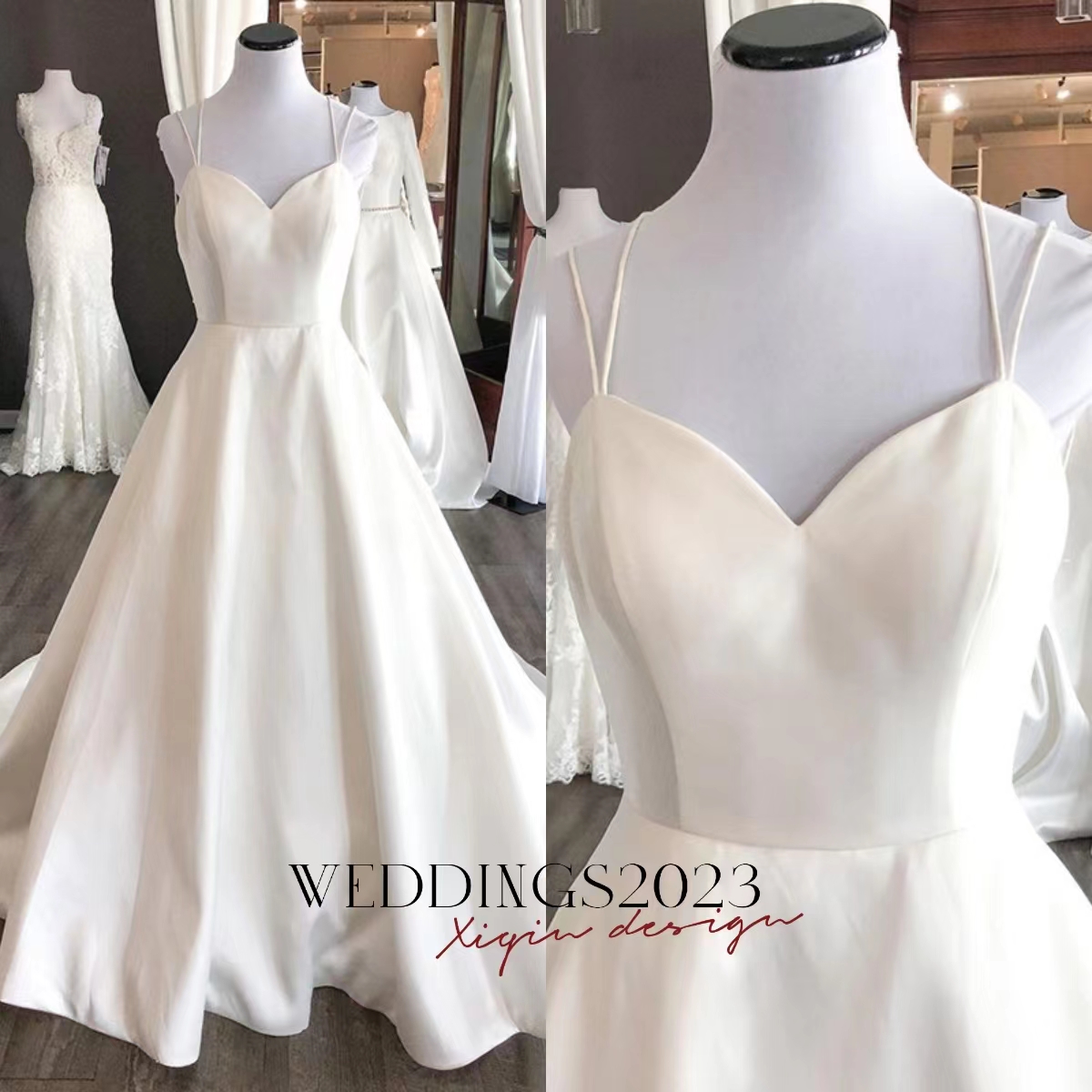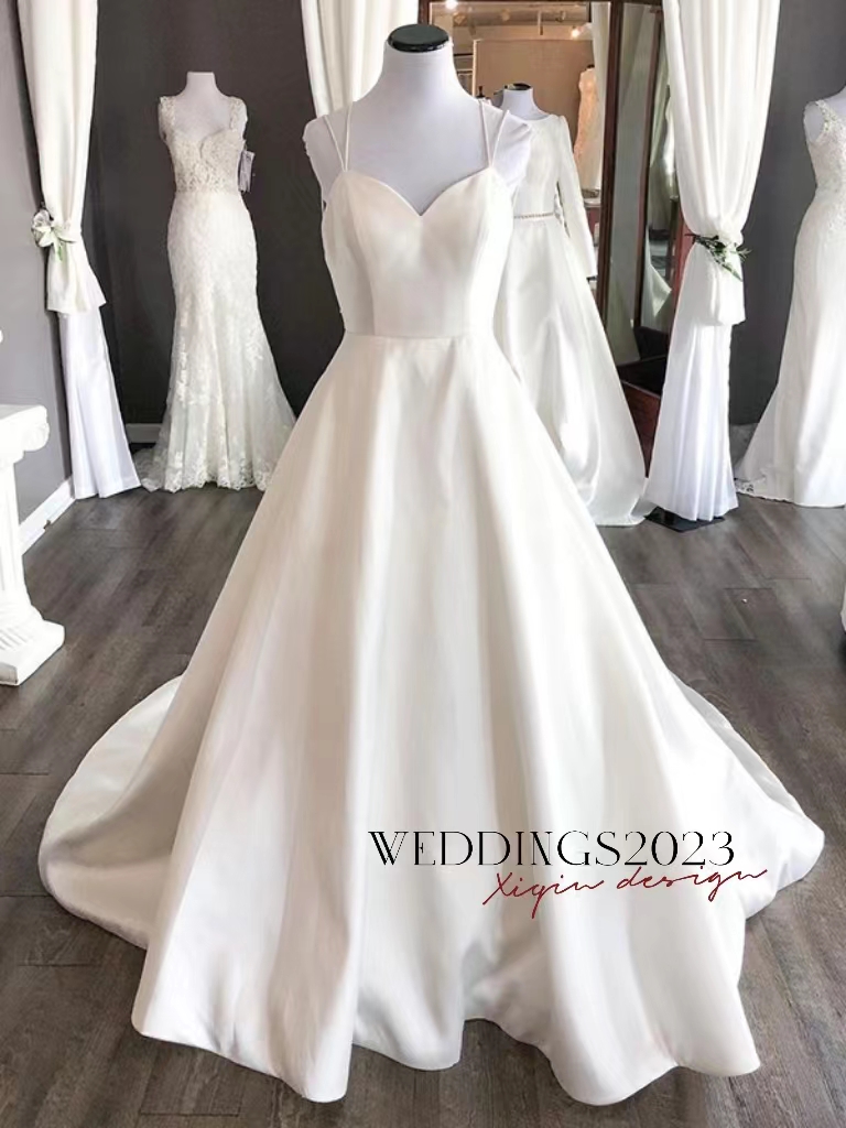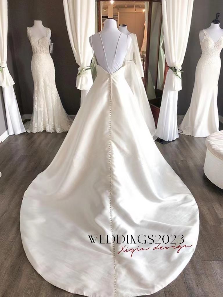 Satin Wedding Dress V-neck Bridal Dress Mikado Fabric Gown A-line Bridal Gown Long Soft Dress Bridal Elegant Dress Pockets Dress W-56017
