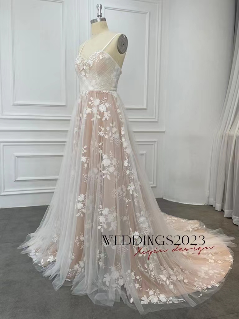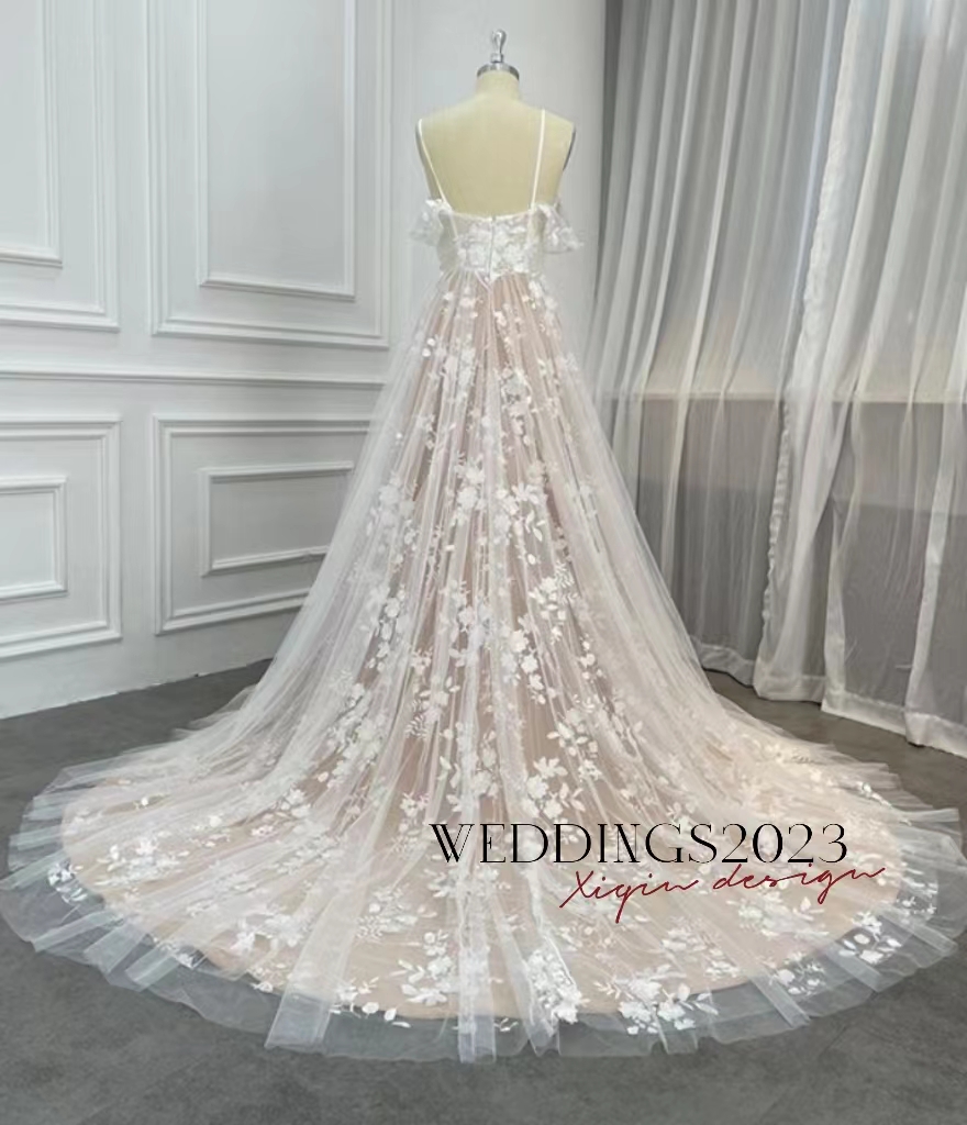 Champagne Wedding Dress Spaghetti Straps Tluue Wedding Dress Detachable shoulder strap Dress W-56018