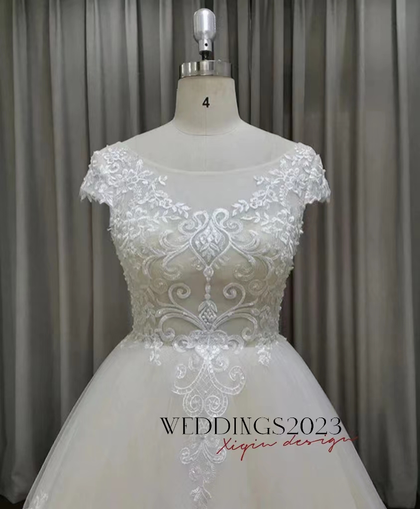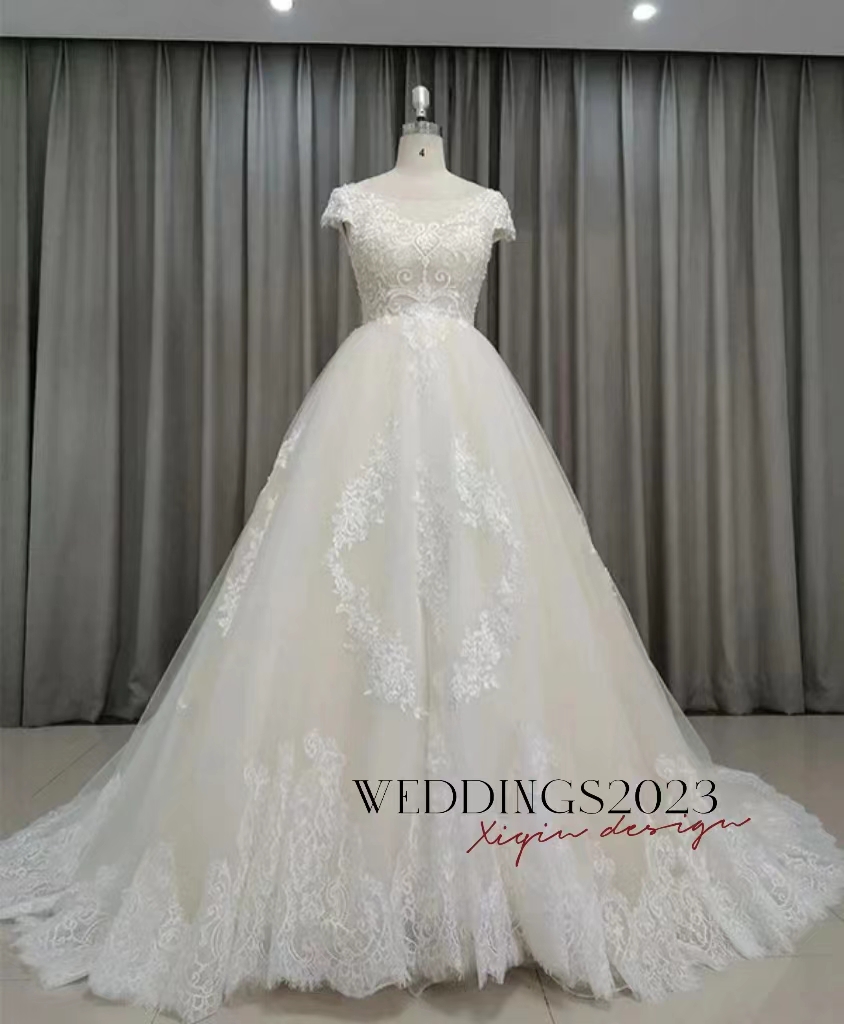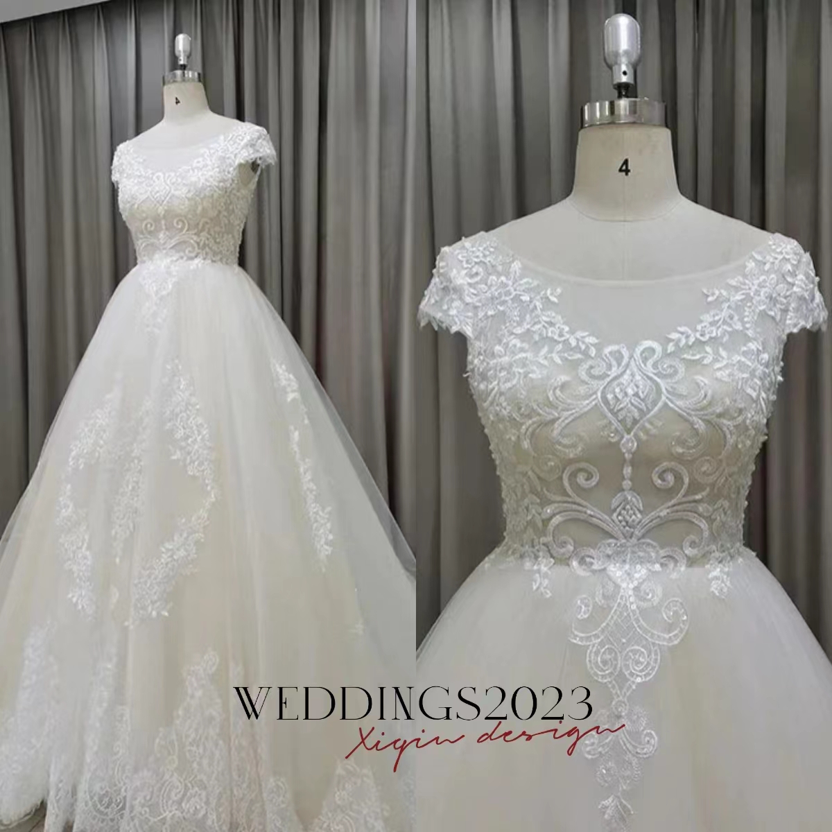 Romantic Bohemian Wedding Dress Scallop Neckline Outdoor Wedding dress High Fashion Lace Weddin Dress With Silver Skirt and Capsleeves W-56023